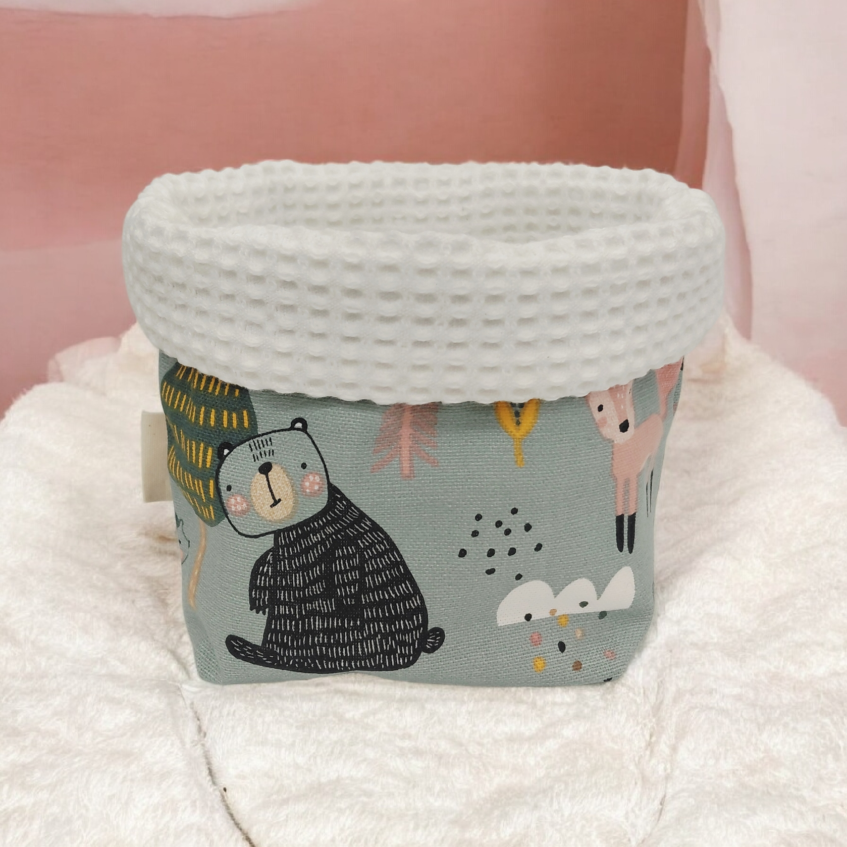 Craquez pour ce panier à lingettes réversible, confectionné avec soin à partir de toile de coton certifié Oeko-Tex et d’éponge nid d’abeille ultra-absorbante. Son adorable motif animaux de la fôret apporte une touche douce et naturelle à votre salle de bain ou à la chambre de bébé.