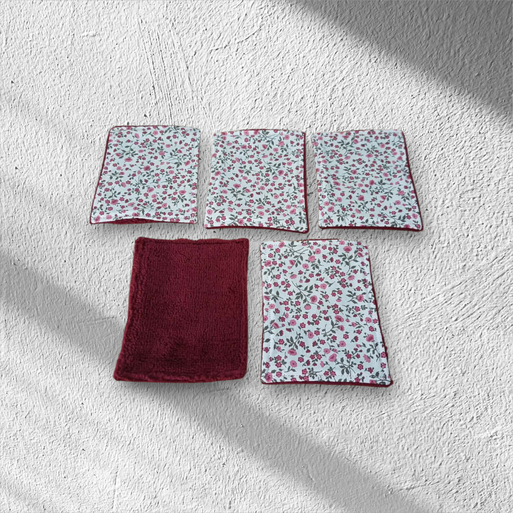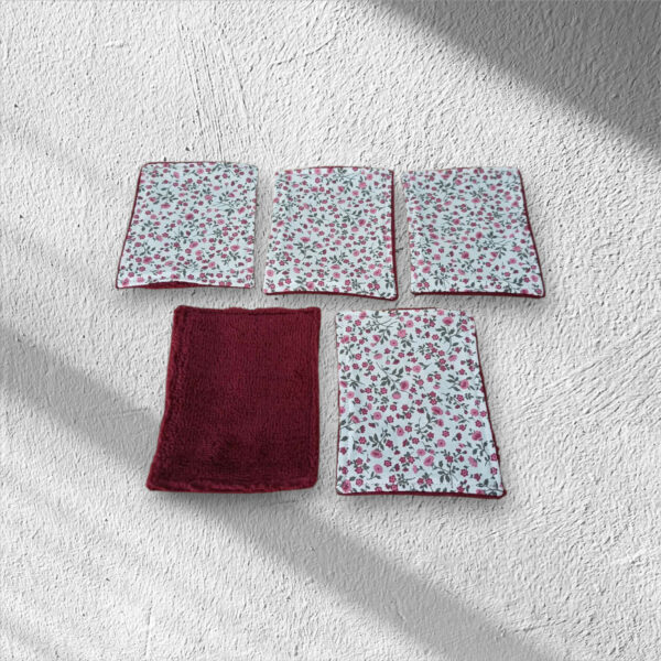 Vendu par lot de 5 feuilles, une face en tissu certifié OEKOTEX et l’autre en coton éponge bambou très douce pour le contact avec la peau et résistante aux lavages.