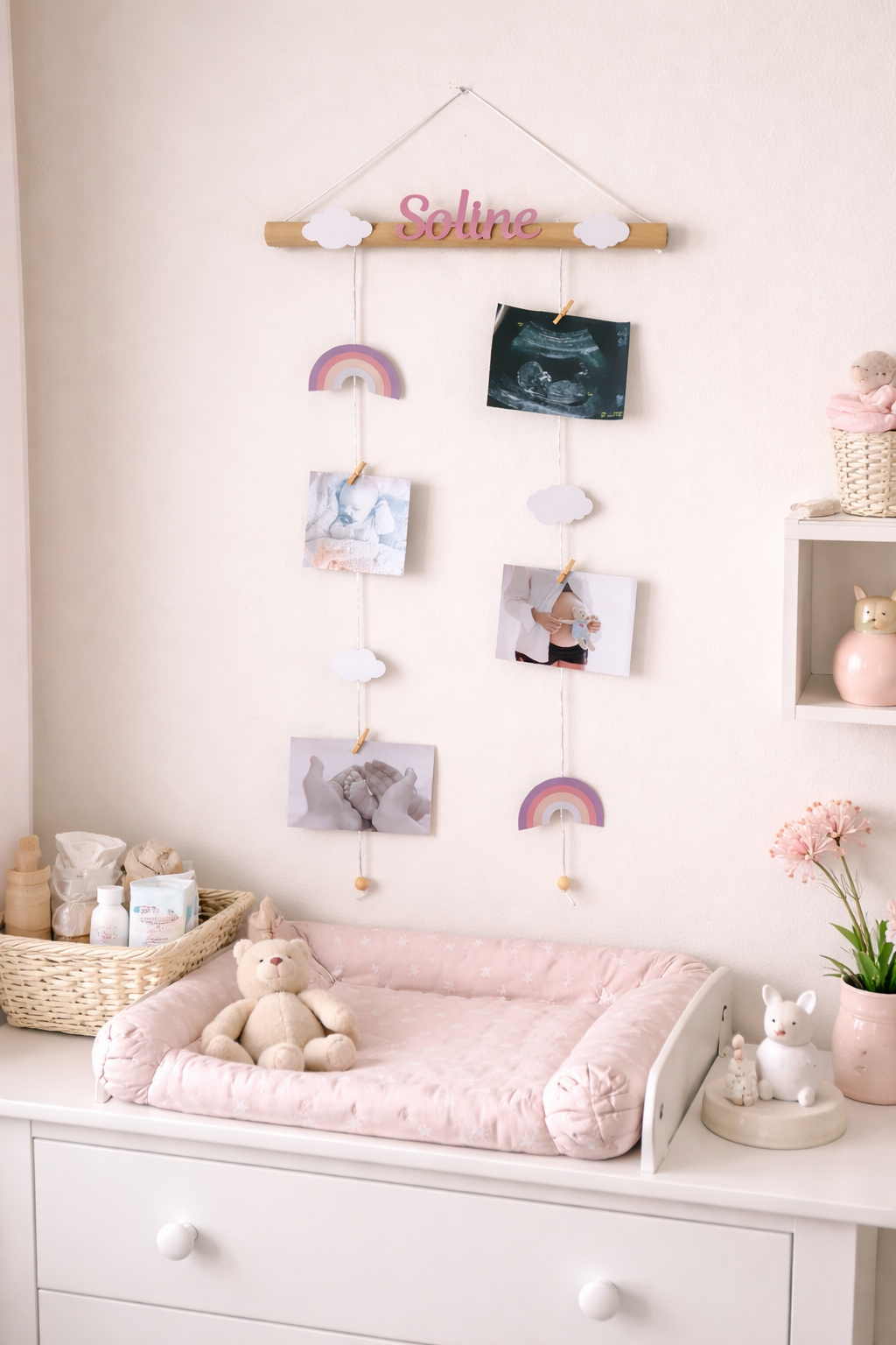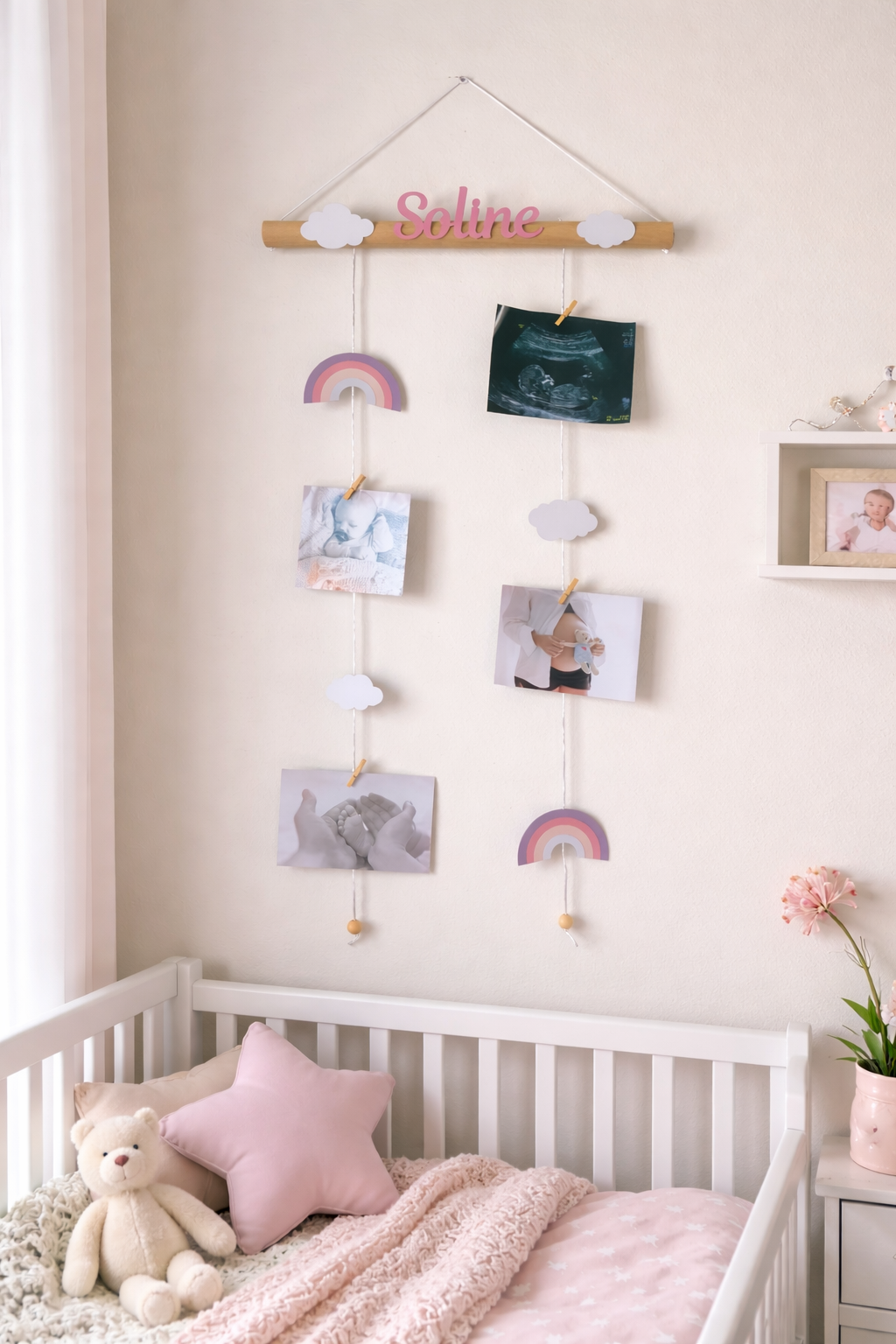 Ce pêle mêle sera parfait pour accrocher les photos prises avec les cartes étapes pour garder un souvenir des premières années de votre bébé ou lors d’une baby shower ou d’un baptême sur le thème Arc en ciel.