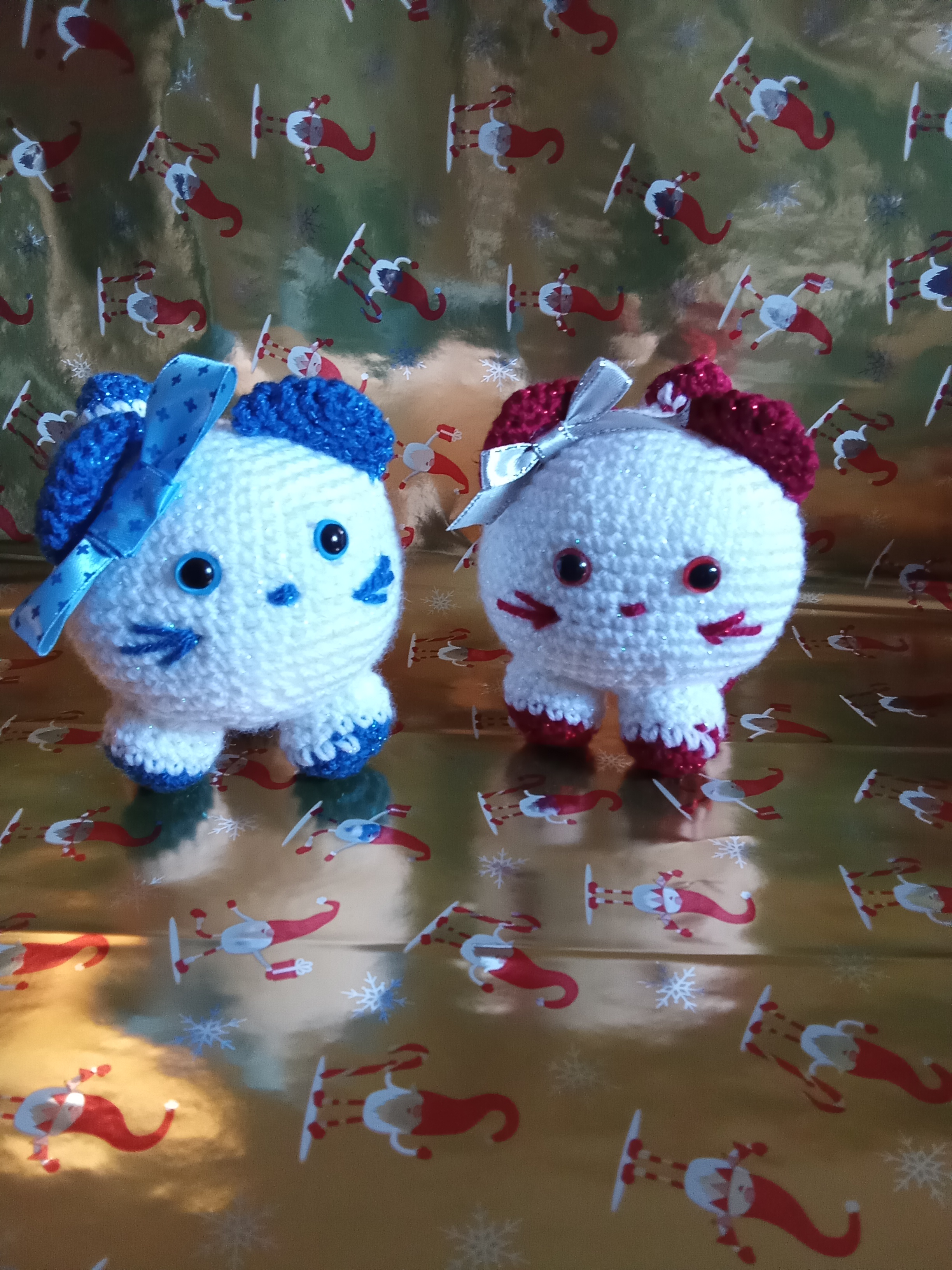Petit chat boule crocheté à la main avec de la laine métallisée 2 couleurs ( Blanc/bleu et Blanc/rouge).