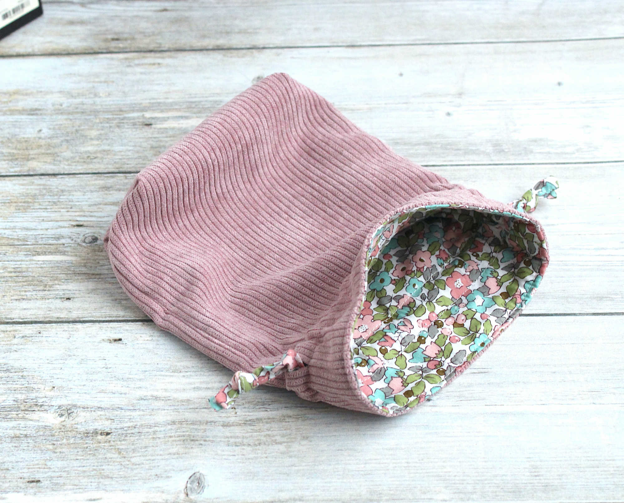 Confectionnée en velours côtelé vieux rose et doublée en coton style liberty.