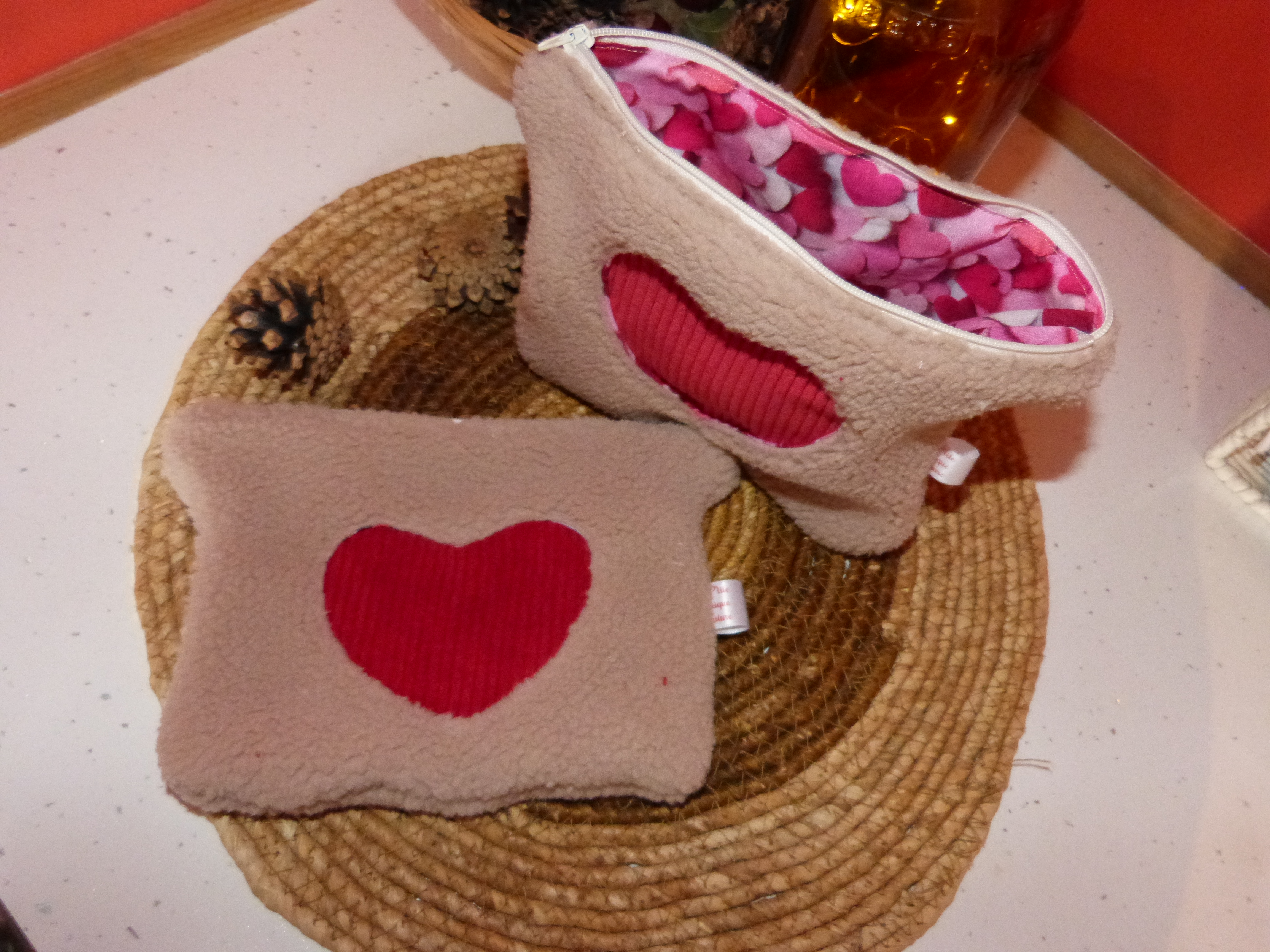 Petite pochette e”Collection Valentine” en bouclette avec motif cœur en velours.