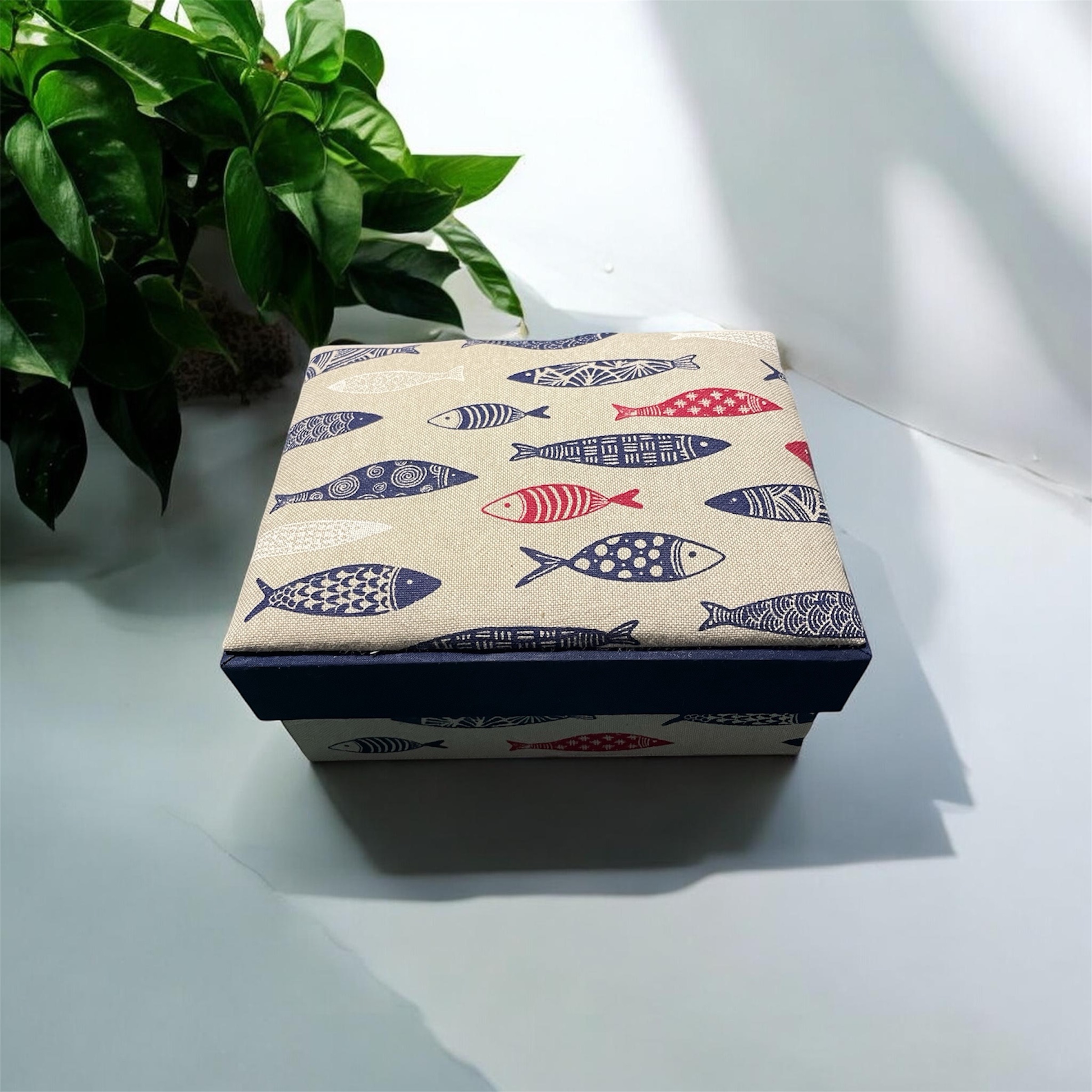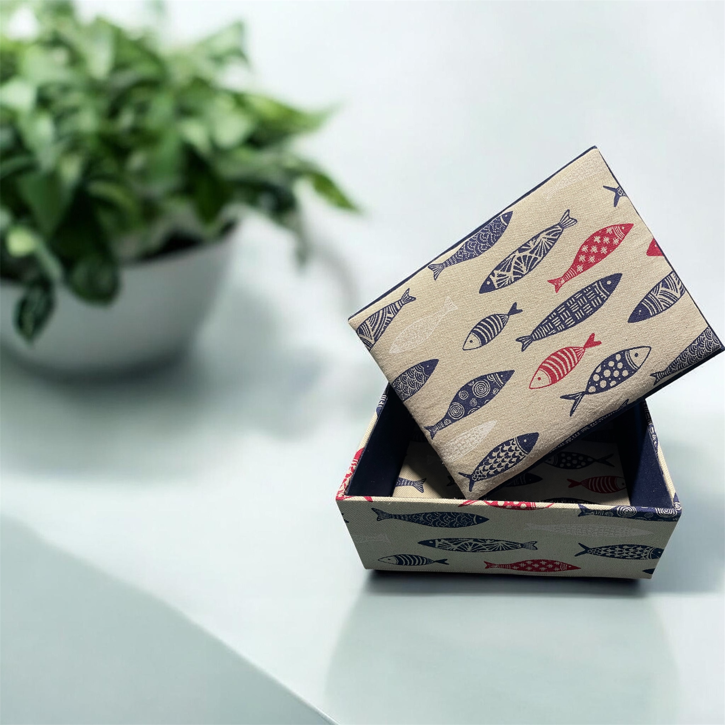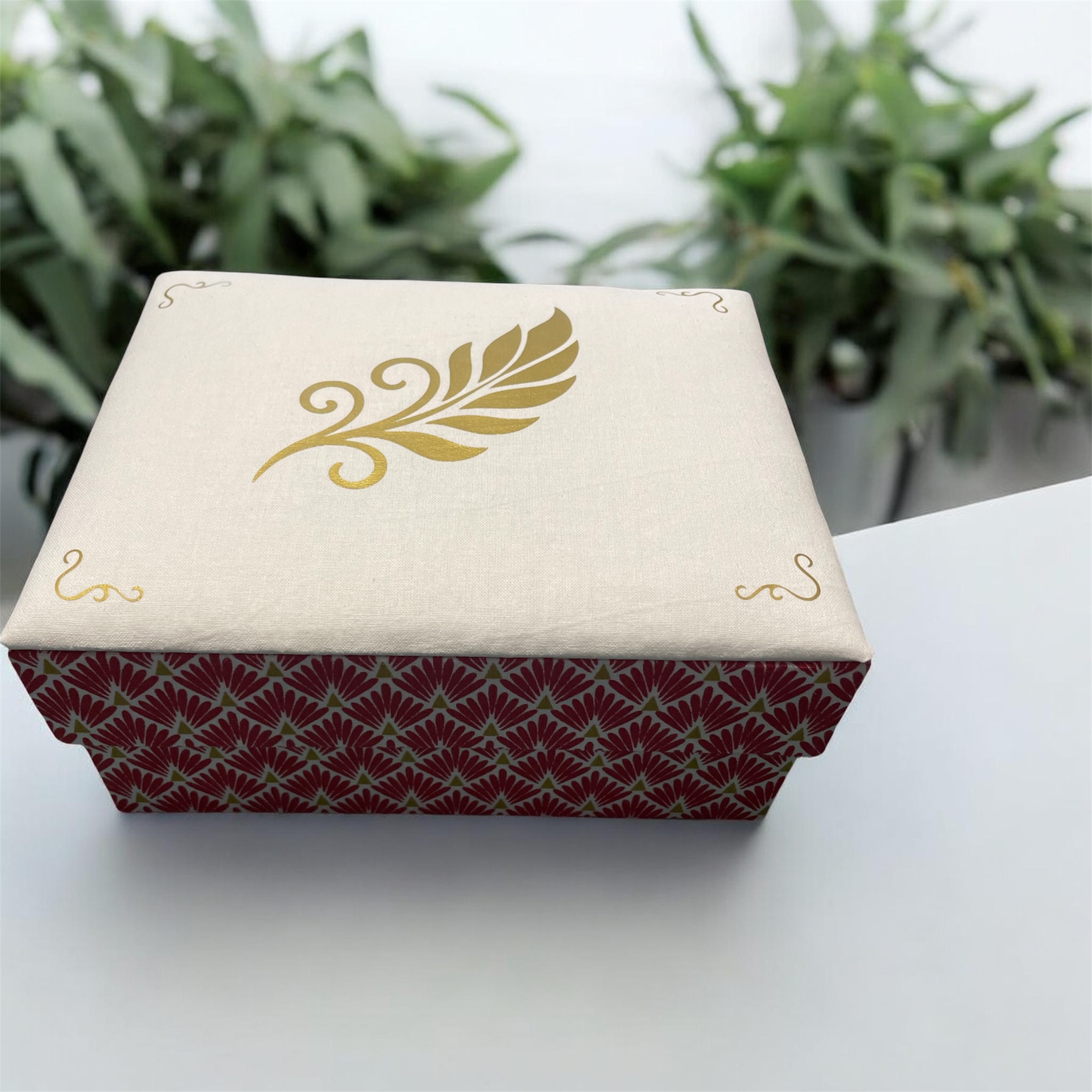 Habillée d’un tissu raffiné et d’un couvercle en tissu naturel brodé, cette boîte est à la fois pratique et décorative