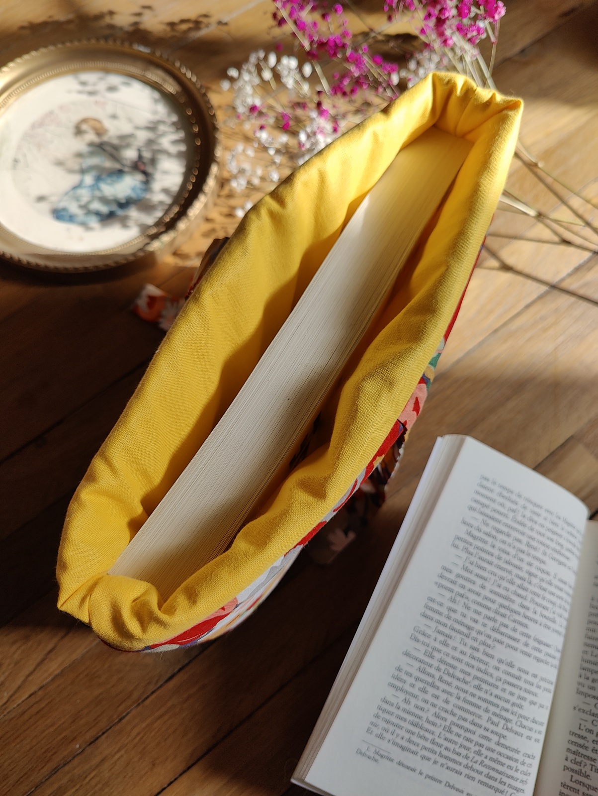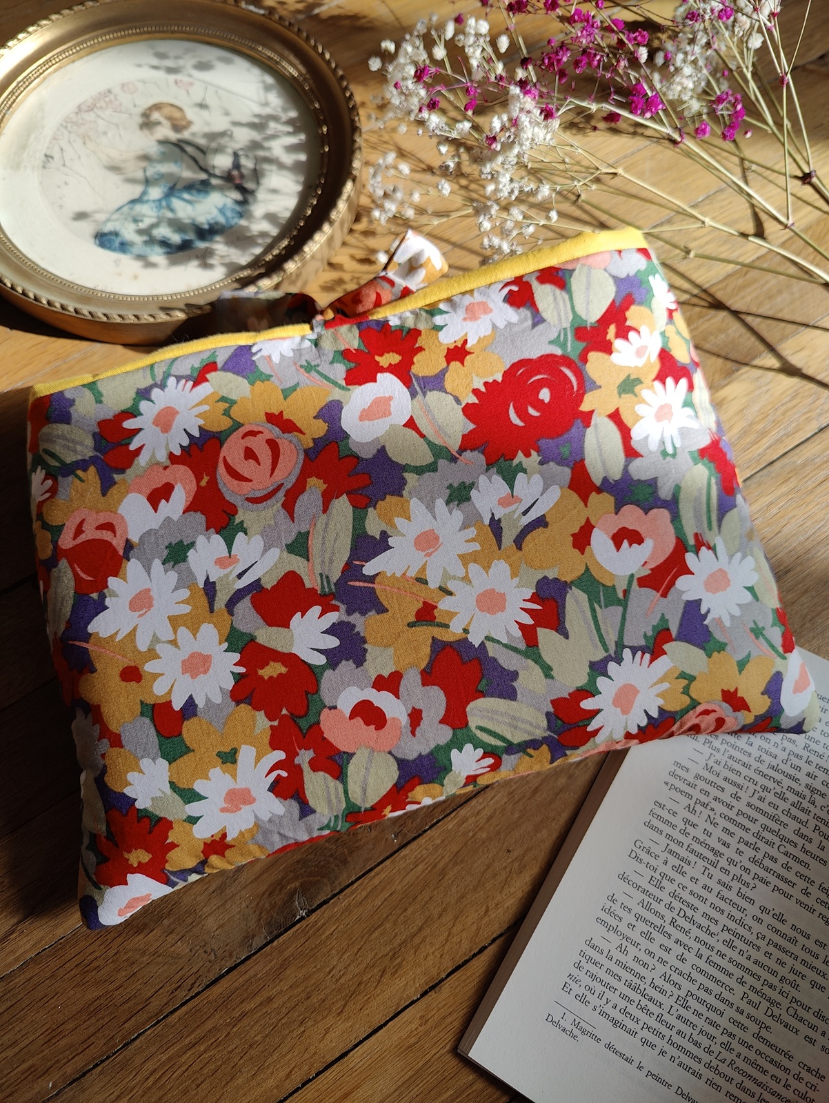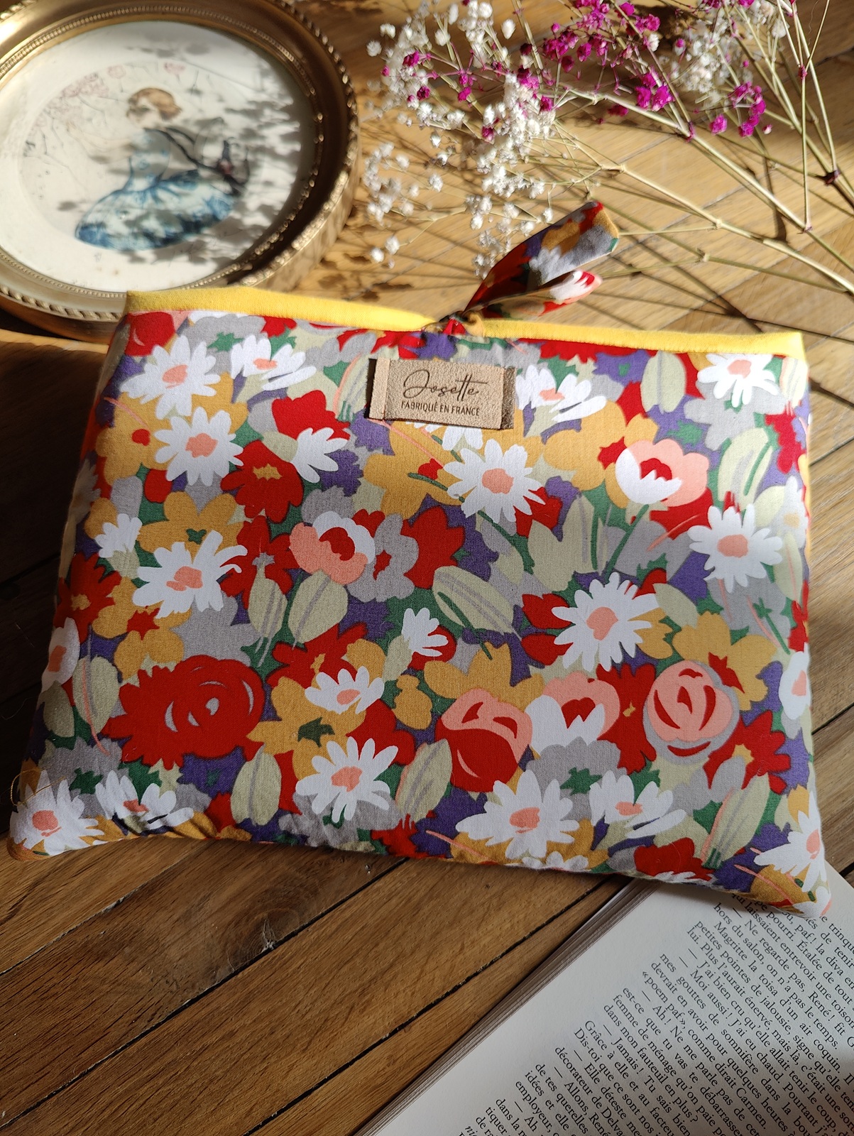 Pochette pour livre broché en tissu de seconde main à motifs floraux colorés. Un vrai jardin printanier floral : des fleurs blanches, rouges, jaunes, violettes. Sa fermeture se fait par nœud fluide. Intérieur en tissu jaune uni.