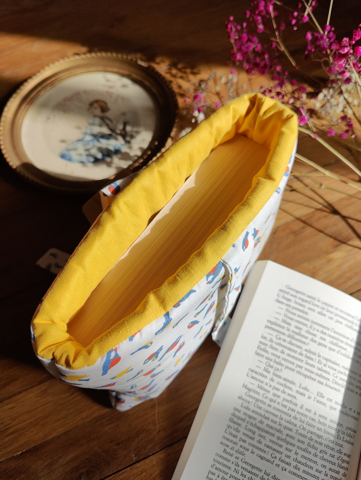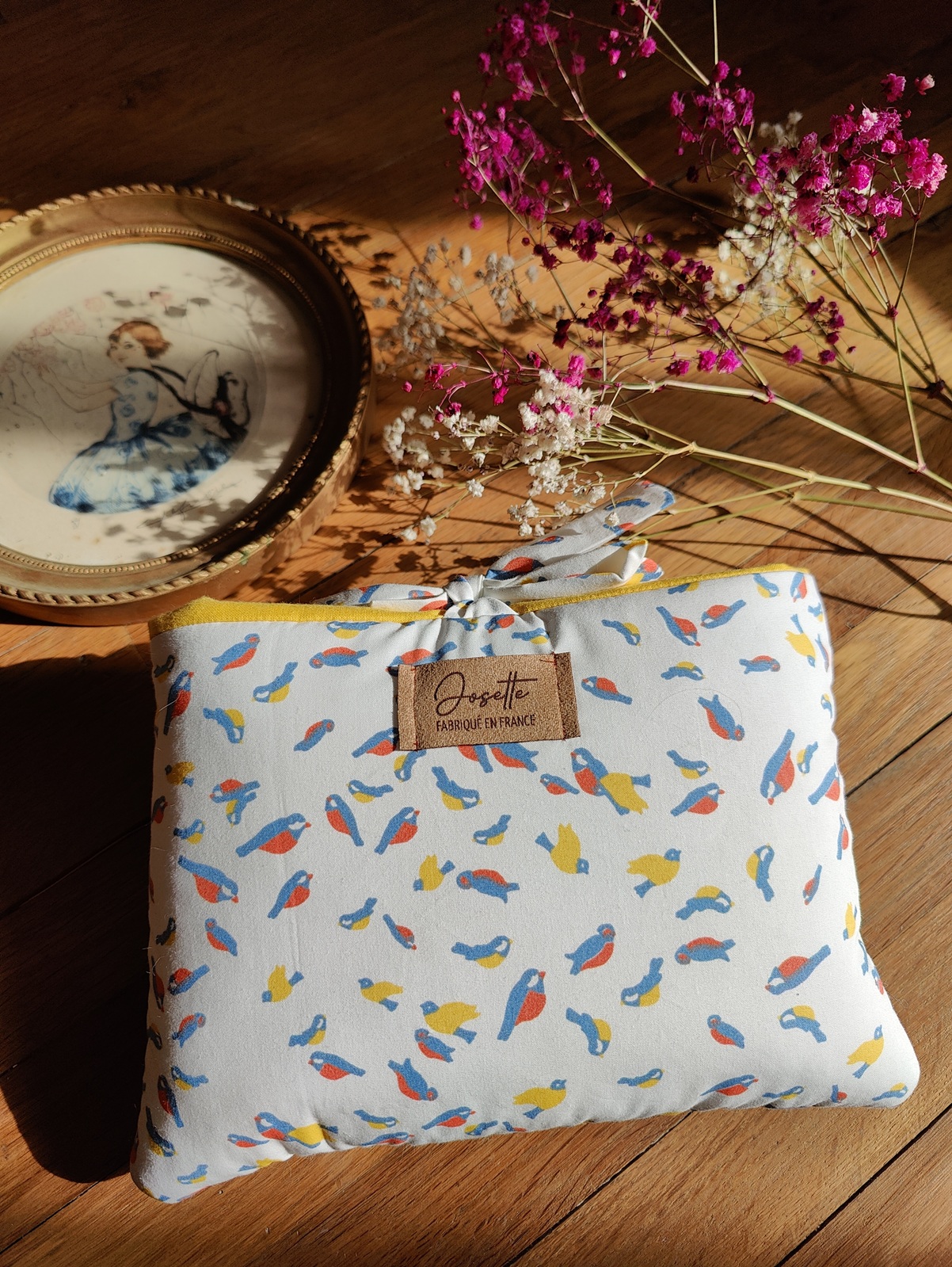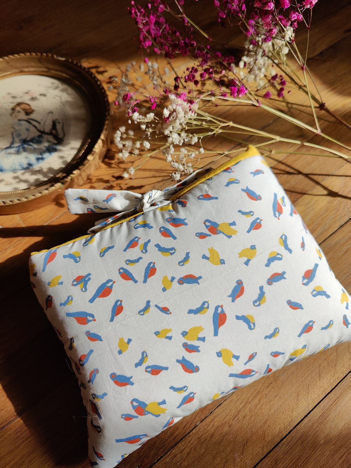 Pochette pour livre au format poche en tissu blanc à motifs d’oiseaux colorés (bleu, jaune et rouge). La fermeture se fait par un nœud en tissu fluide. L’intérieur est doublé d’un tissu uni jaune qui match parfaitement avec les oiseaux.