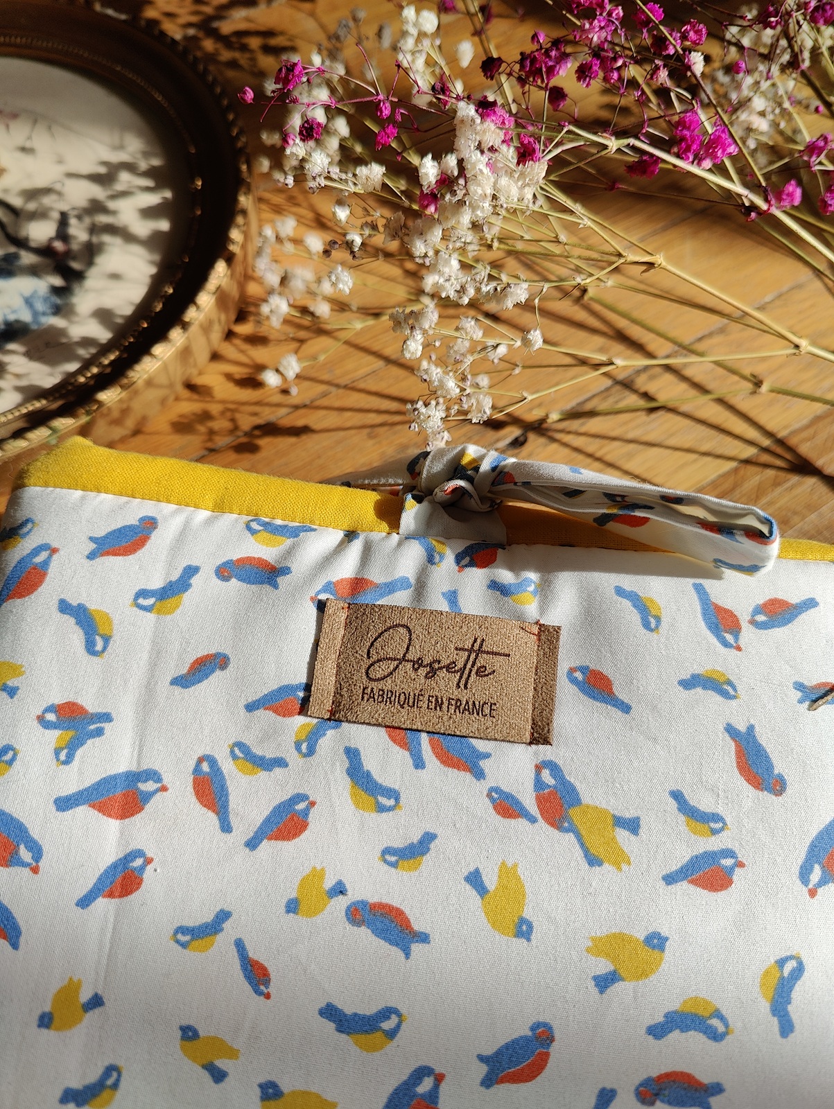 • Tissus : Extérieur à motifs d’oiseaux colorés, intérieur en tissu uni jaune