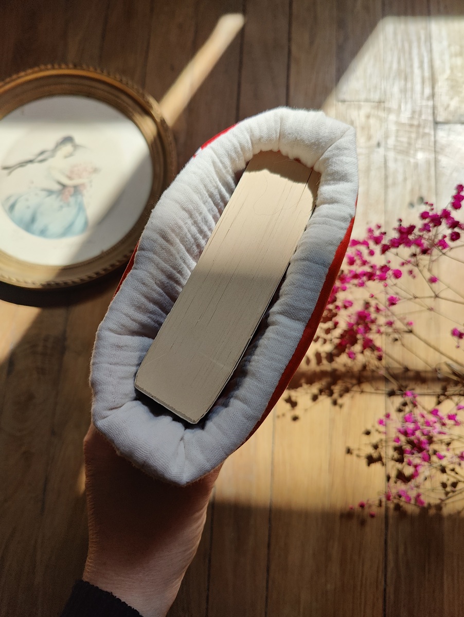 Fabriquée à partir de tissus de seconde main, cette pochette est légère et unique. Elle est conçue pour celles et ceux qui veulent transporter leurs livres en toute simplicité, sans accessoires inutiles.