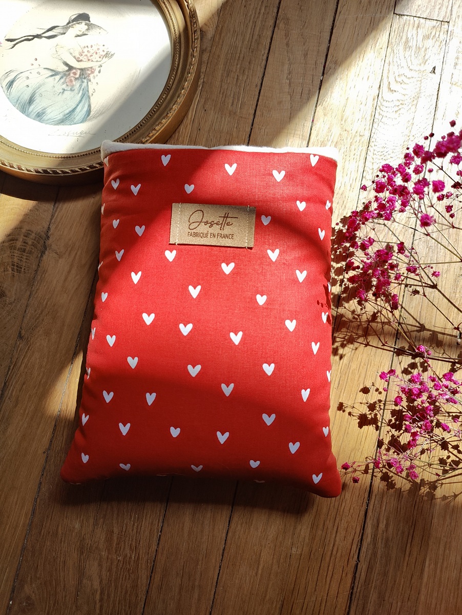 Vous glissez votre livre de poche dans cette pochette en tissu rouge à petits cœurs blancs. Ses dimensions (17 x 22 cm) sont adaptées pour protéger votre livre sans l’encombrer. Le tissu extérieur avec ses petits cœurs blancs apporte toute la douceur dont vous avez besoin ce jour, et l’intérieur, blanc, assure une protection supplémentaire avec la ouatine neuve de 20 mm.