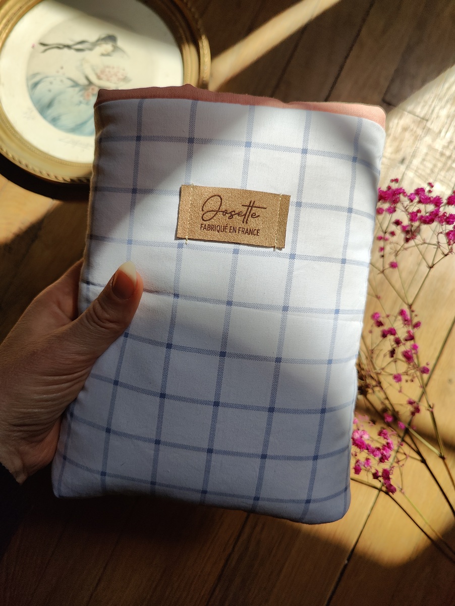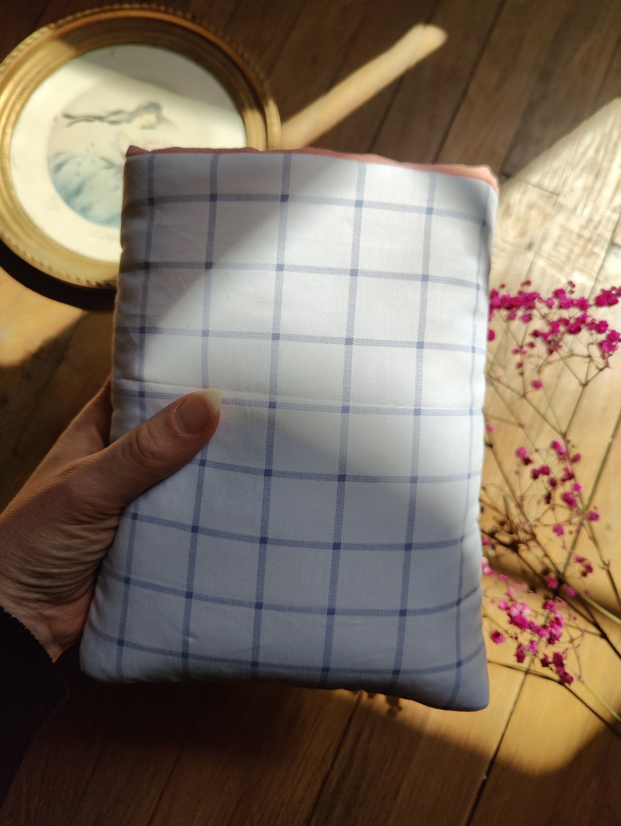 Ce matin, en partant au travail, vous glissez votre livre préféré dans cette pochette en tissu à carreaux bleu pâle et blanc, et vous l’emportez avec vous dans les transports. Ses dimensions (17 x 22 cm) sont idéales pour les livres de poche, et son design épuré, sans nœud, permet un accès rapide et facile. L’intérieur en tissu saumon apporte une touche de douceur et de contraste, tout en protégeant votre livre.