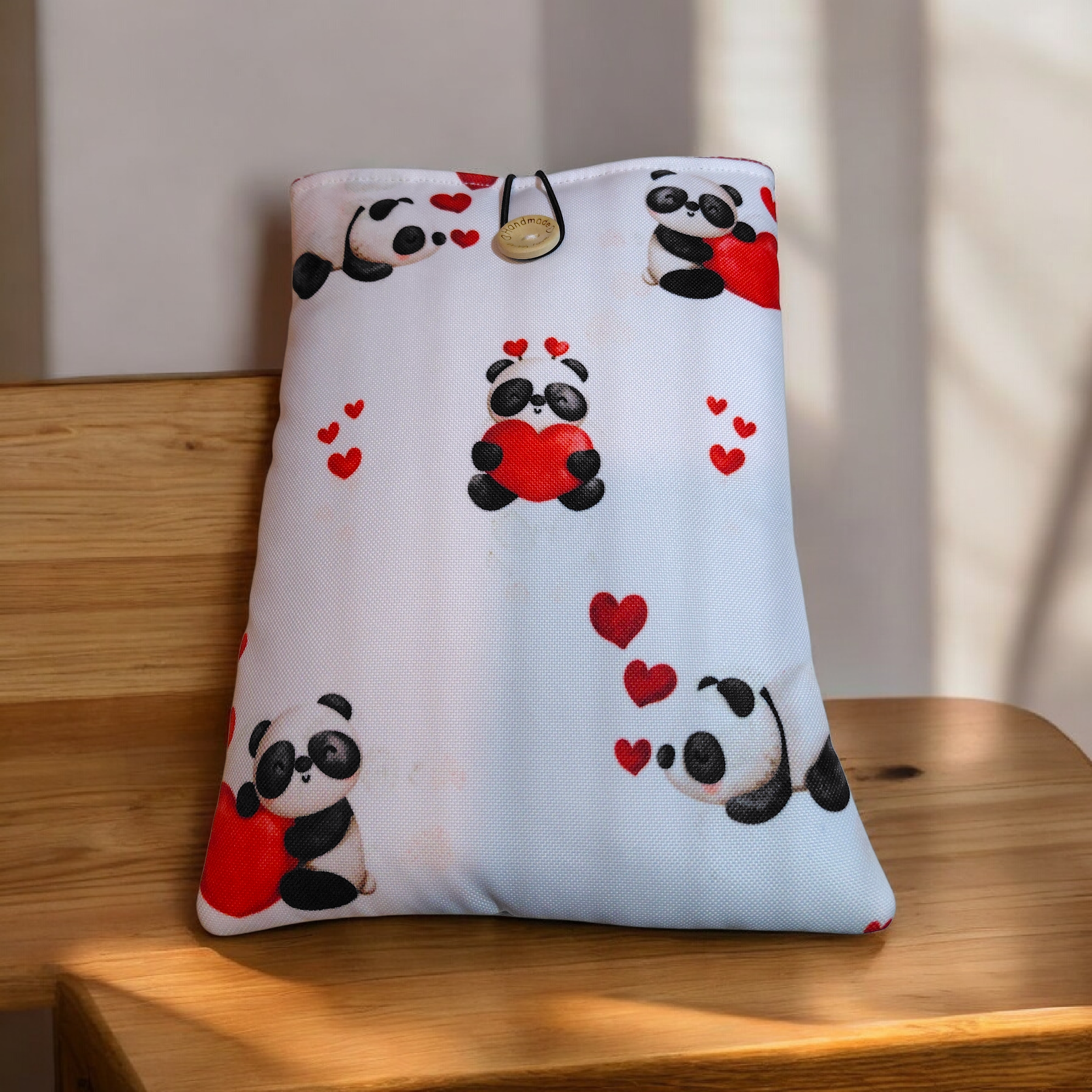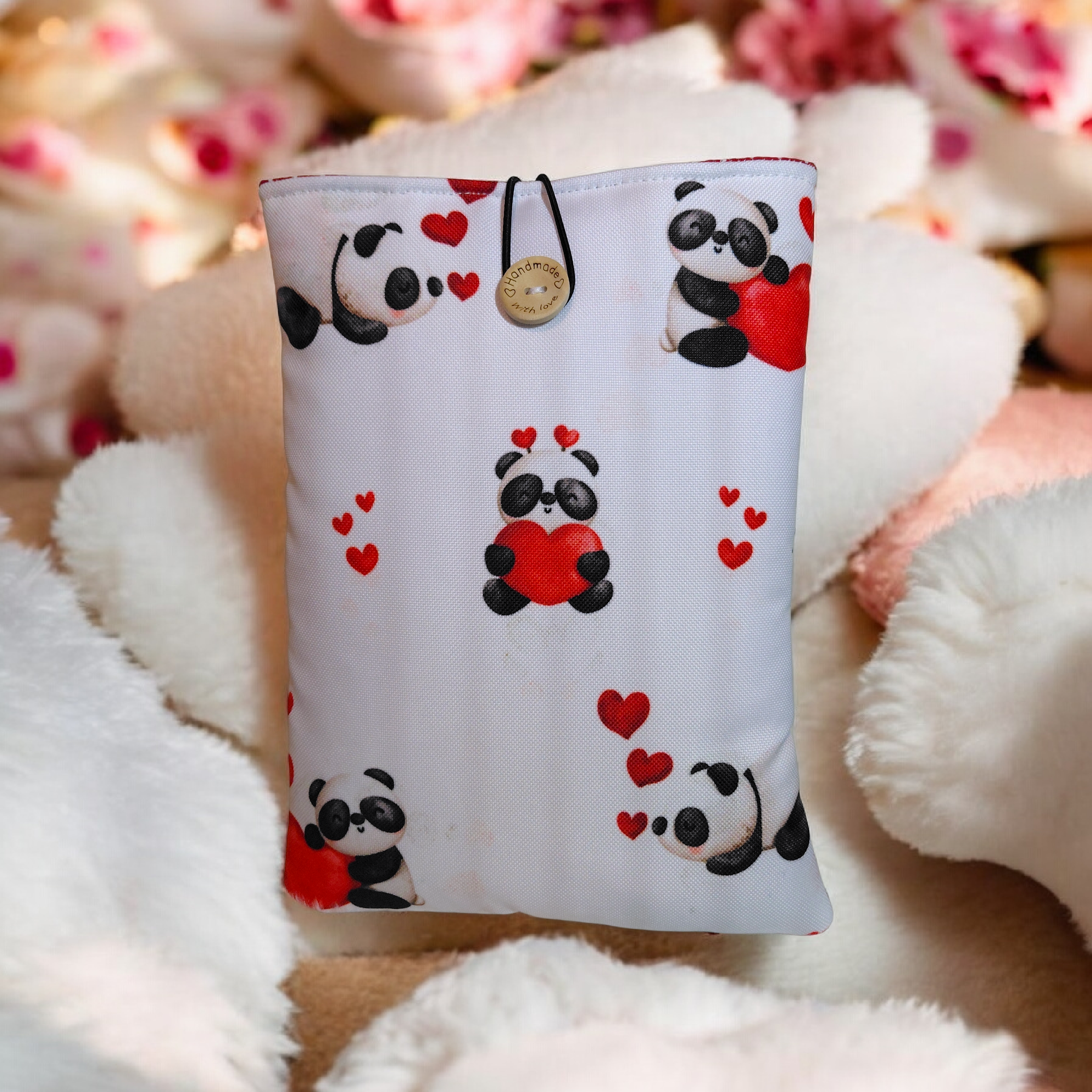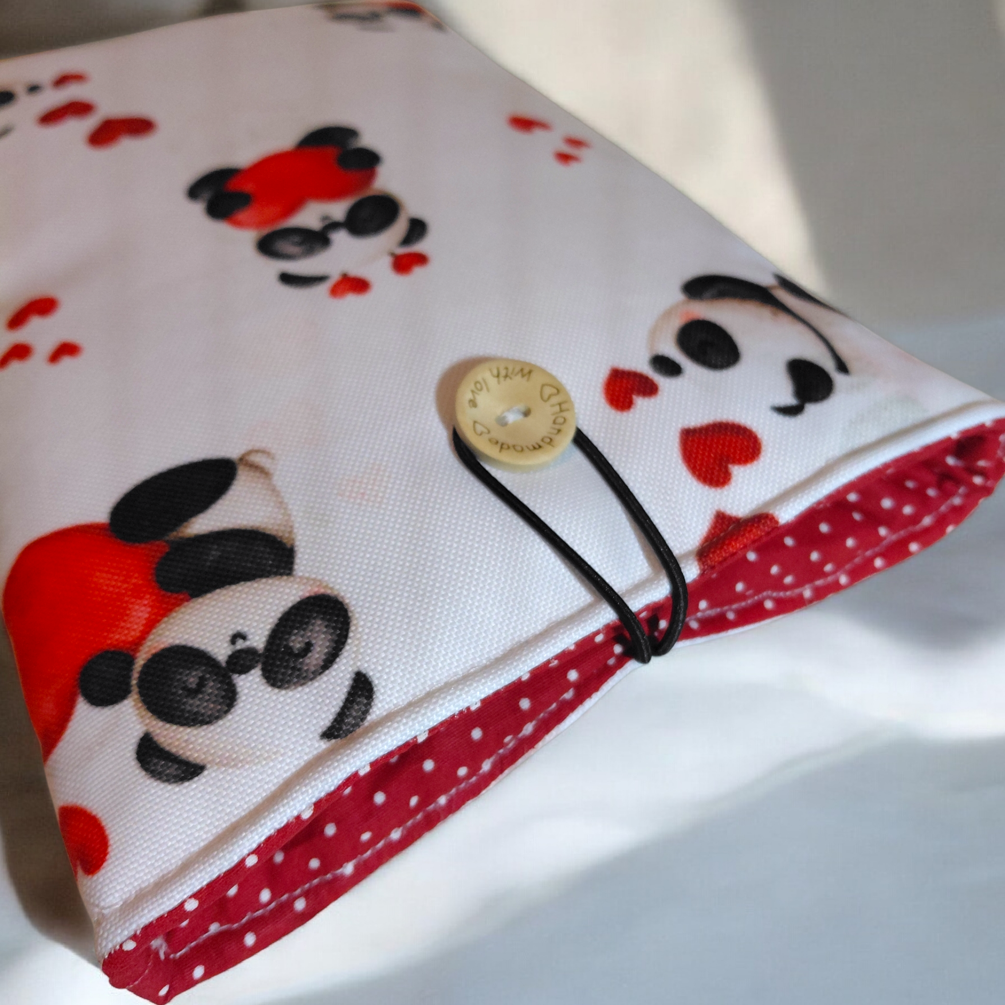 Cette pochette à livres, liseuse et tablette est entièrement faite main, conçue dans un tissu imperméable orné d’adorables pandas entourés de petits cœurs, symbole de tendresse et d’amour.