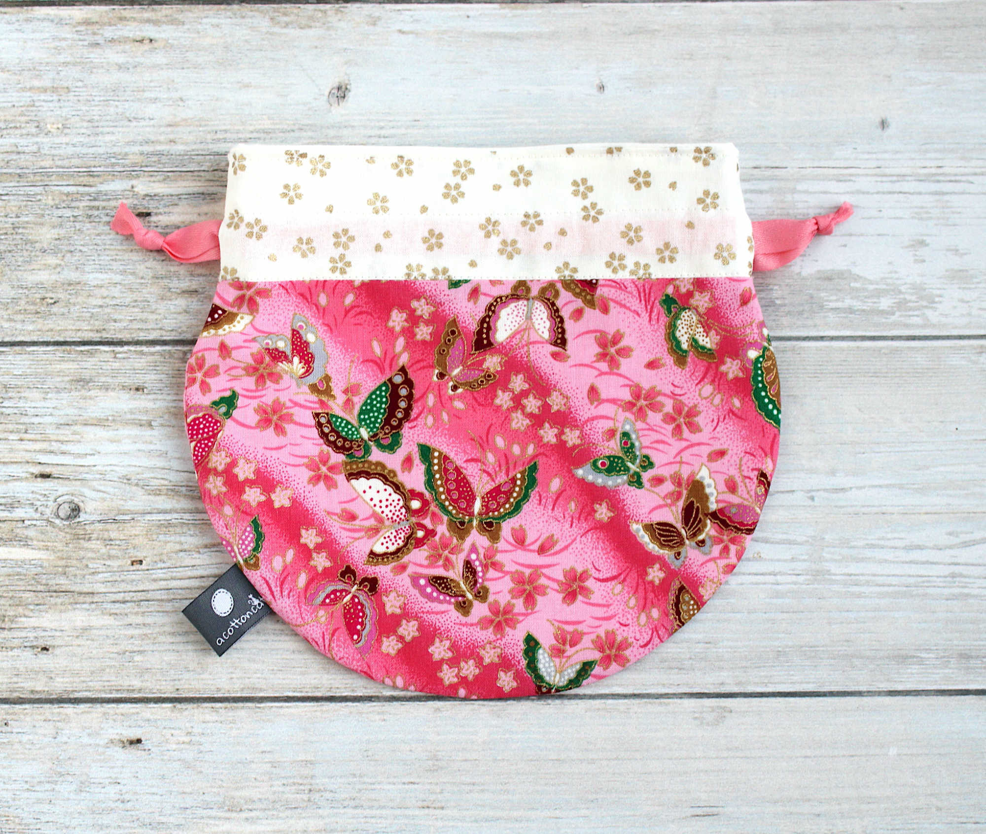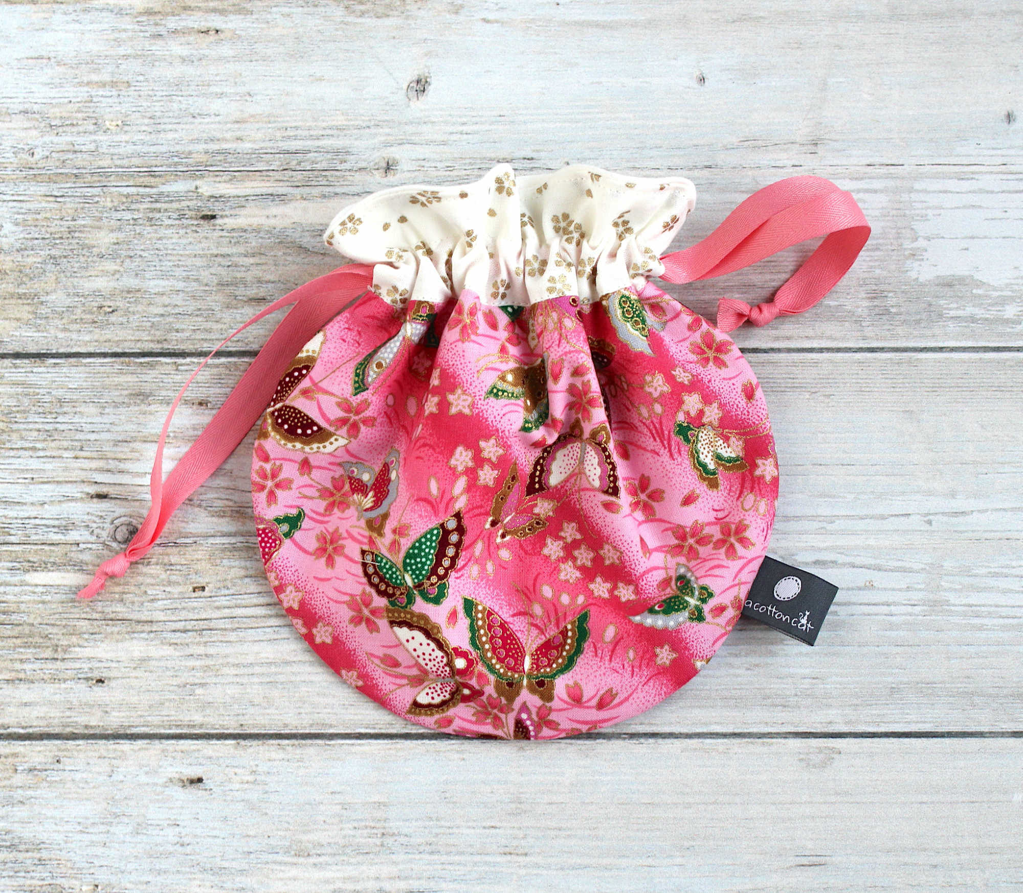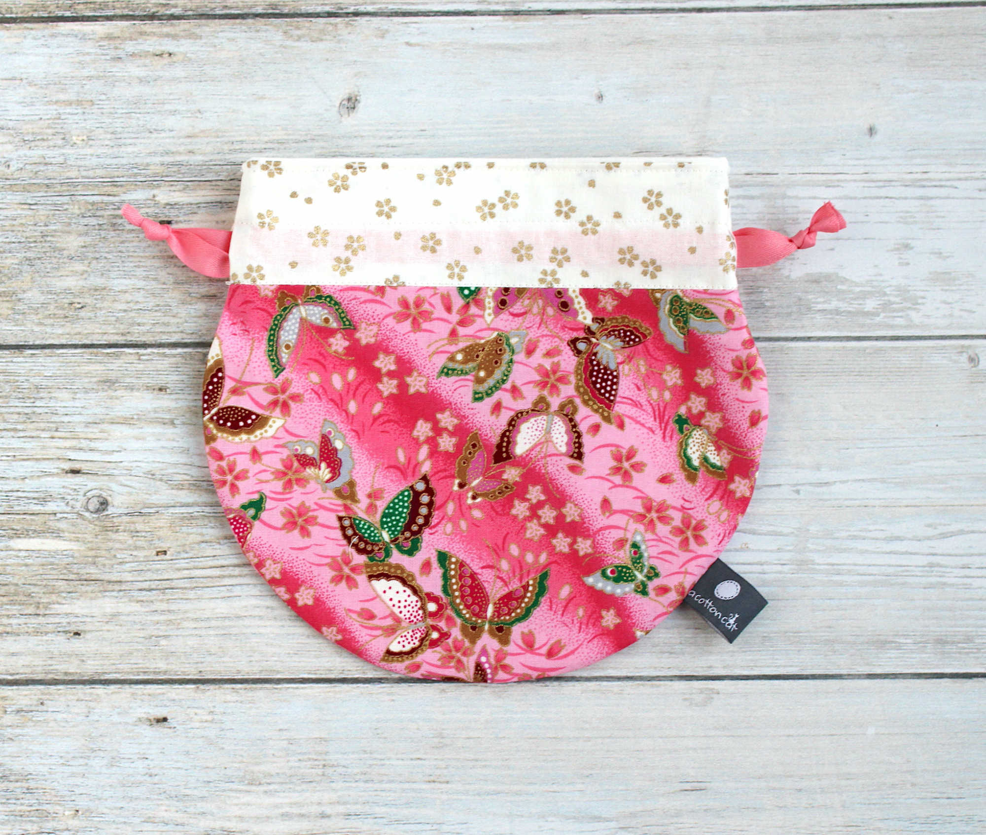 Pochette japonaise ronde en coton japonais à motifs papillons sur fond rose. Les deux faces sont combinées avec un coton à motif traditionnel japonais doré.