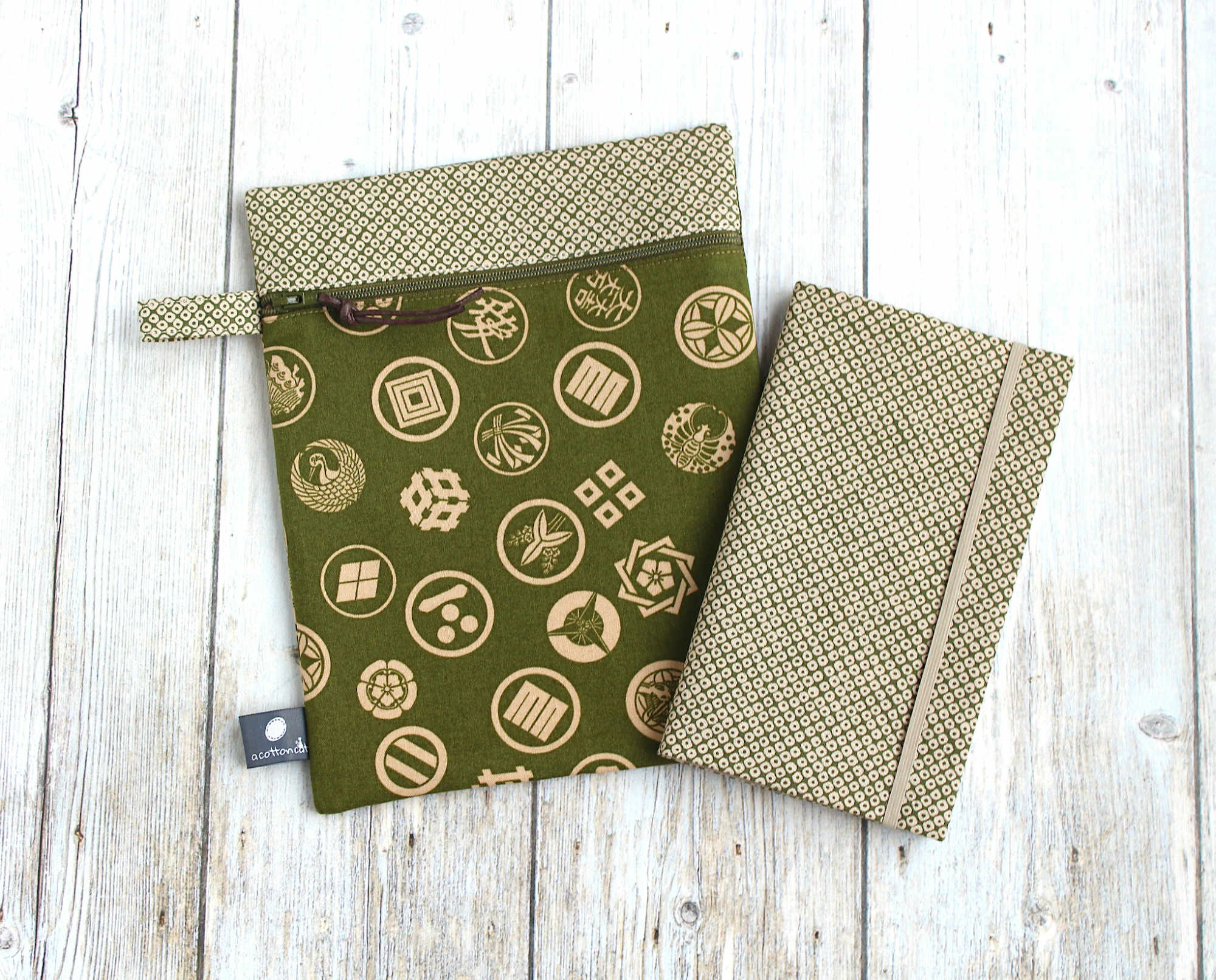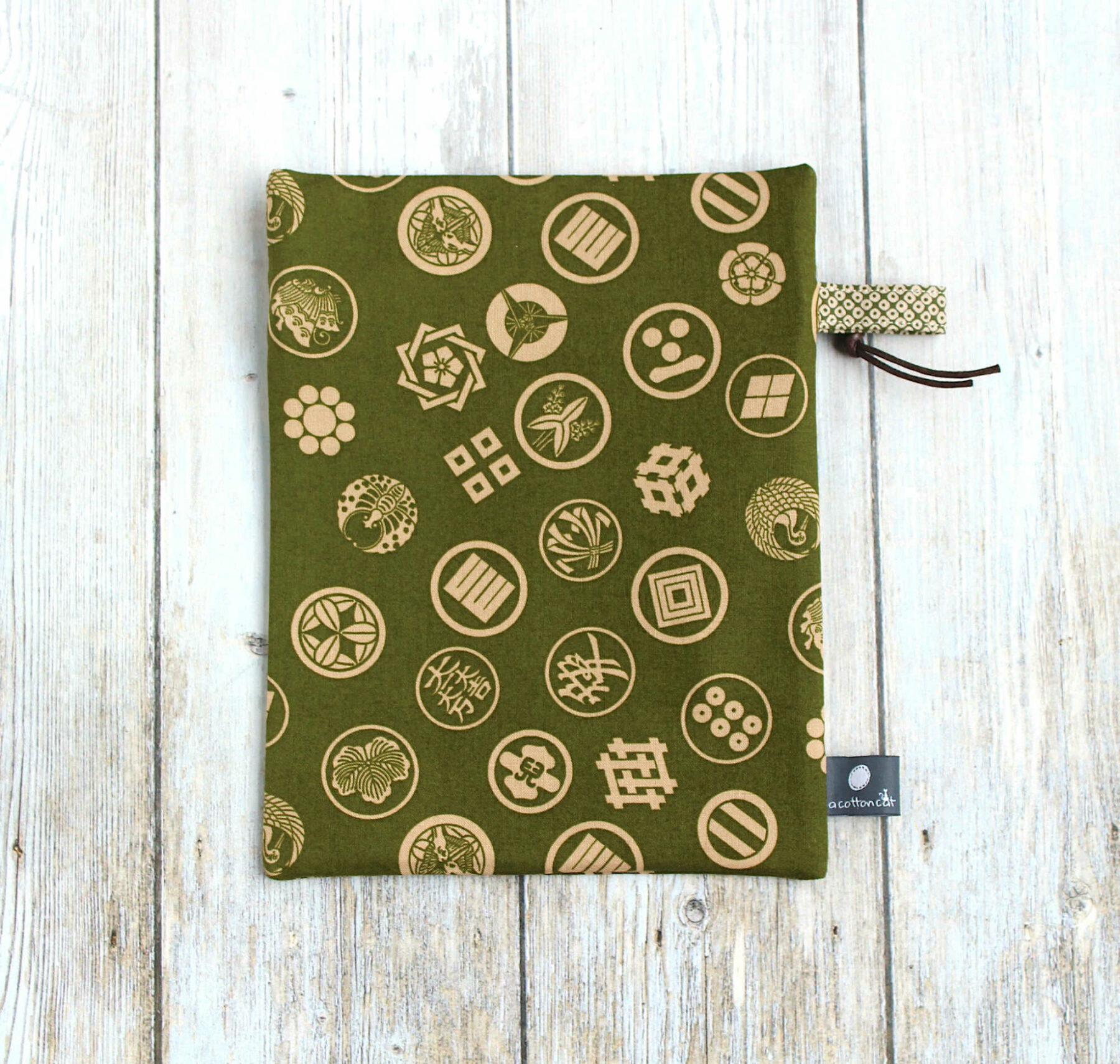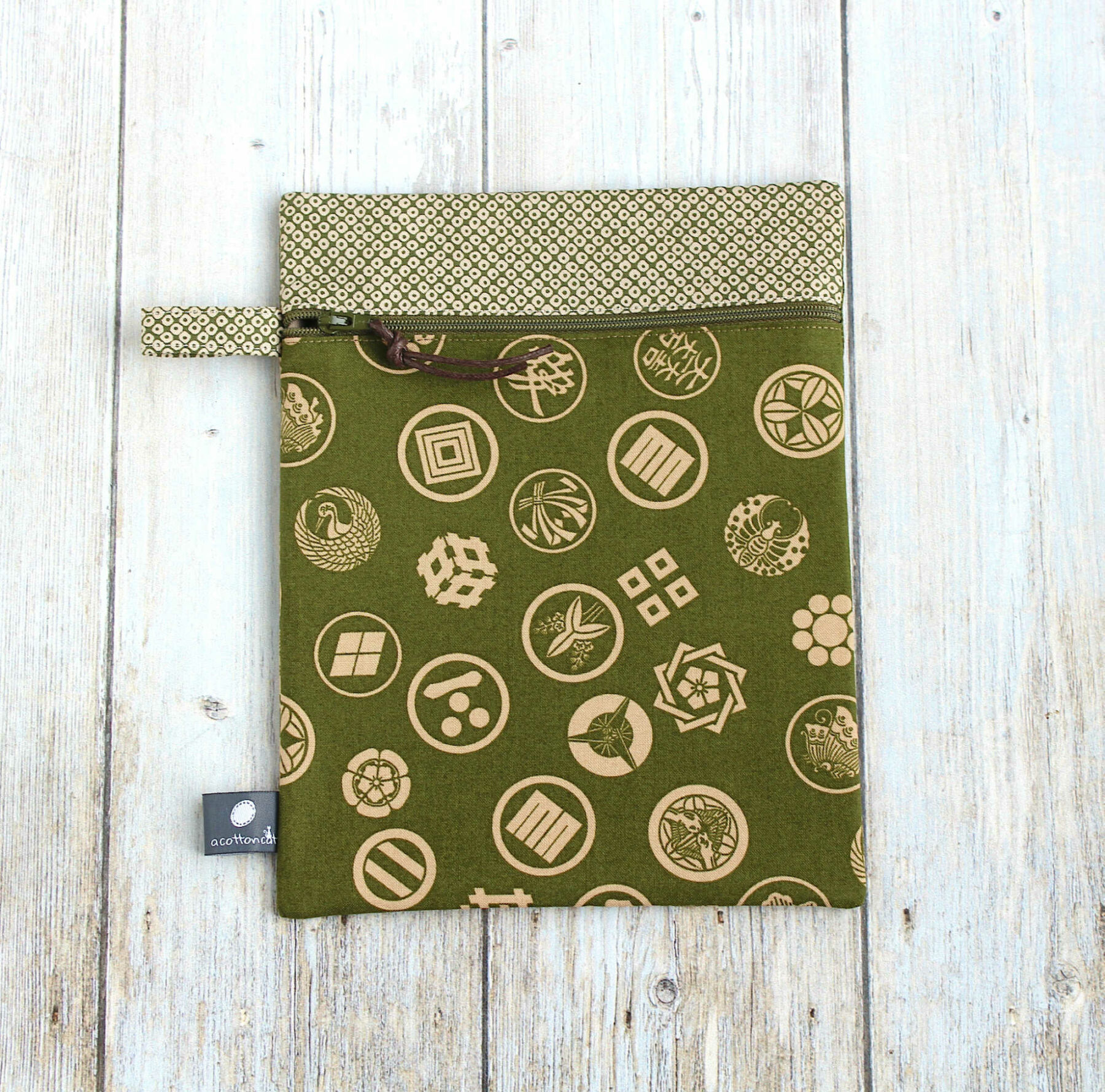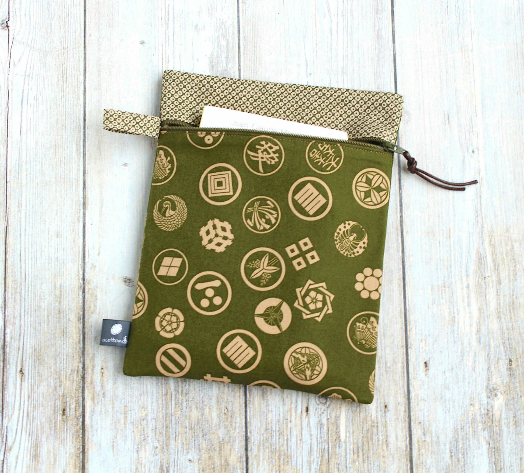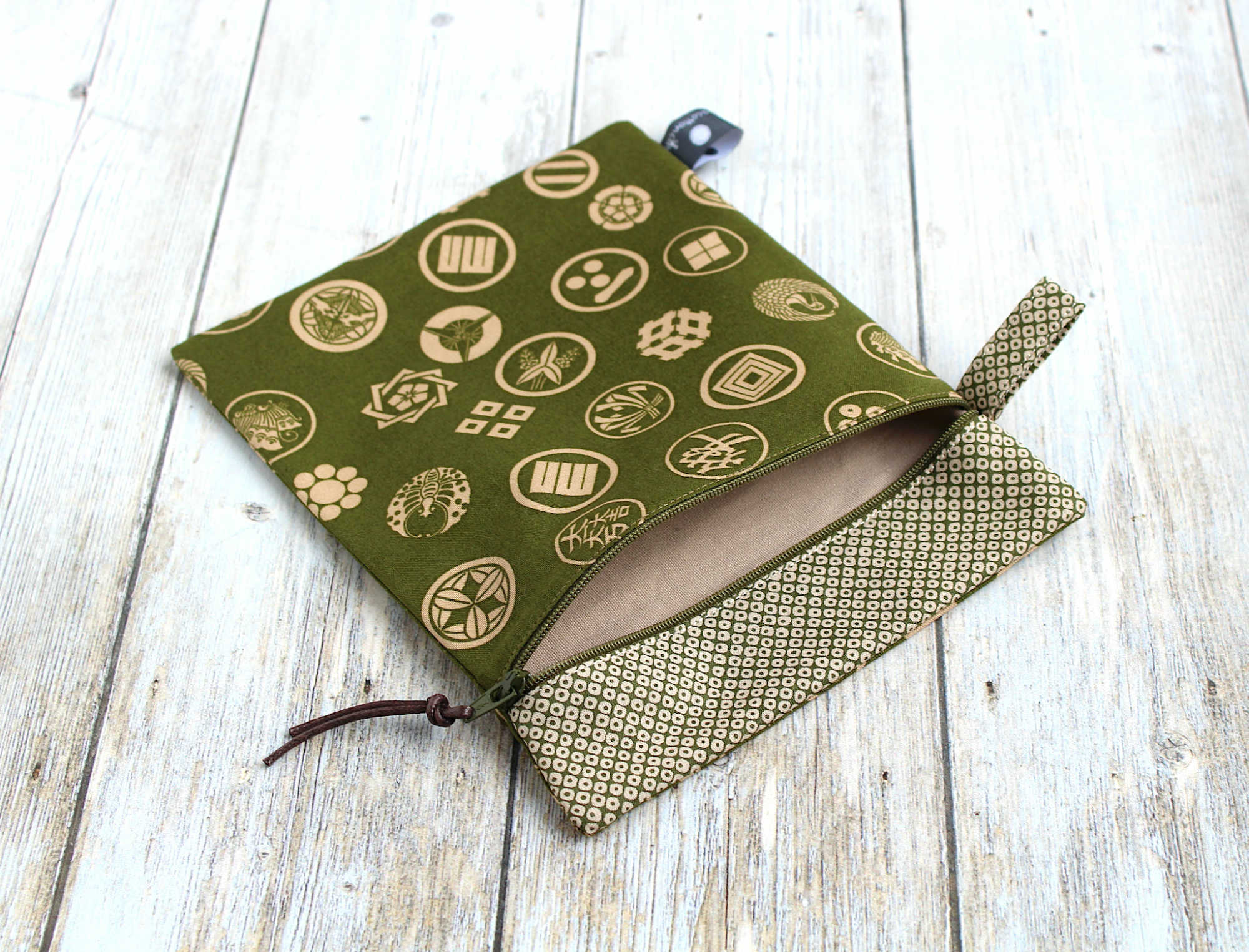 Trousse en coton japonais renforcé à motifs traditionnels sur fond vert. Elle est dotée d’une dragonne et fermeture zippée (à glissière) . Elle est doublée en coton épais beige.