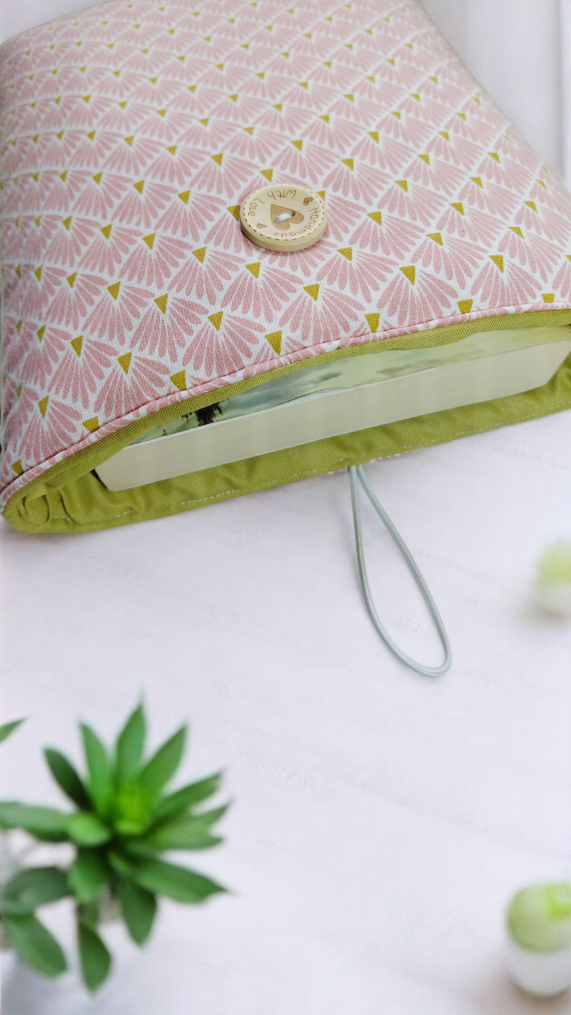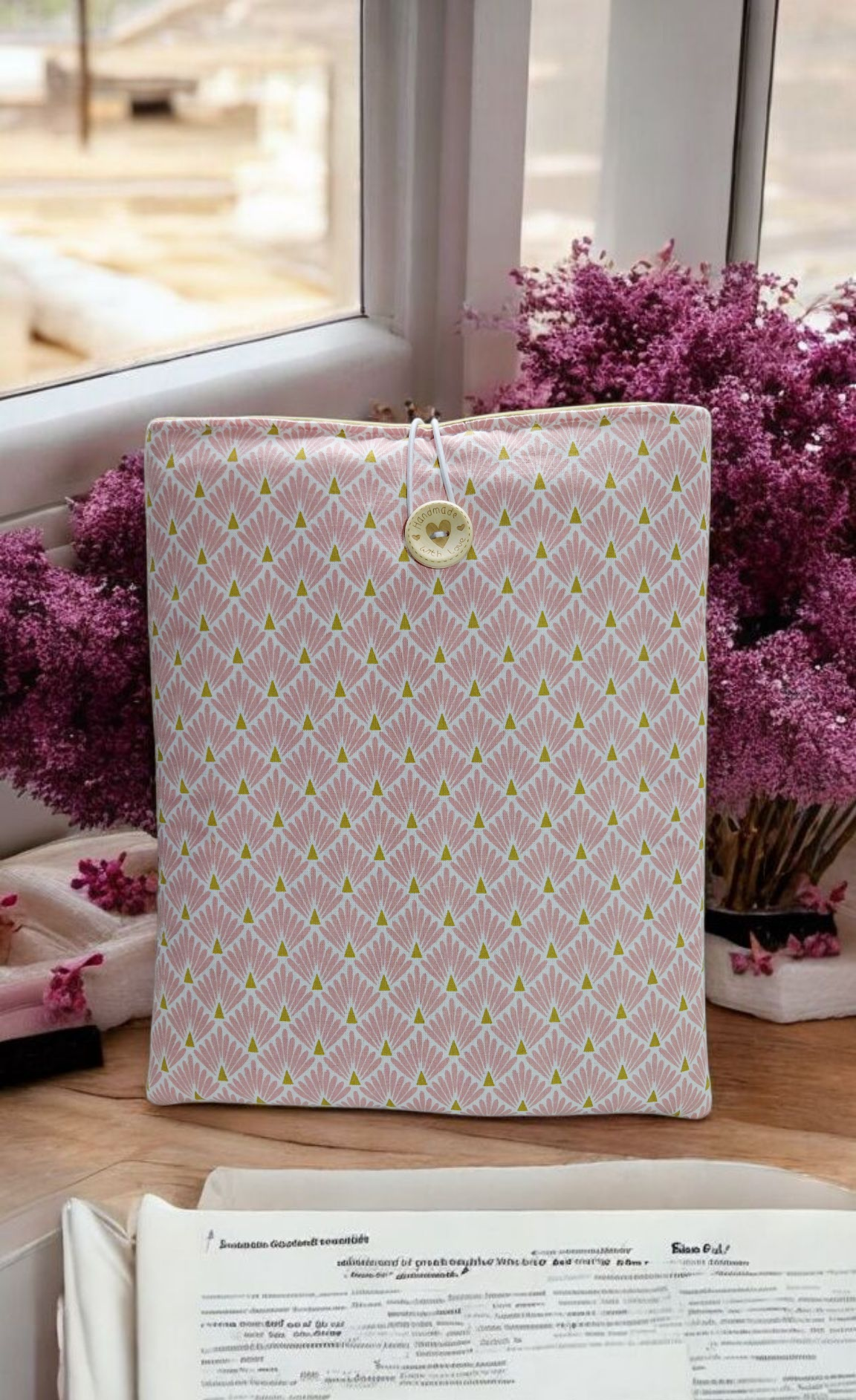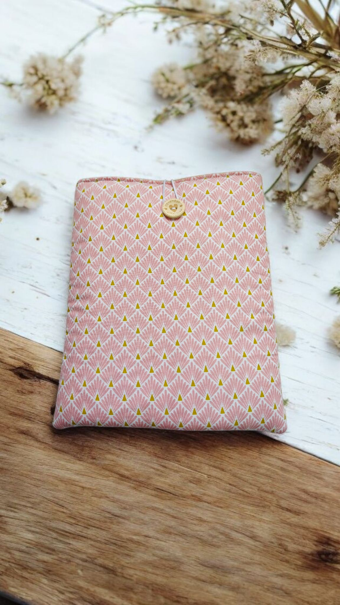 Protégez vos livres, tablettes ou liseuses avec cette jolie pochette molletonnée au motif éventails roses, confectionnée à la main avec soin.