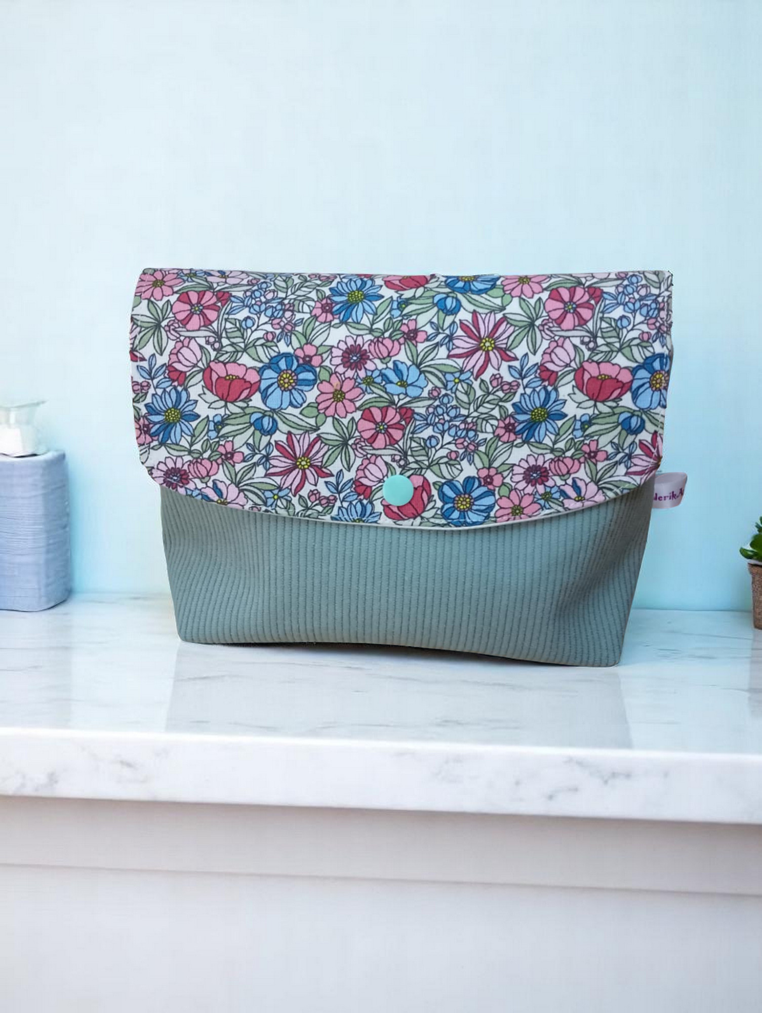 Cette pochette multifonction est confectionnée dans un coton certifié Oeko-Tex et son rabat en velours côtelé. Elle est doublée d’un coton uni et renforcée pour plus de tenue. Fermeture par une pression en résine. Finition des coutures à la main pour un plus beau rendu.