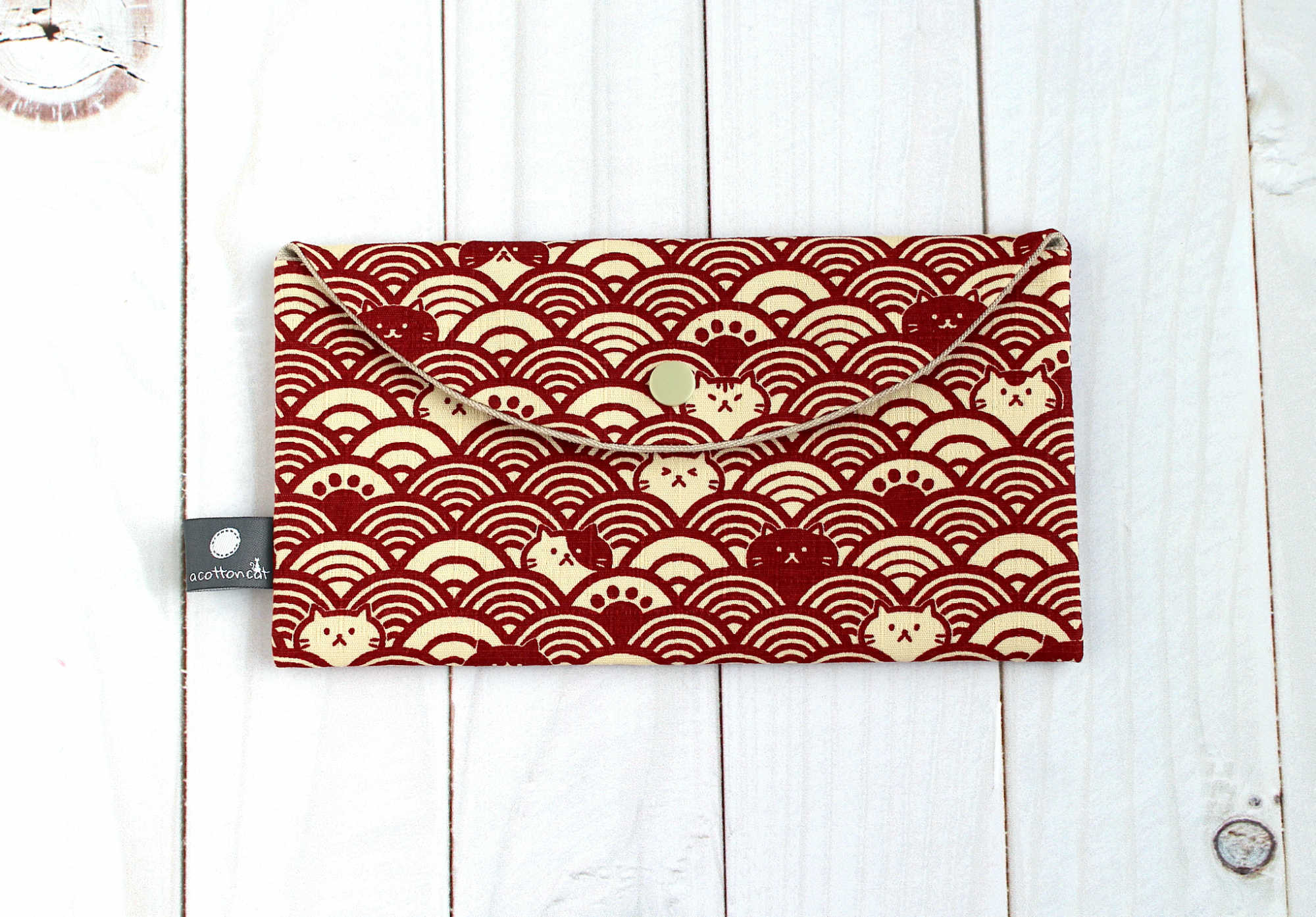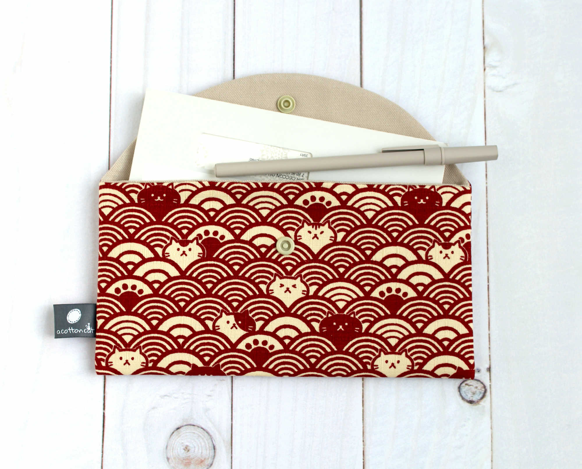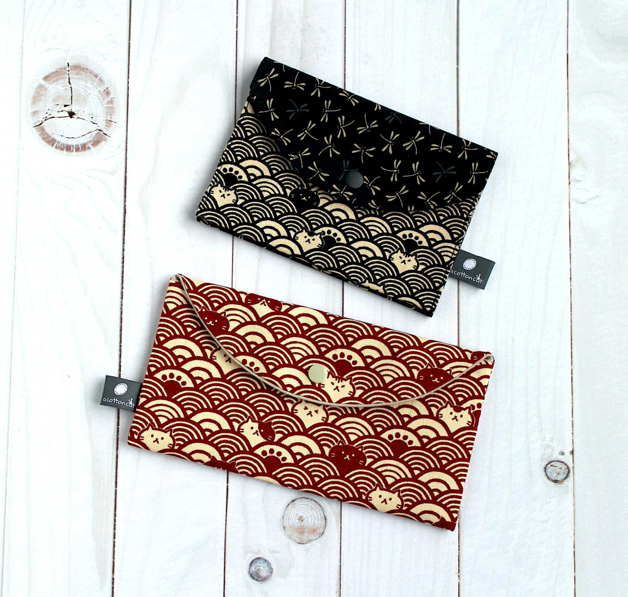 Pochette enveloppe en coton japonais à motifs chats. Elle est doublée en coton épais beige et se ferme avec un rabat doté d’un bouton clip (pression).