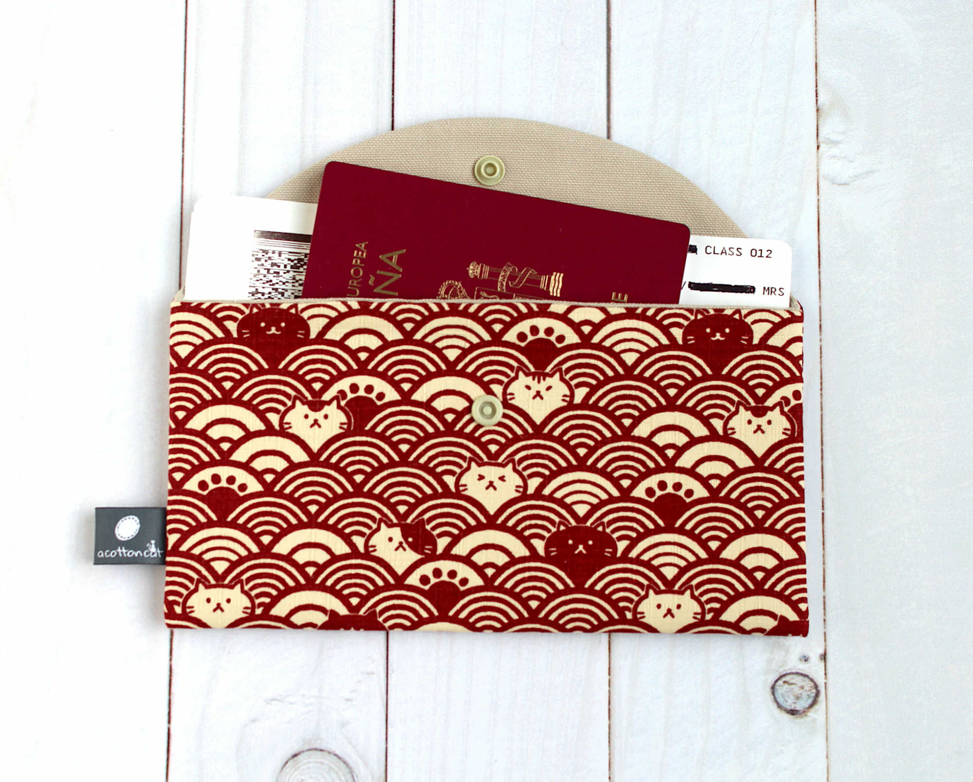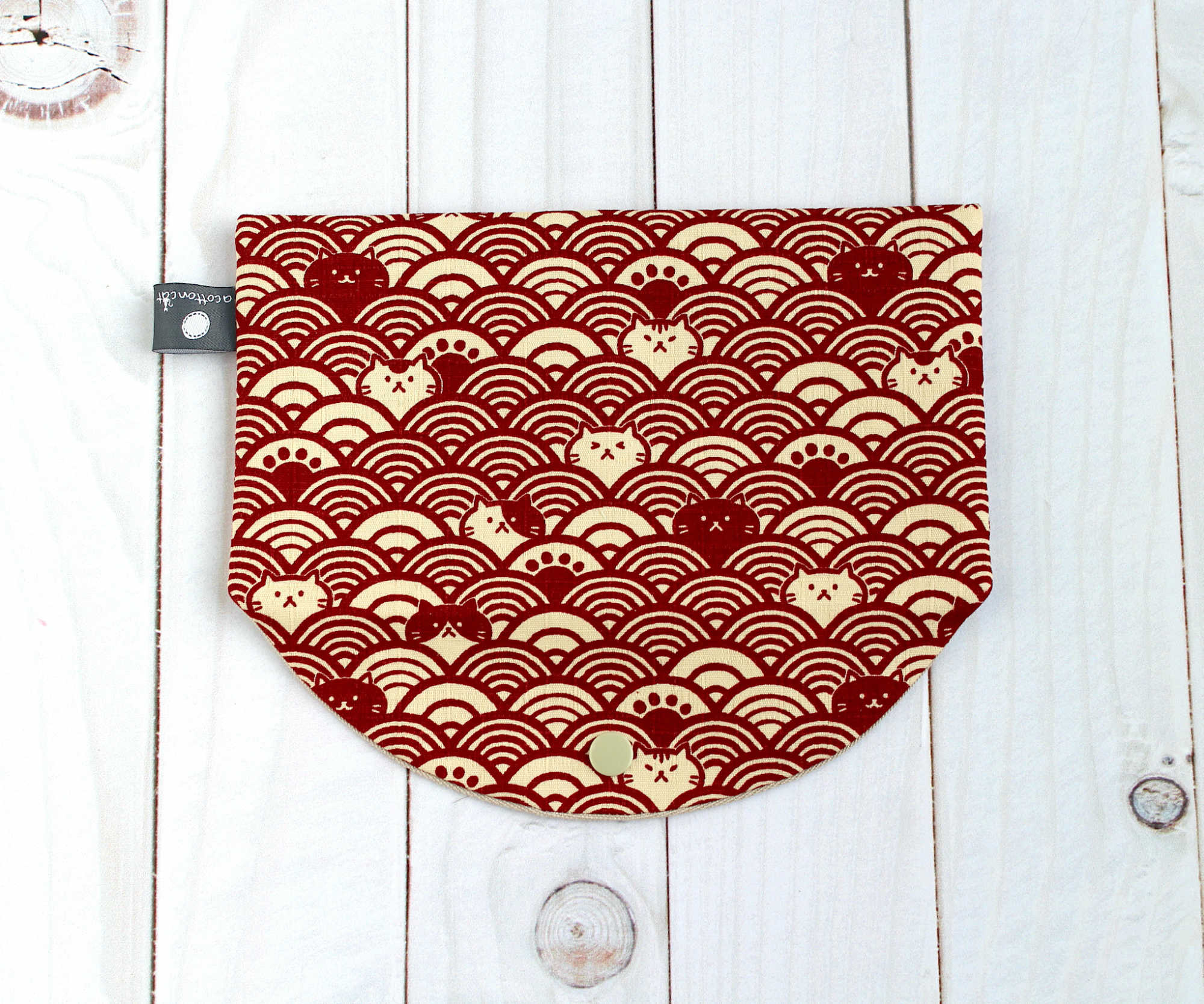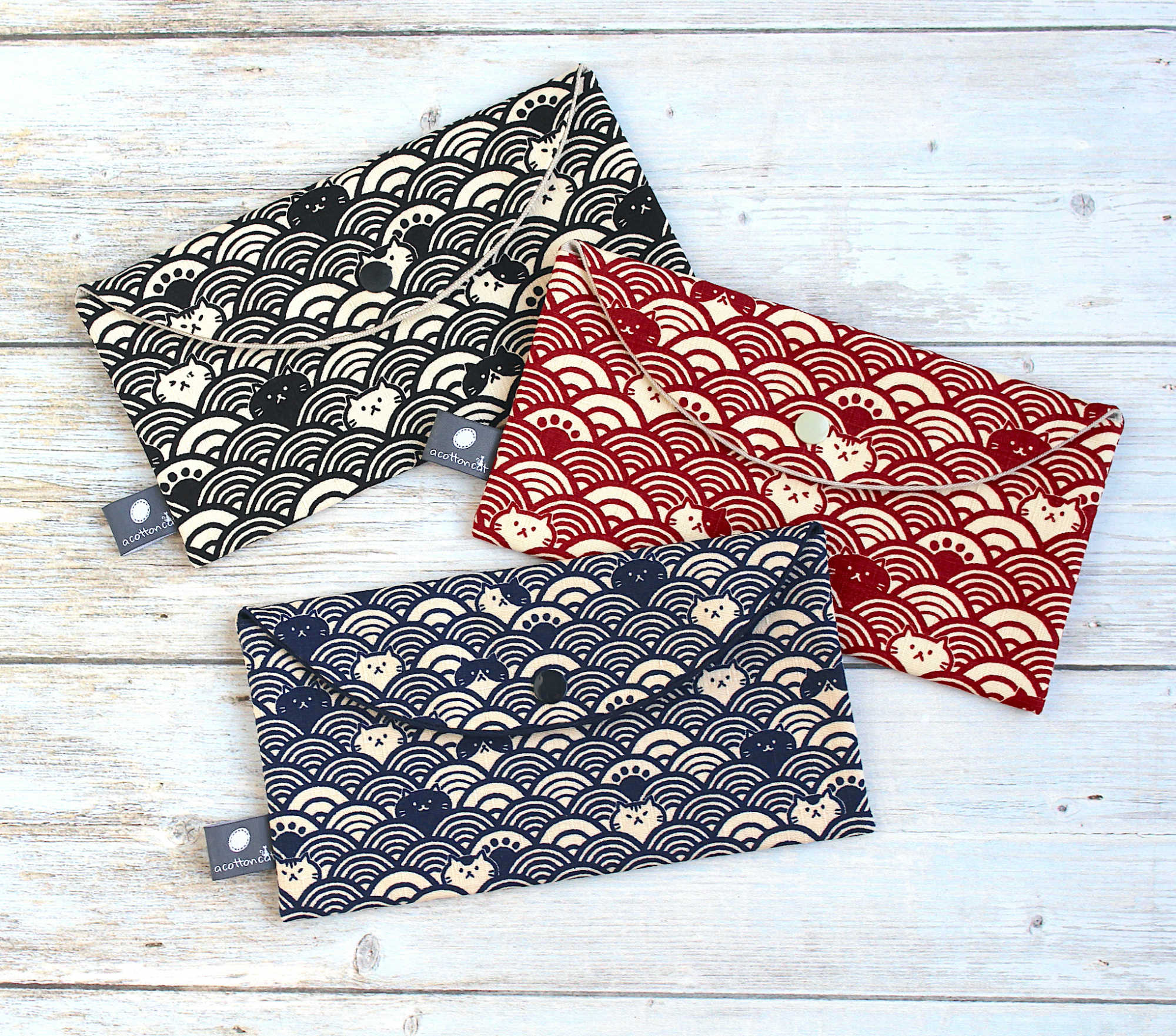 Pochette enveloppe en coton japonais à motifs chats. Elle est doublée en coton épais beige et se ferme avec un rabat doté d’un bouton clip (pression).