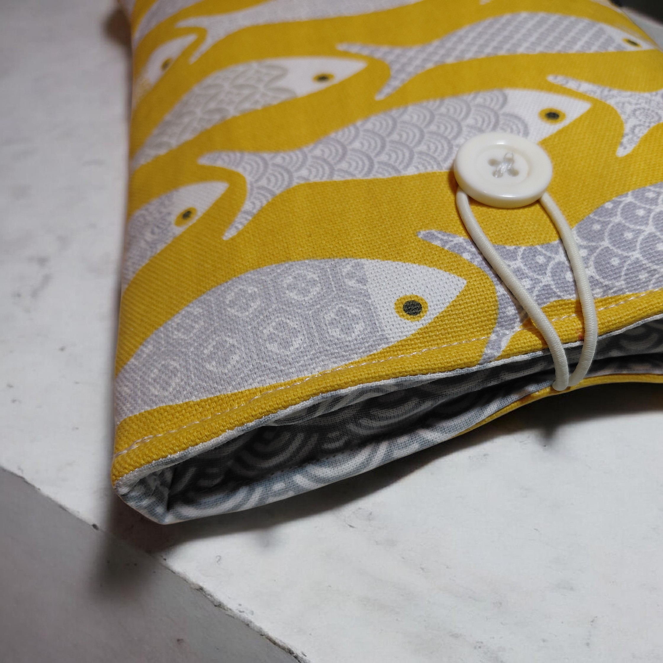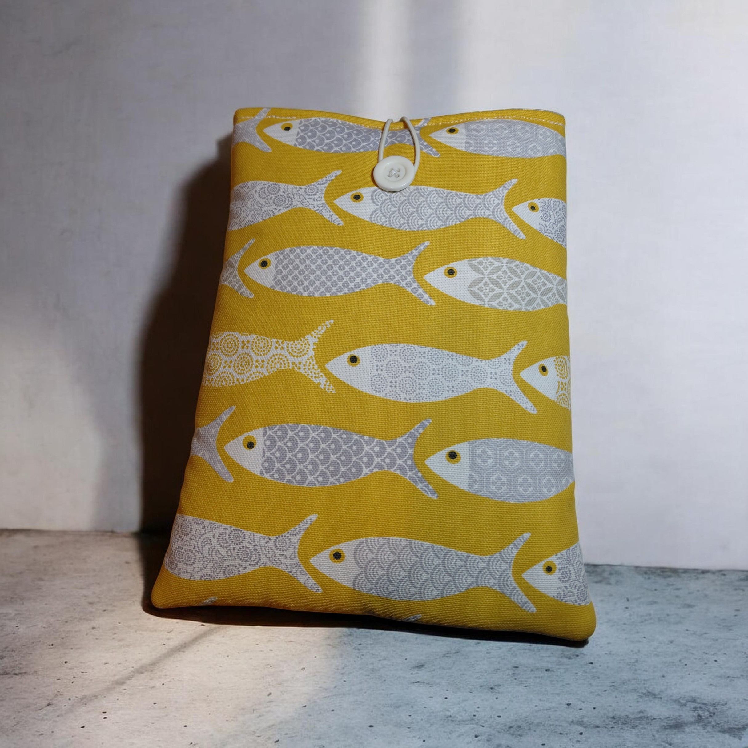 Son tissu extérieur en coton épais imprimé de poissons blancs et gris sur fond jaune lumineux apporte une touche moderne et originale. L’intérieur est doublé en coton doux et renforcé par un molleton pour une protection optimale contre les chocs, les rayures et les coins abîmés.