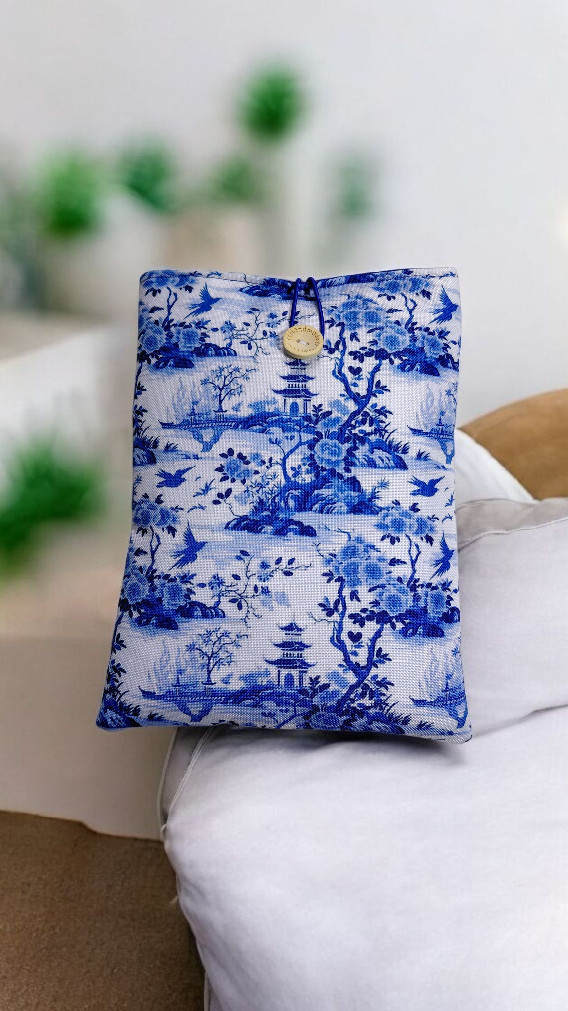Le motif japonais dans les tons de bleu apporte une touche raffinée et apaisante, parfaite pour les amateurs de belles matières et de style artisanal.
