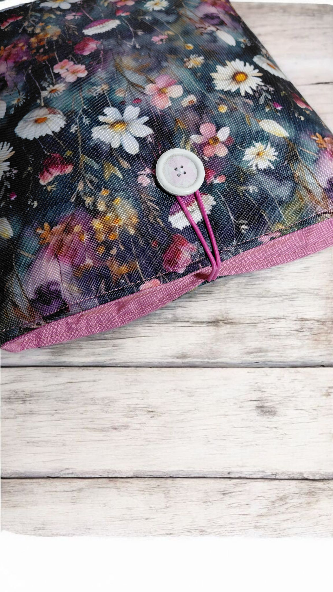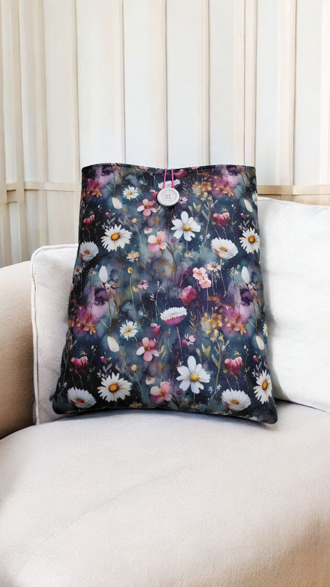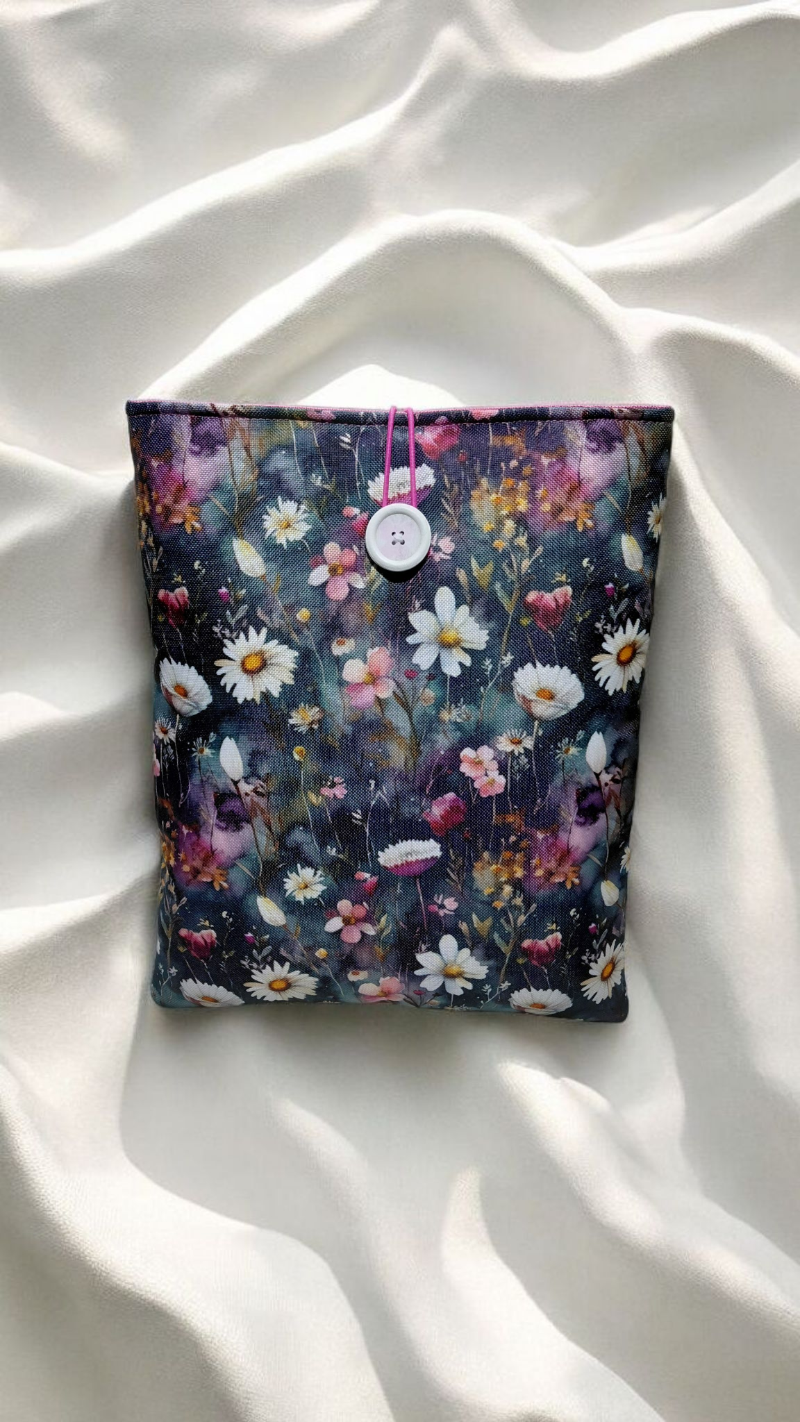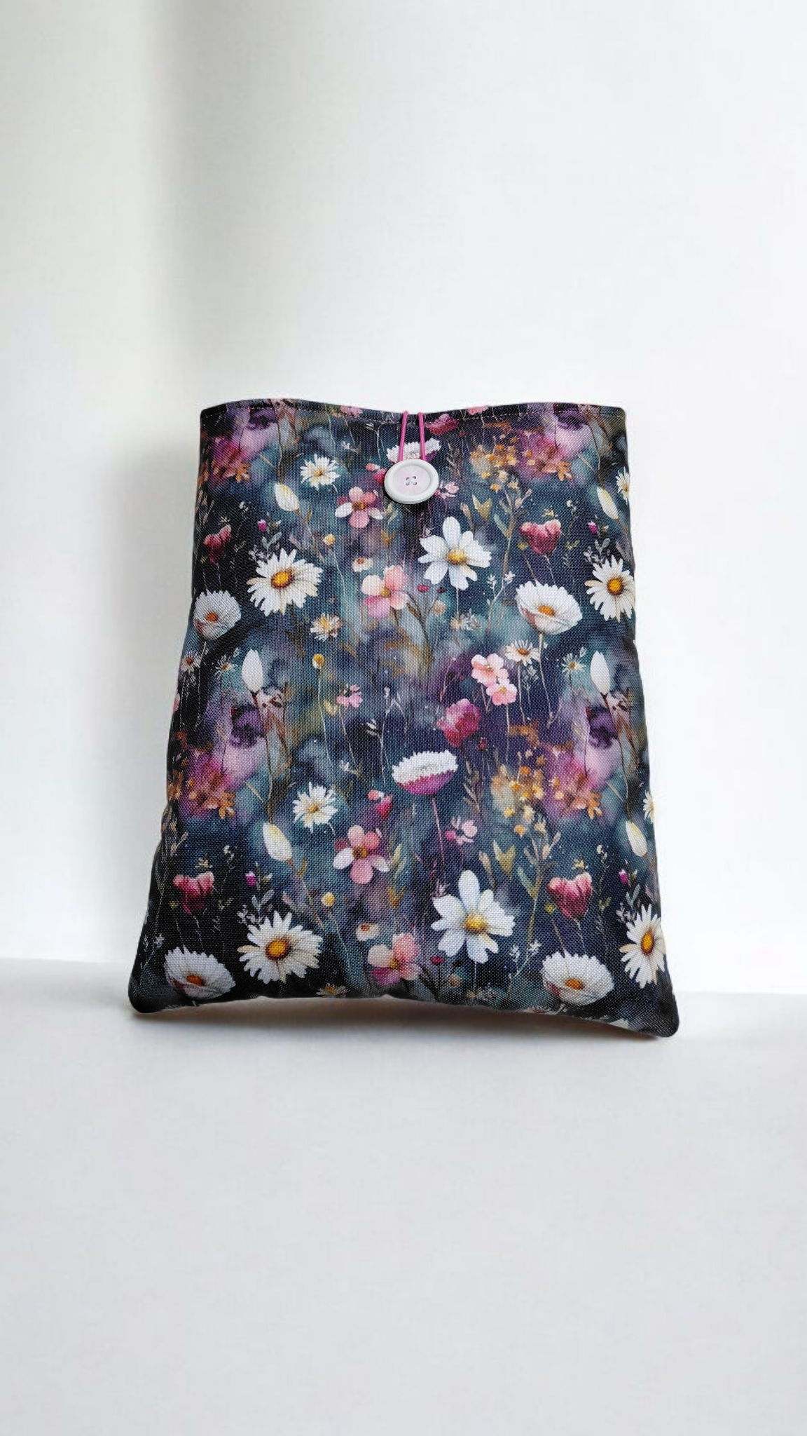 Protégez vos lectures et appareils avec cette pochette molletonnée faite main au motif marguerites, aussi douce qu’élégante 🌸.