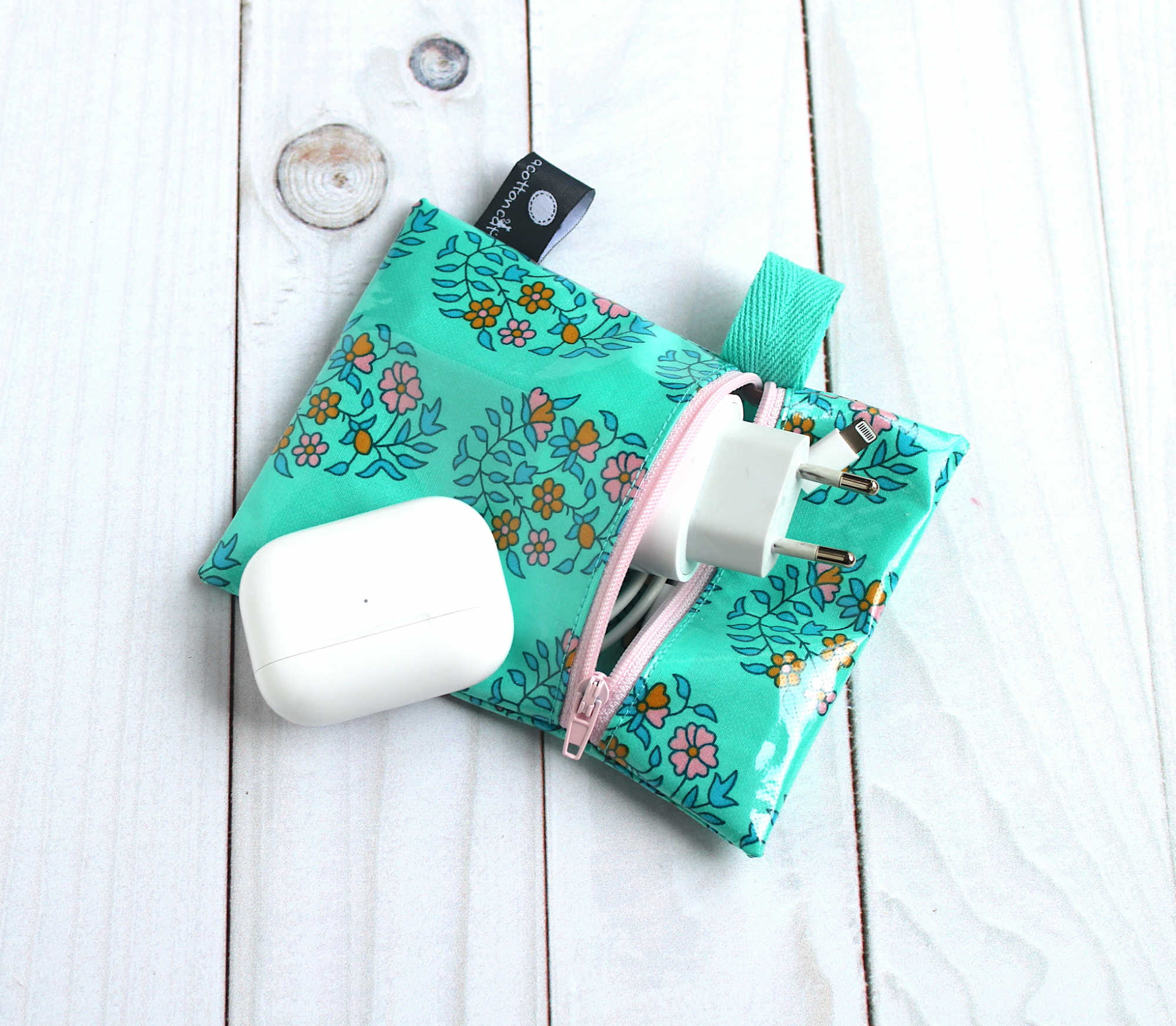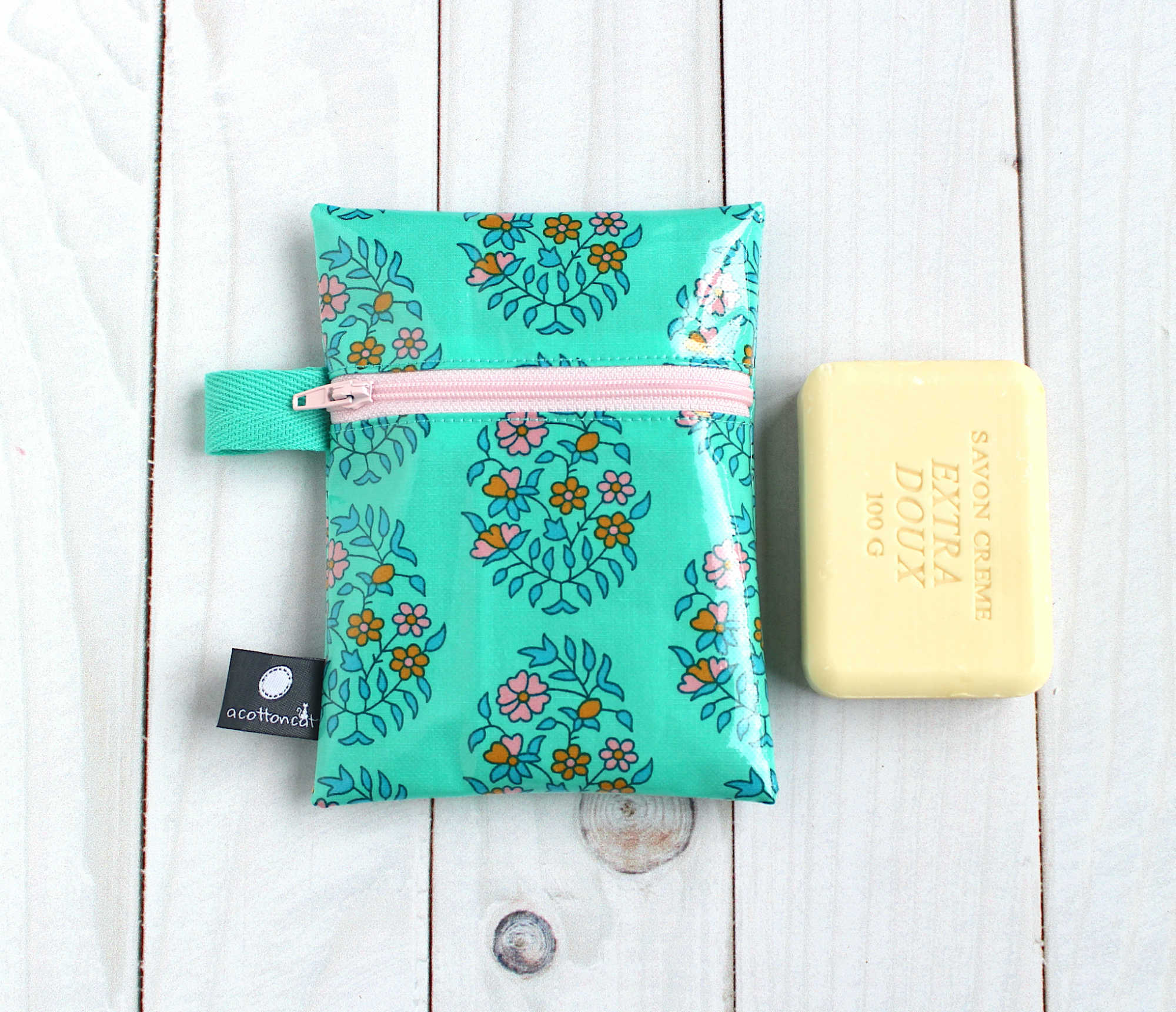 Petite pochette en coton enduit (toile cirée) fermeture zip. Finition brillant. Motif fleurs sur fond vert d’eau.