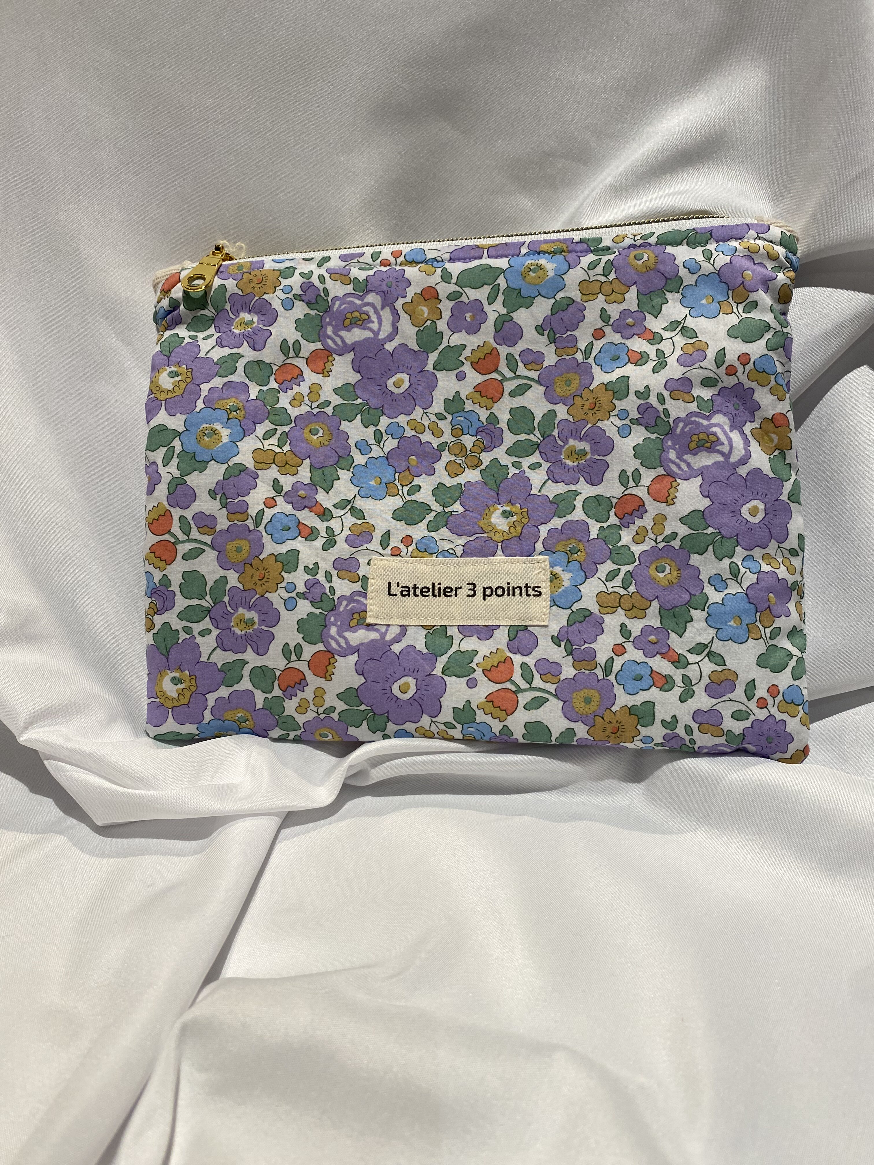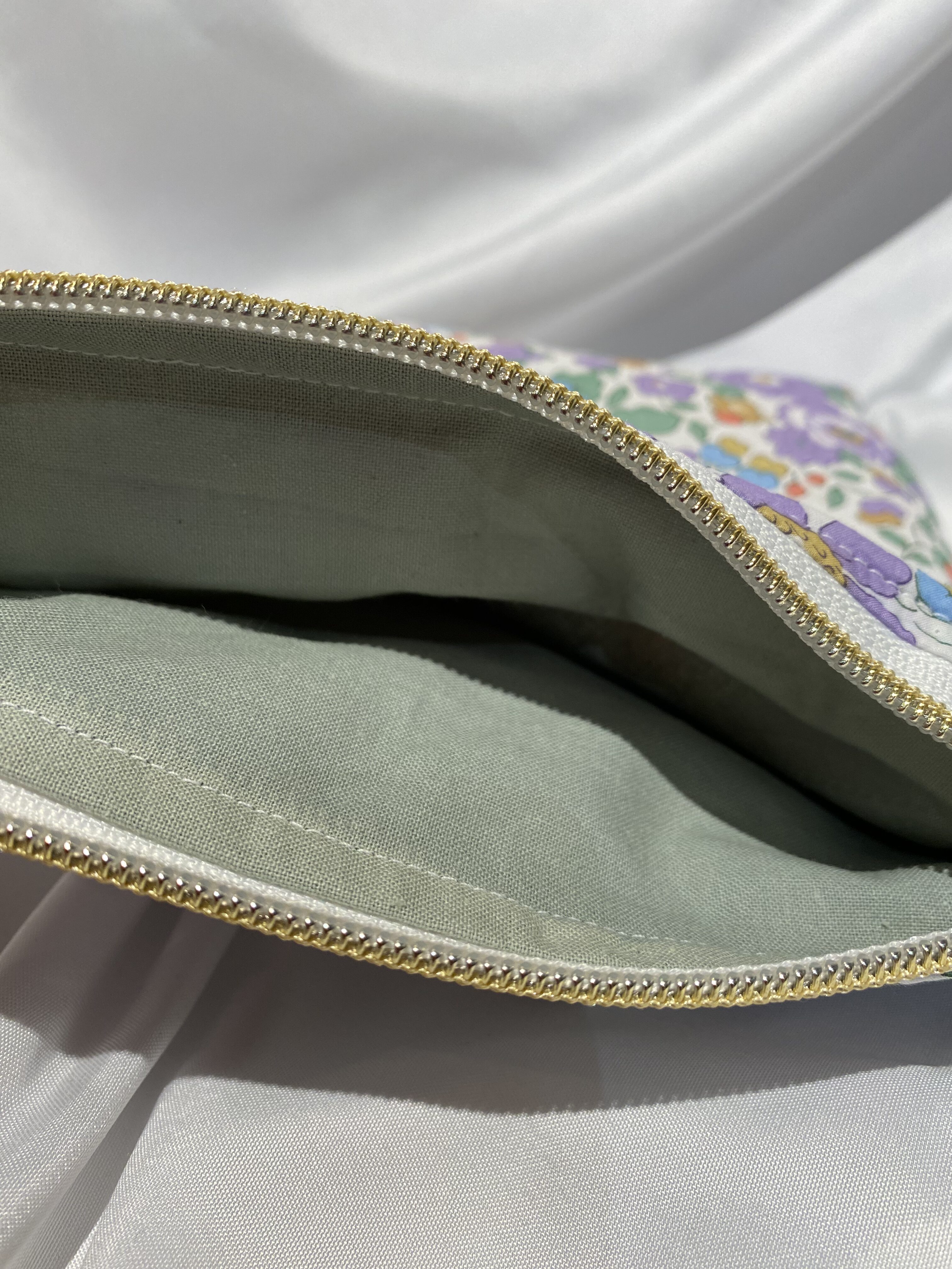 Pochette fabriquée avec du tissus Liberty. Doublée en coton vert pale.