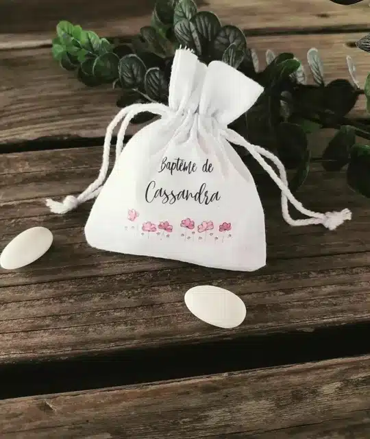 Je vous propose de personnaliser de jolis pochons en coton avec liens de serrage. Ils seront parfaits pour y glisser des dragées, savon, figurines, chocolats, mini pot de confiture, confettis et tant d’autres cadeaux pour vos invités…