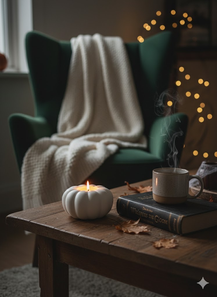 près d’un fauteuil confortable, avec une bougie, une tasse fumante