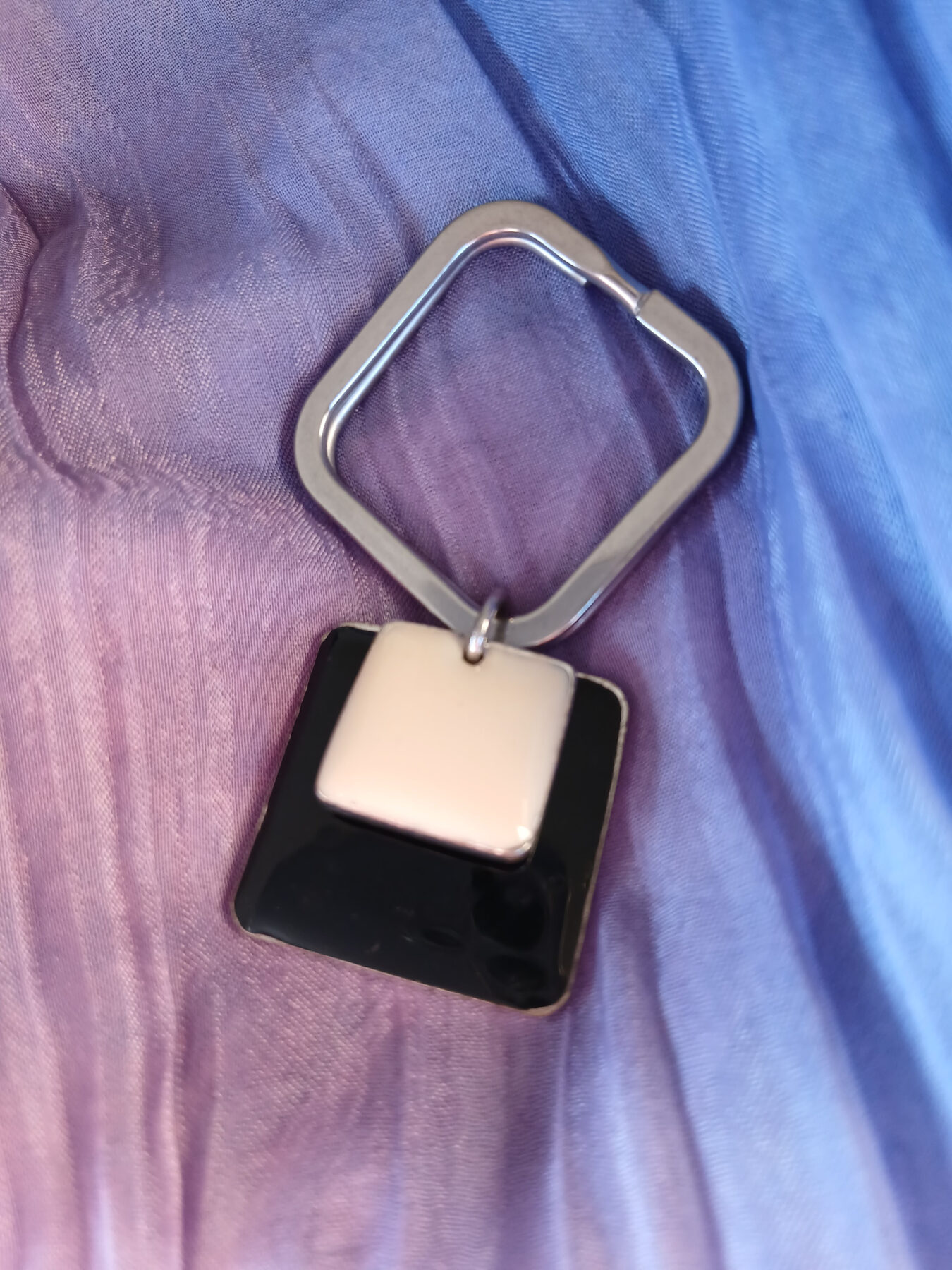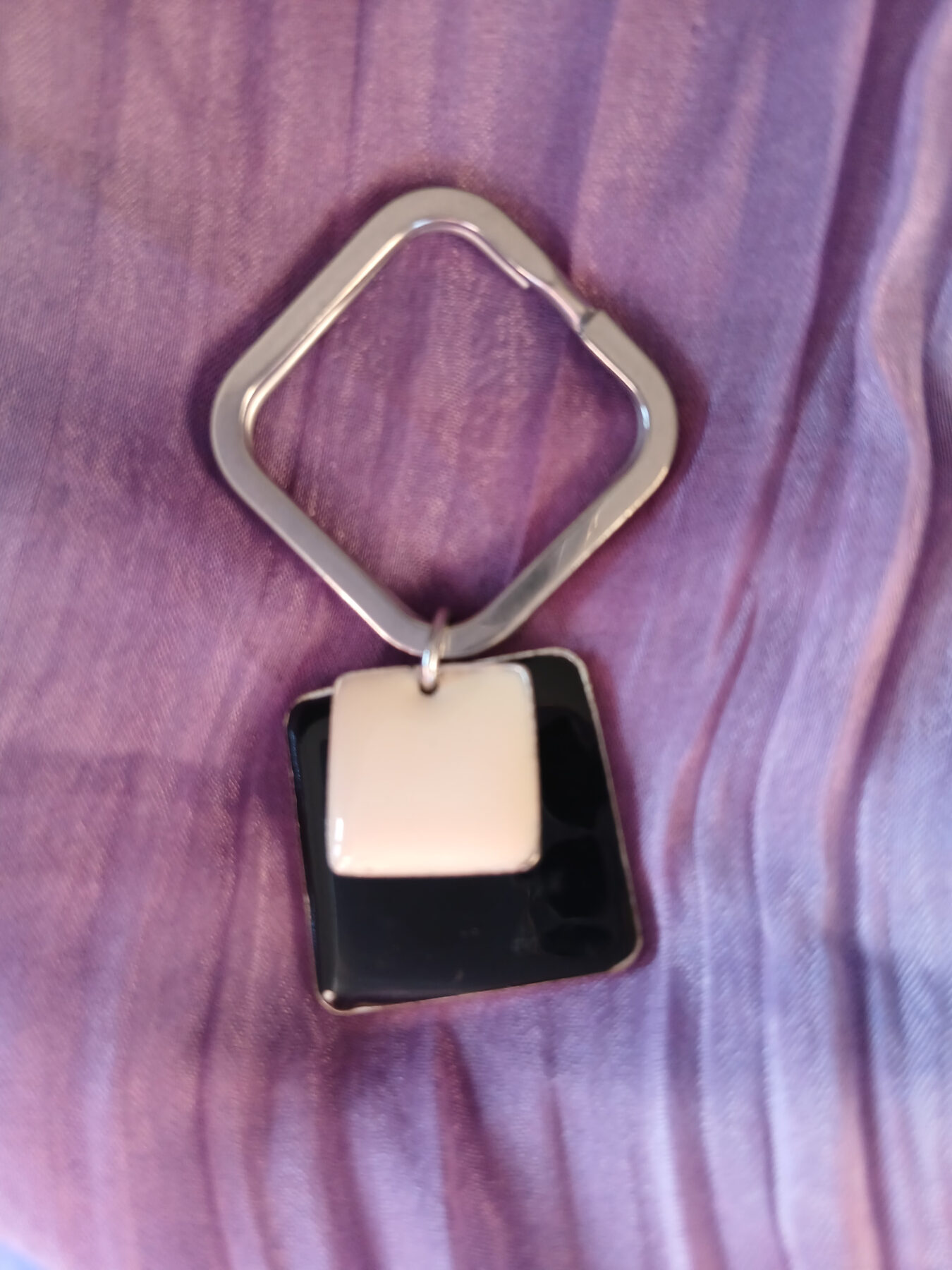Ajoutez une touche de poésie à votre quotidien avec ce délicat porte-clés fait main par CDC-UPCYCLE. Composé d’un anneau de forme carrée et de pendentifs émaillés superposés, crème sur noir, il apportera une touche vintage à votre style.