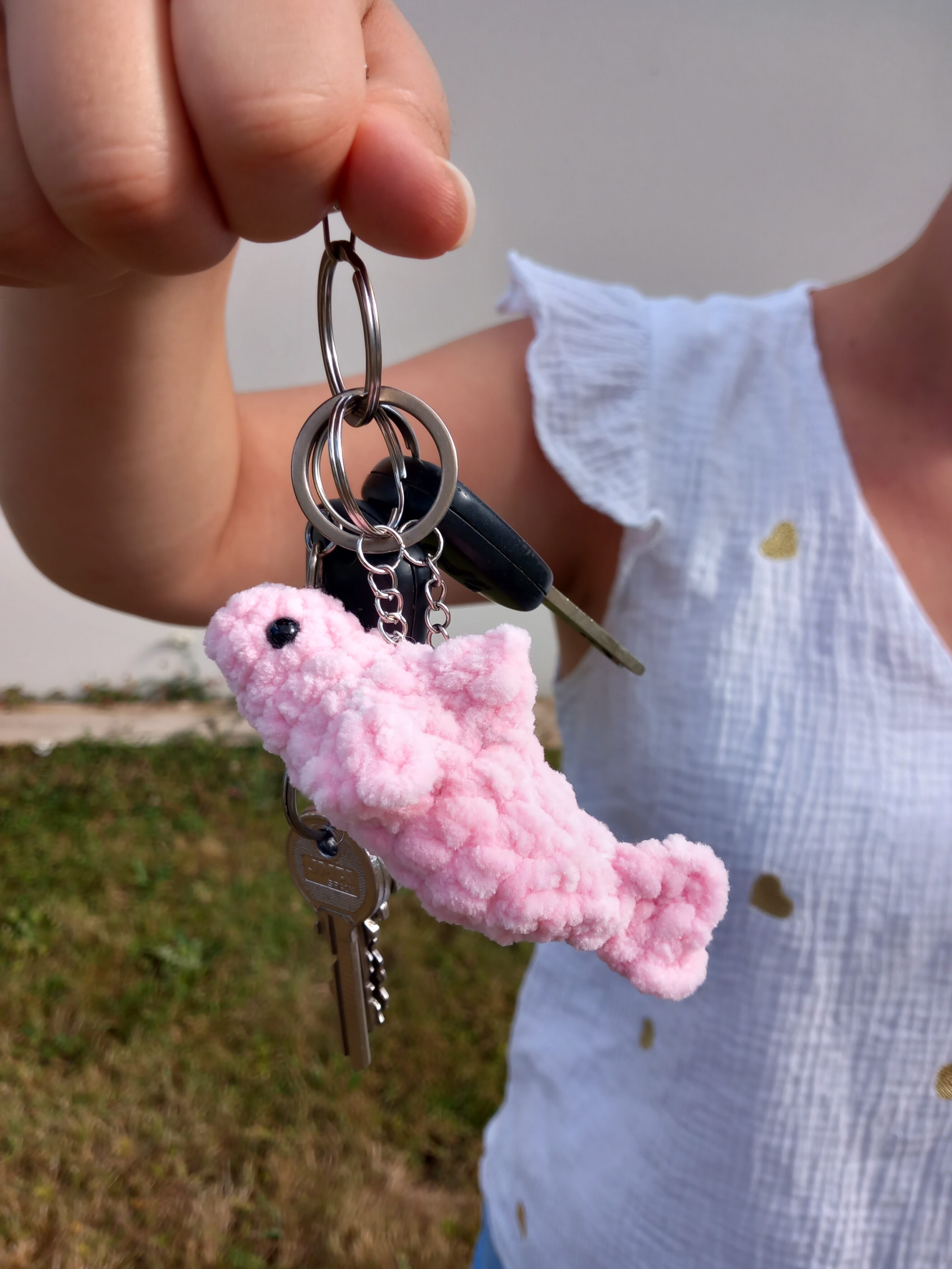 Porte-clé “poisson rose” crocheté avec de la laine rose pâle certifiée OEKO-TEX (thème été) !