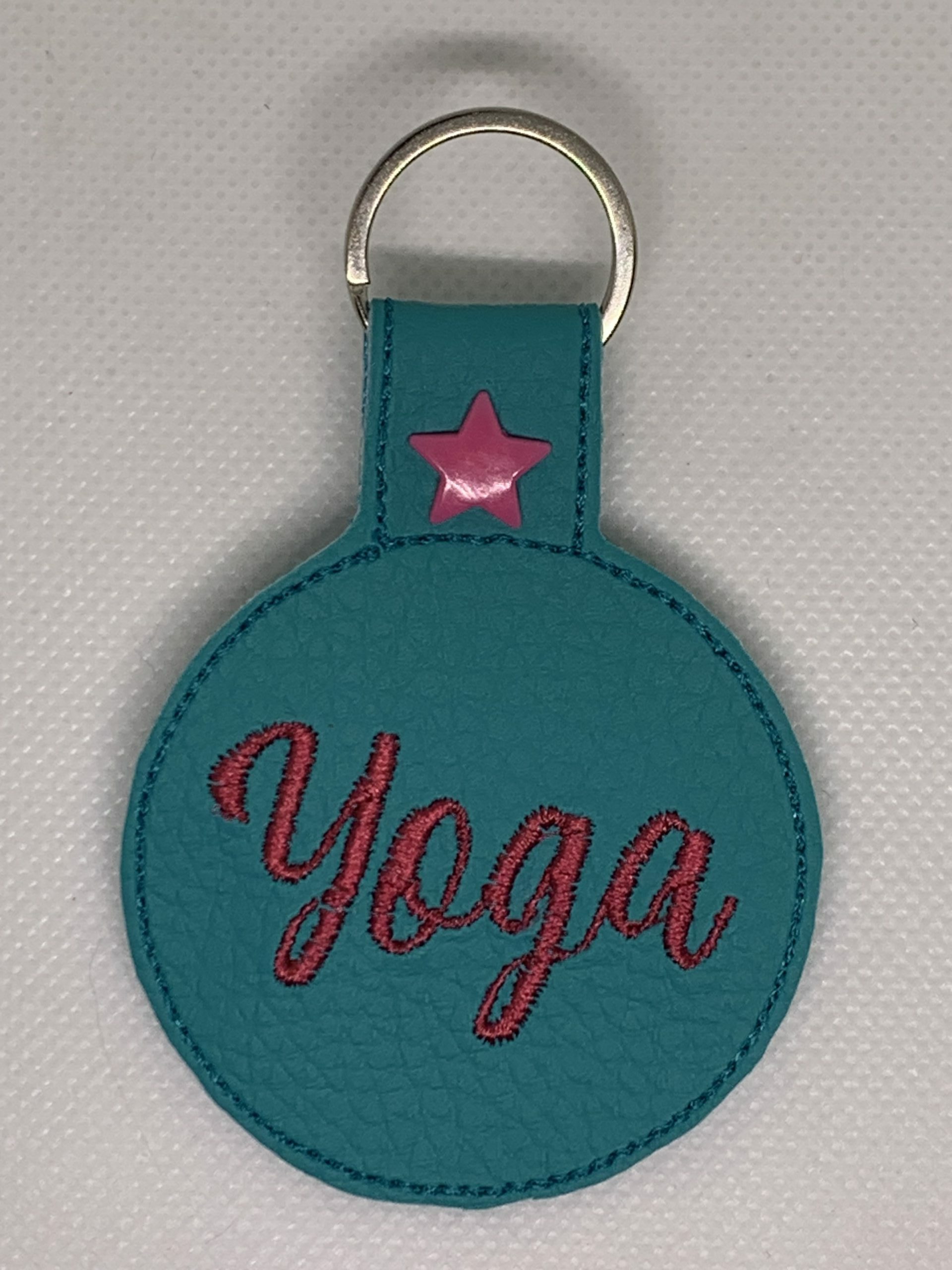 Porte clés yoga brodé sur simili cuir turquoise.