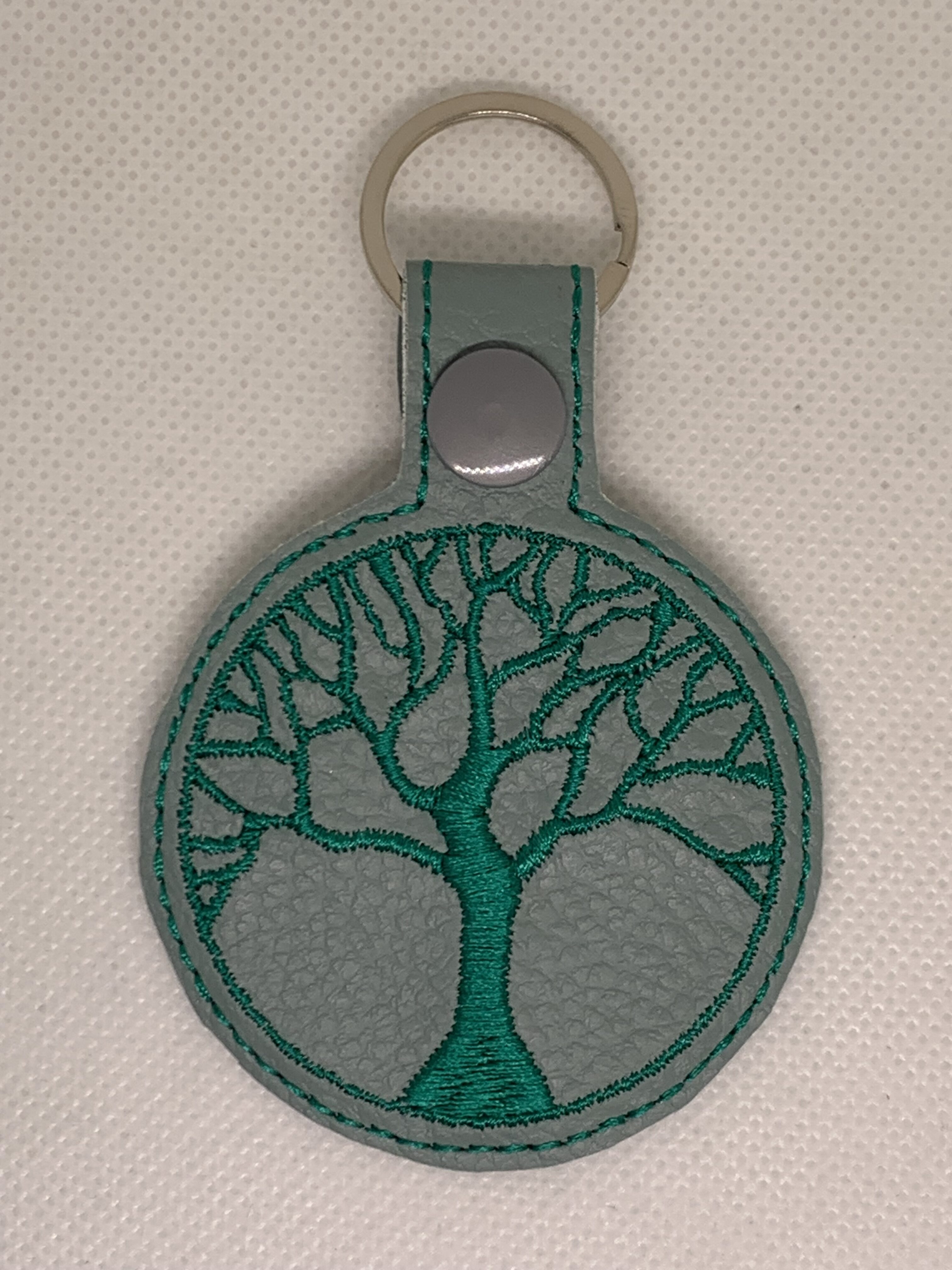 Porte clés arbre de vie brodé sur simili cuir gris.