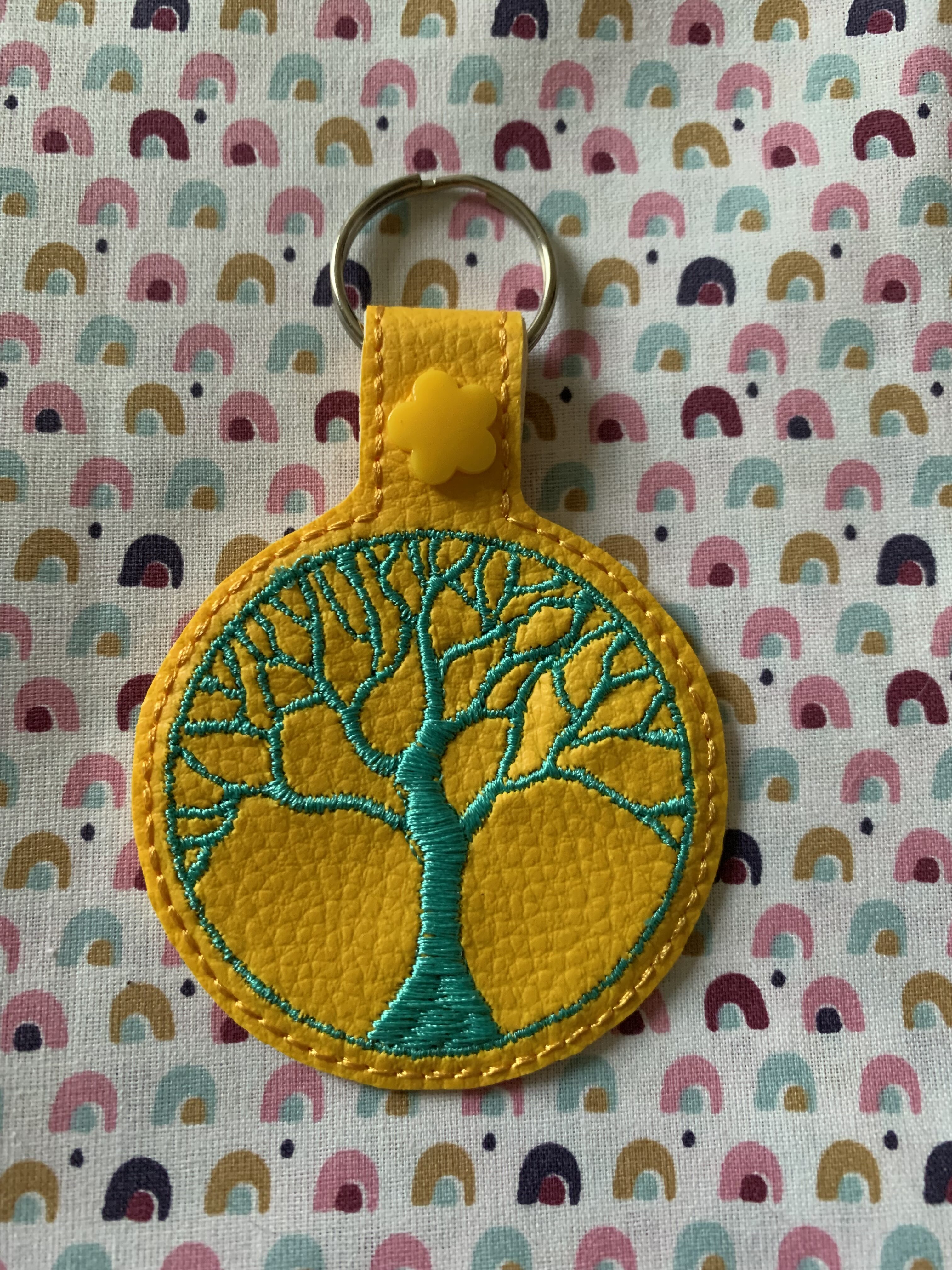 Porte clés arbre de vie brodé sur simili cuir jaune.