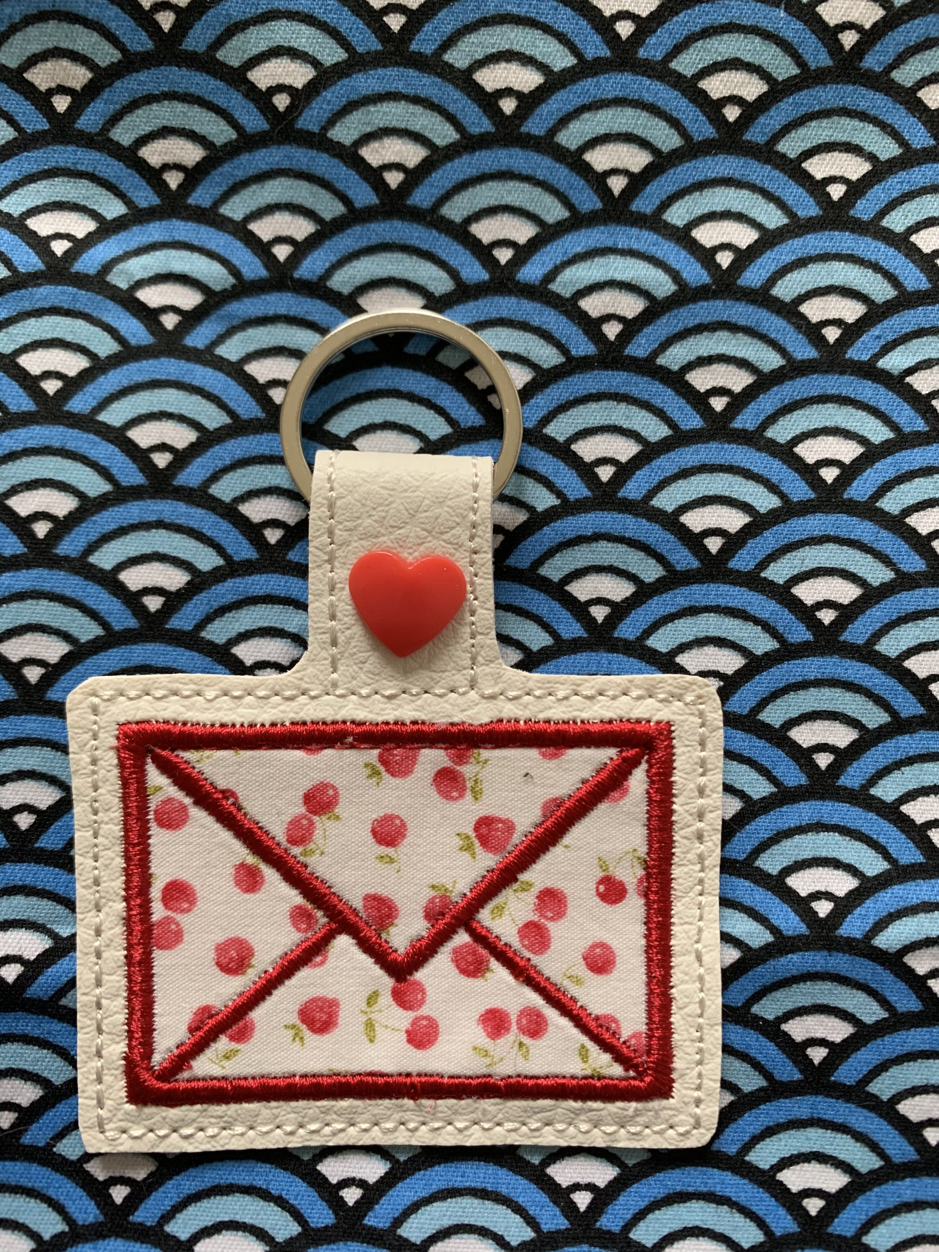 Porte clés courrier brodé sur simili cuir et appliqué en coton.