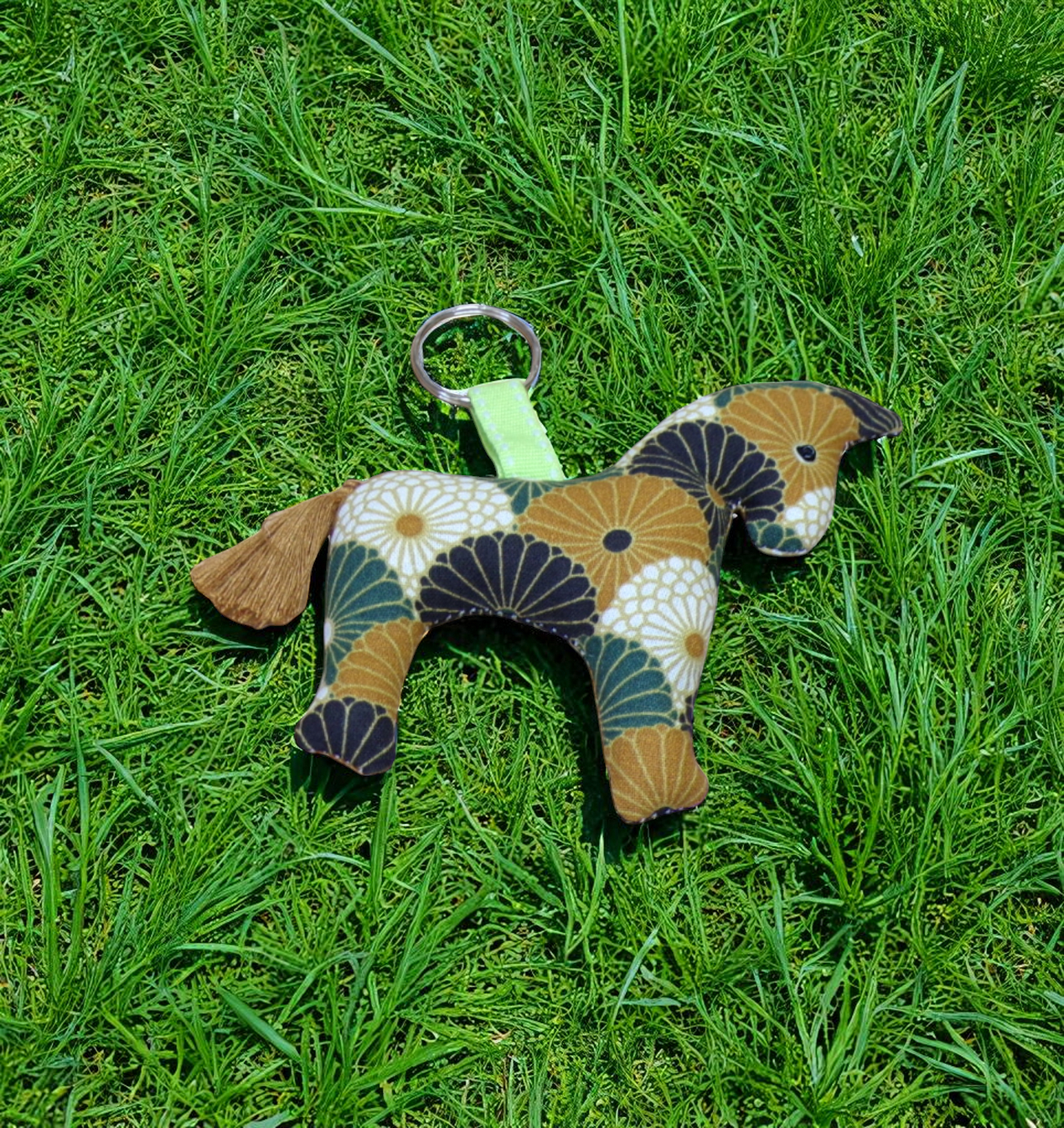 Porte clés en forme de petit cheval réalisé à la main dans du tissu en coton.