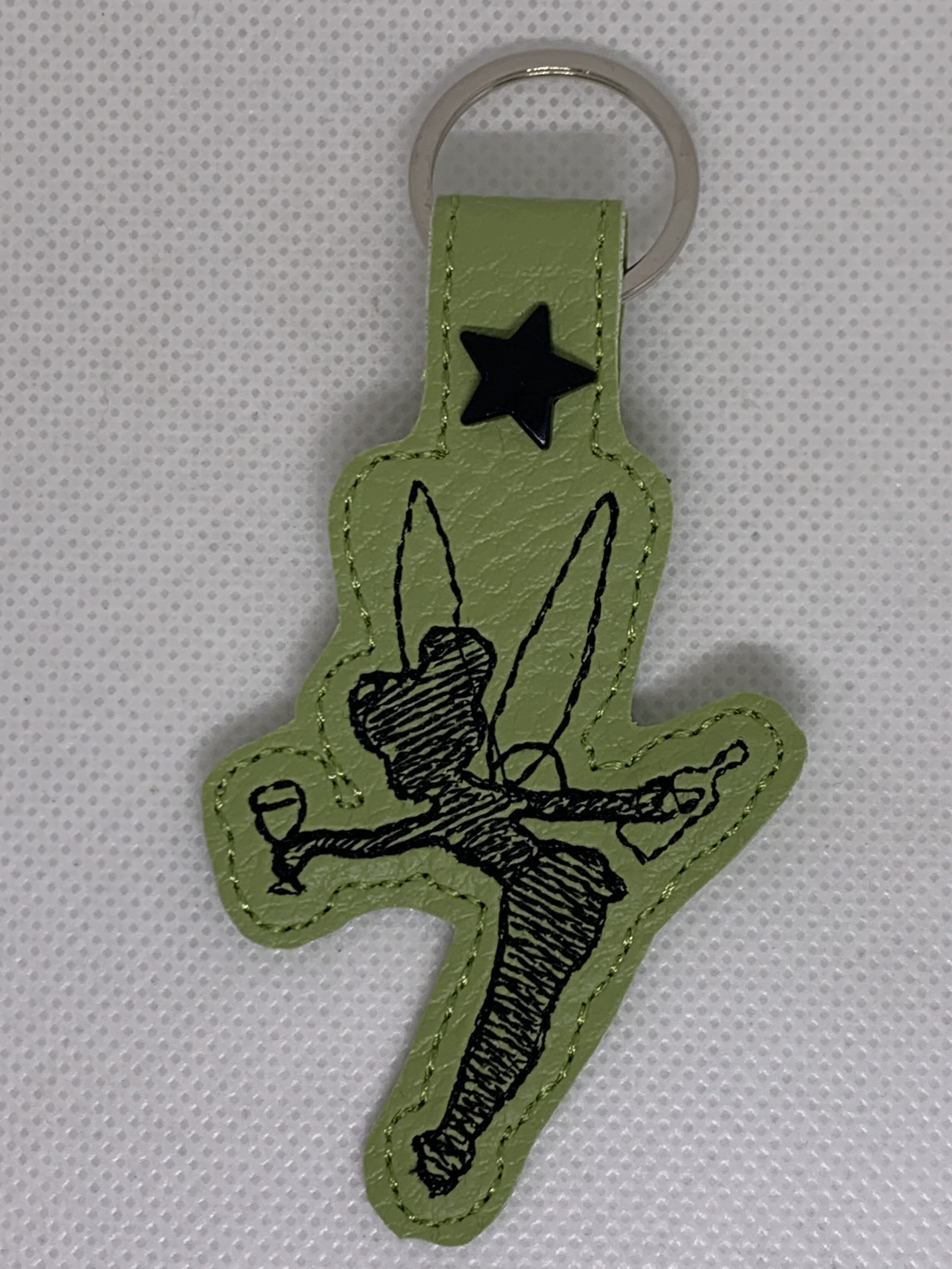 Porte clés Fifi la fée brodé sur simili cuir vert.