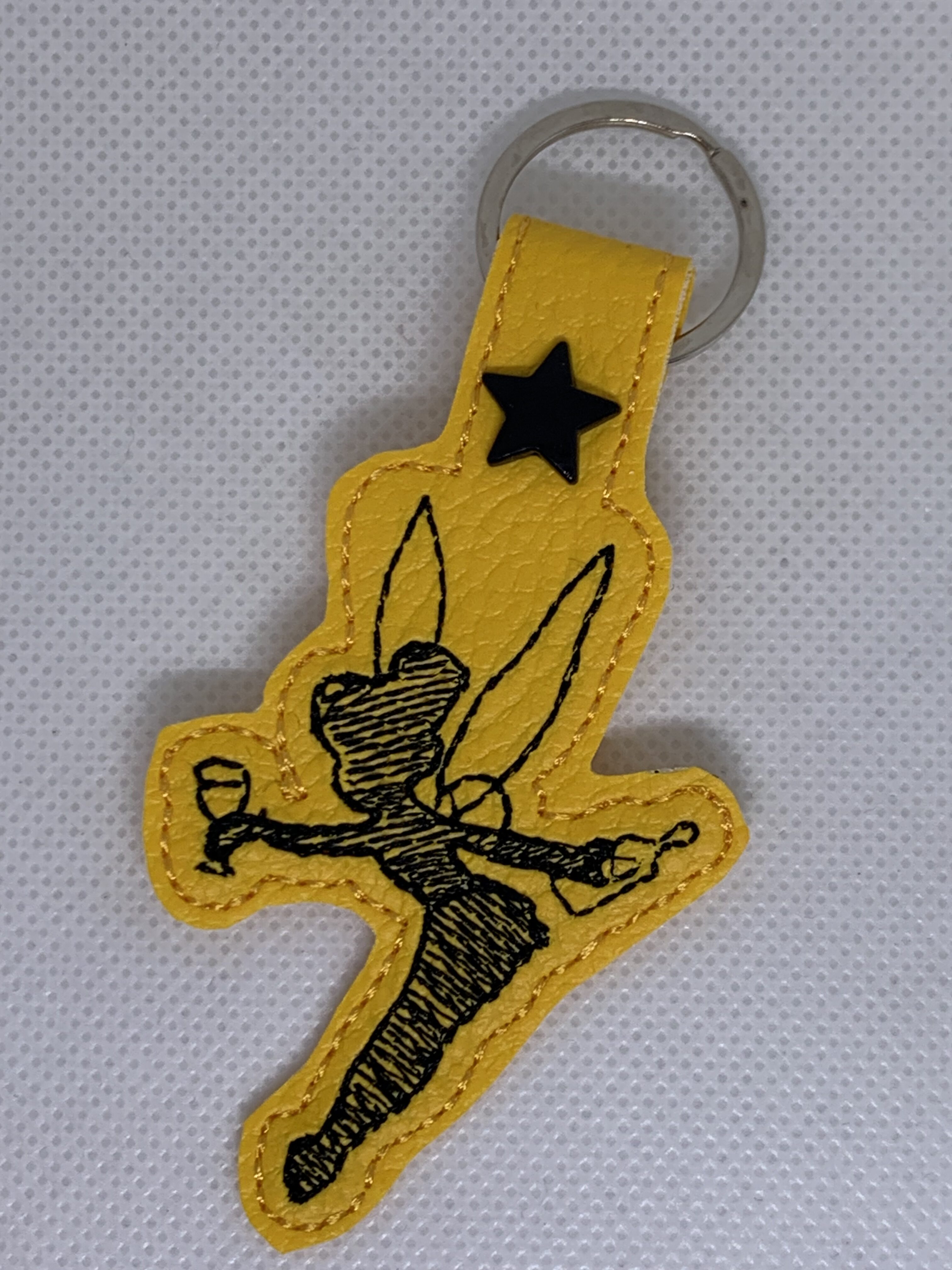 Porte clés Fifi la fée brodé sur simili cuir jaune.