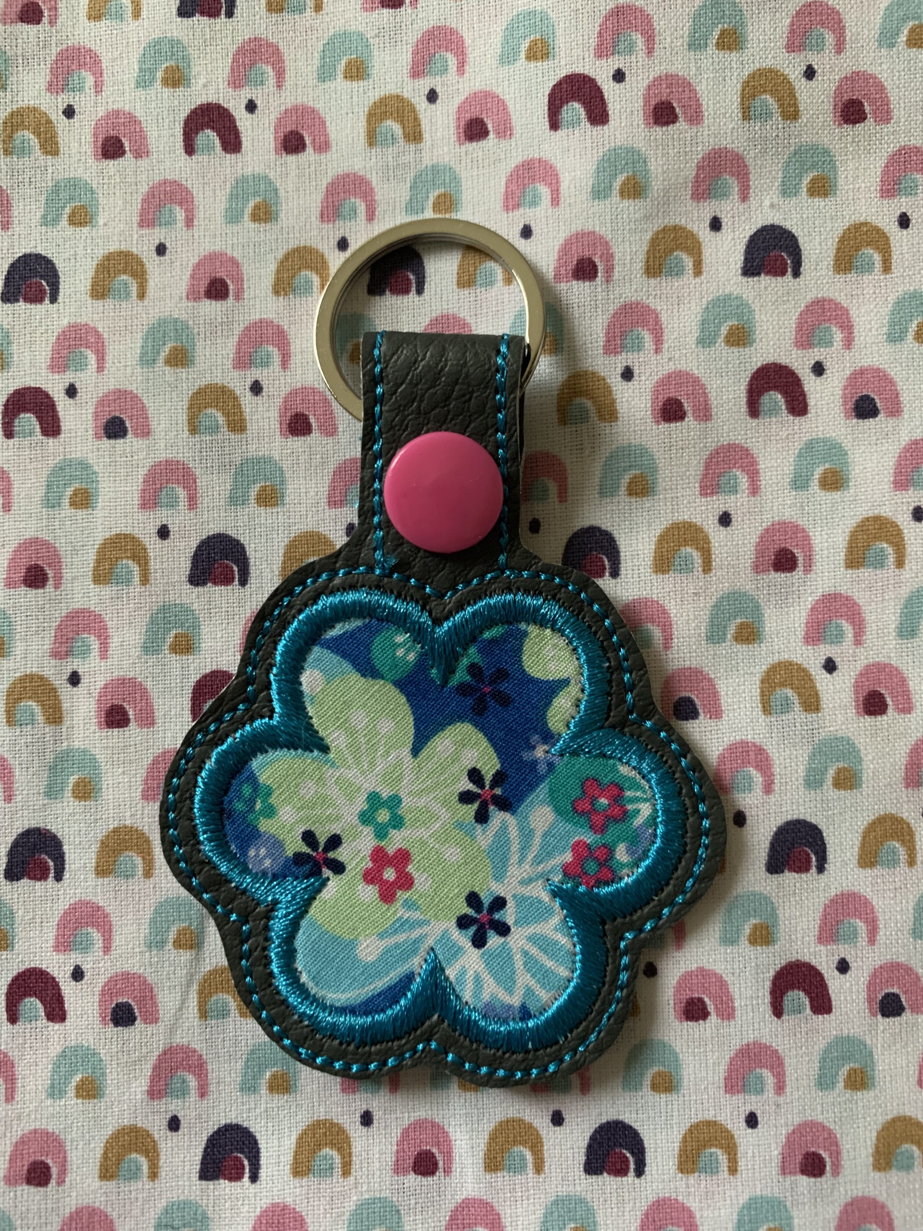 Porte clés fleur en appliqué coton, brodé sur simili cuir anthracite.