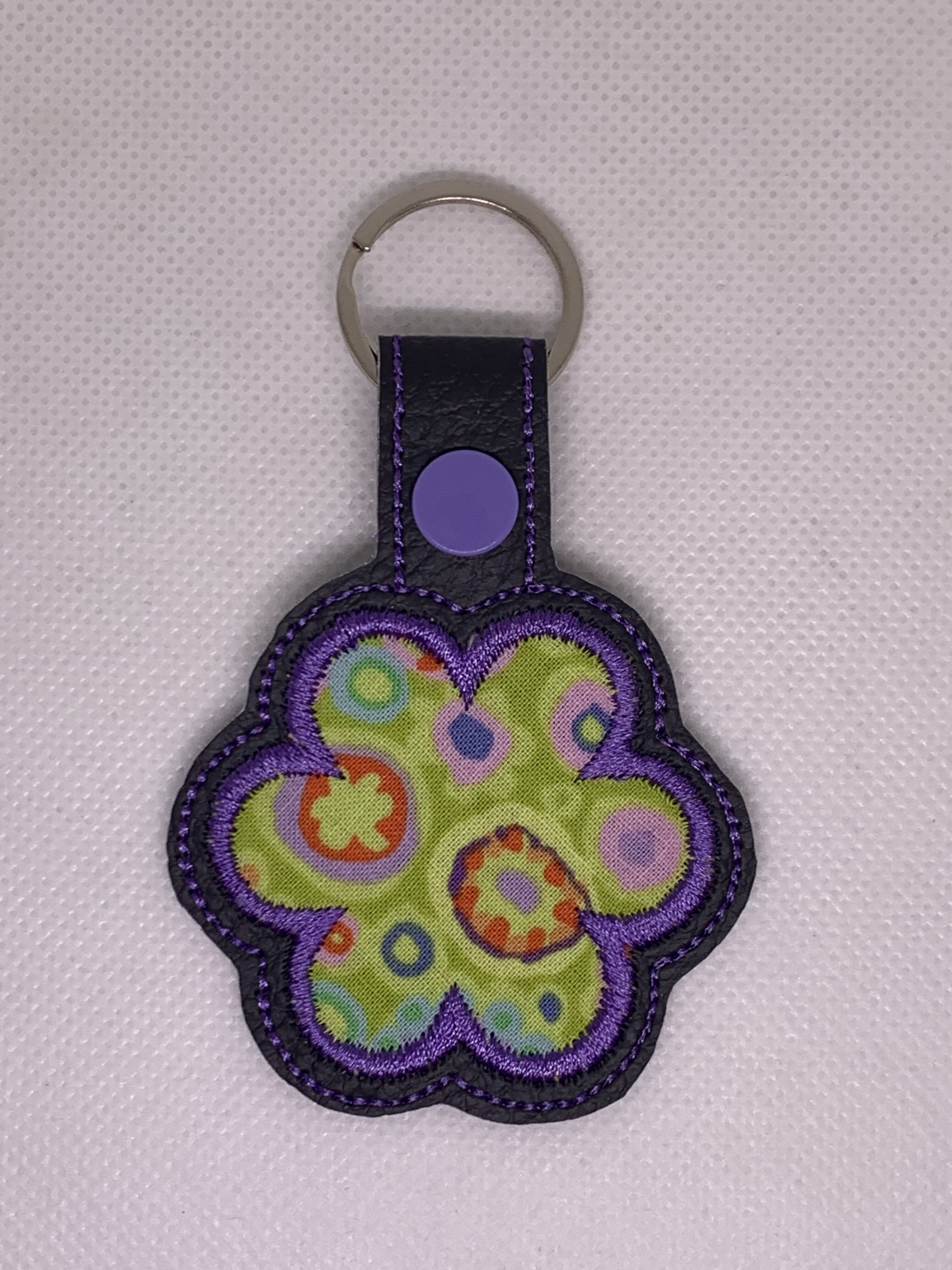 Porte clés fleur en appliqué coton, brodé sur simili cuir anthracite.