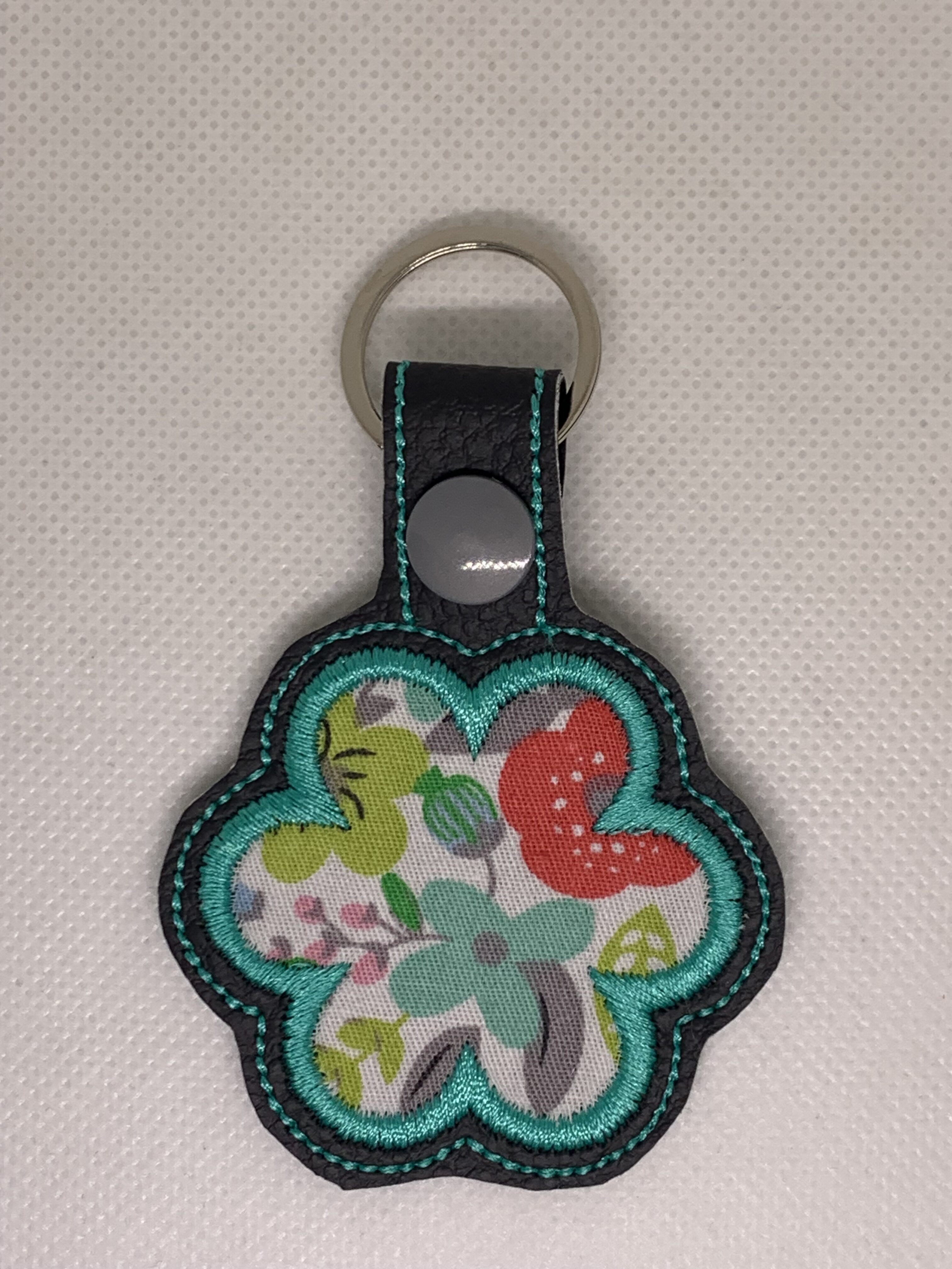 Porte clés fleur en appliqué coton, brodé sur simili cuir anthracite.