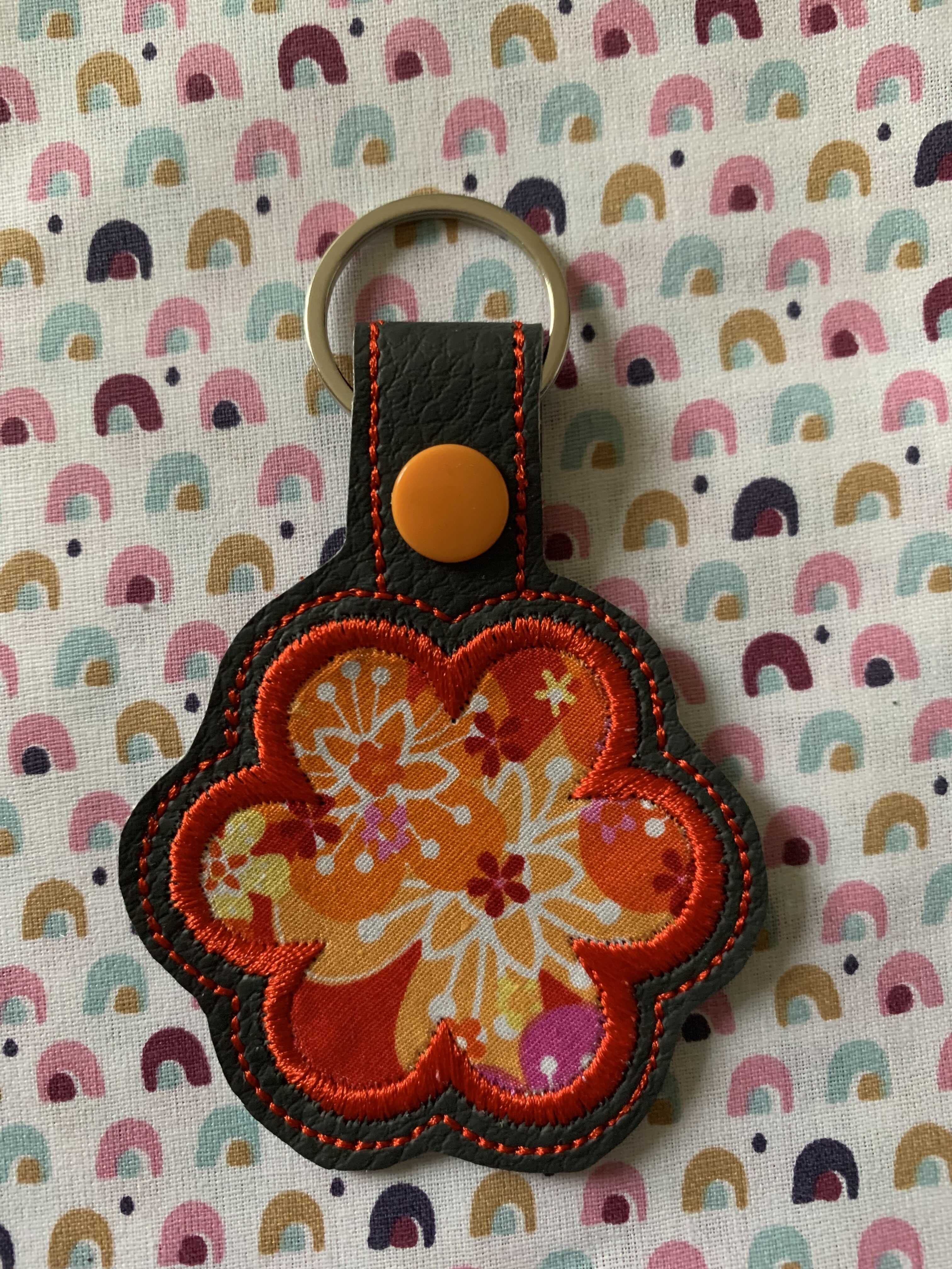Porte clés fleur en appliqué coton, brodé sur simili cuir anthracite.
