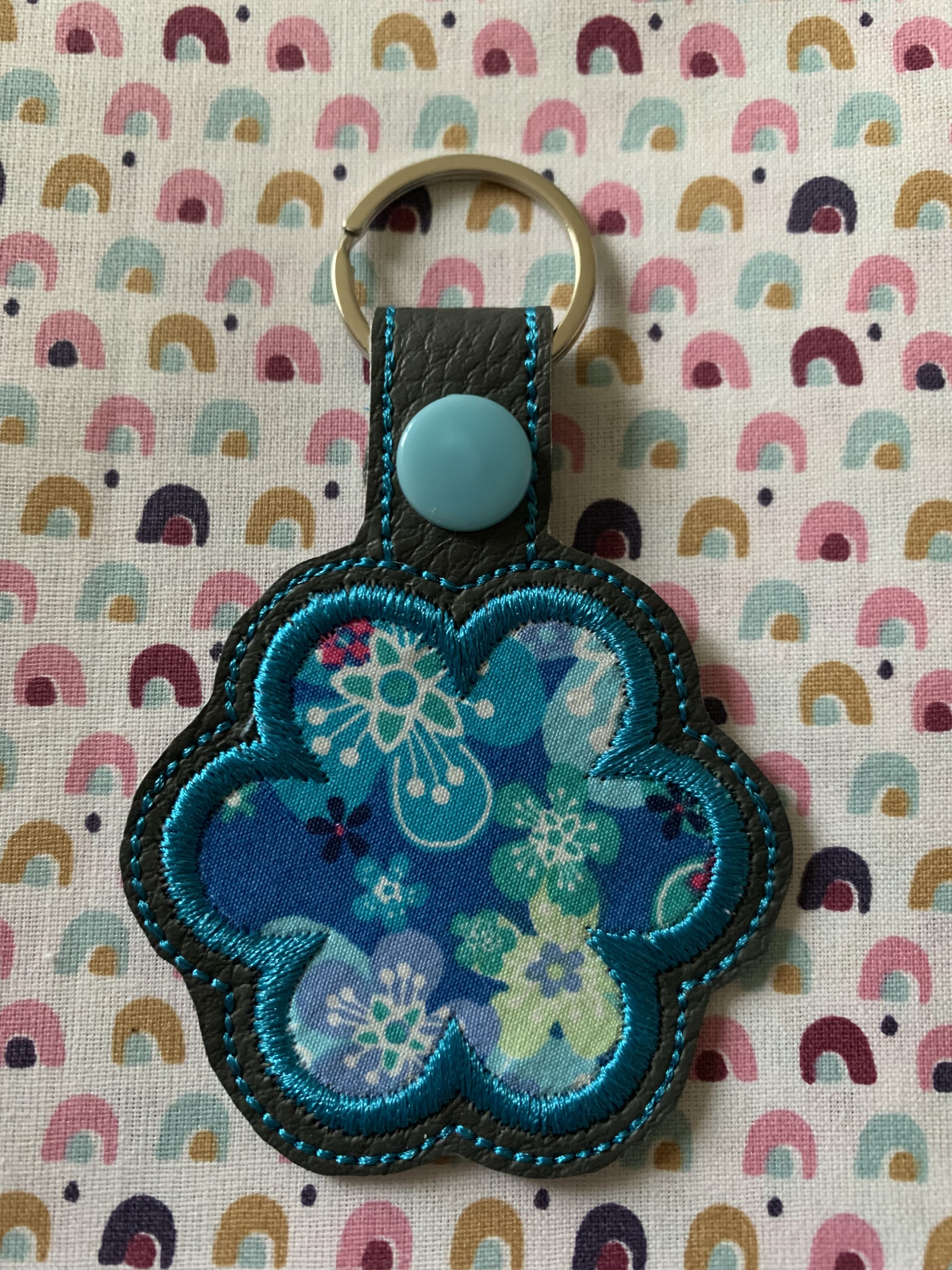 Porte clés fleur en appliqué coton, brodé sur simili cuir anthracite.