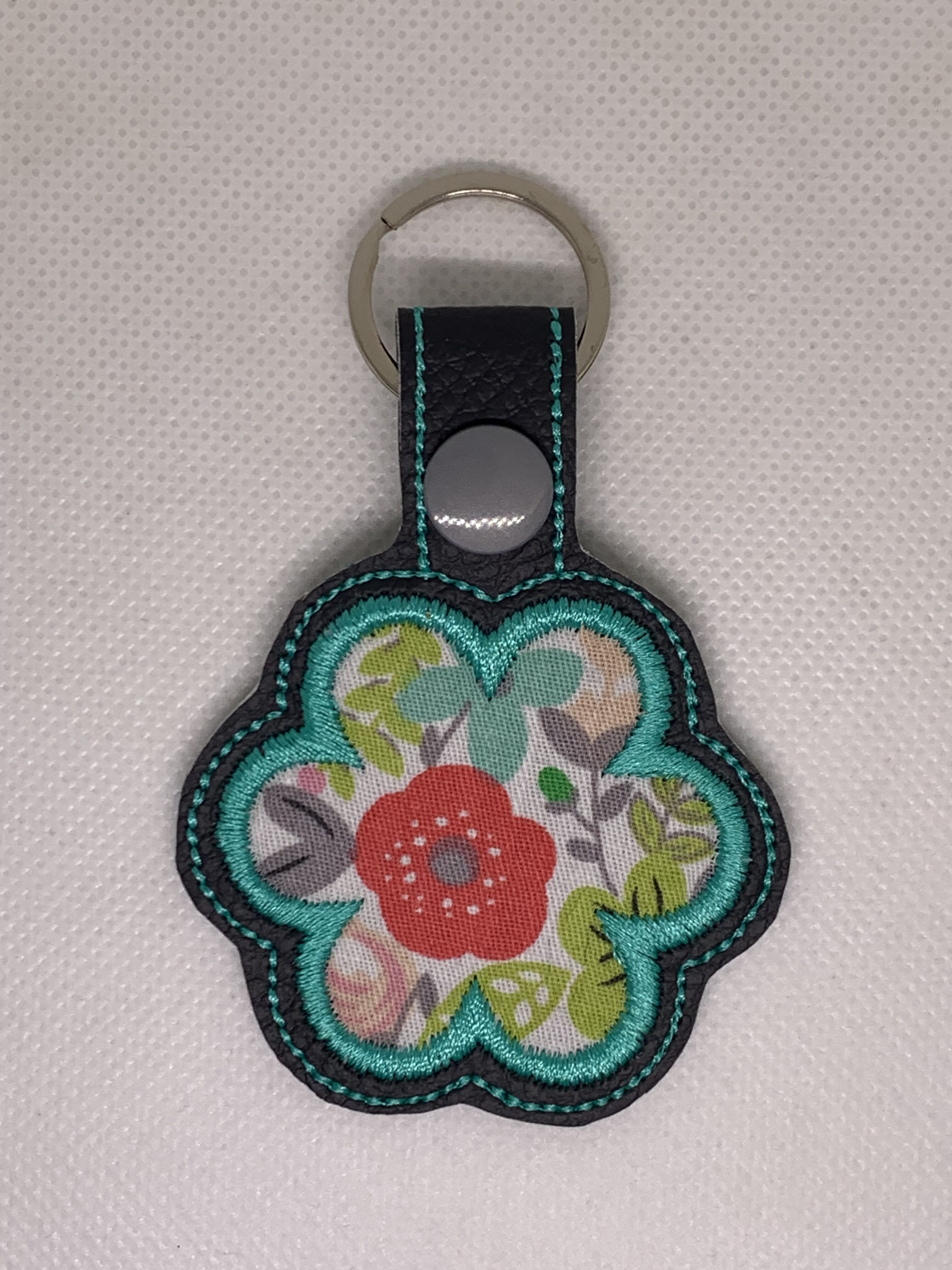 Porte clés fleur en appliqué coton, brodé sur simili cuir anthracite.