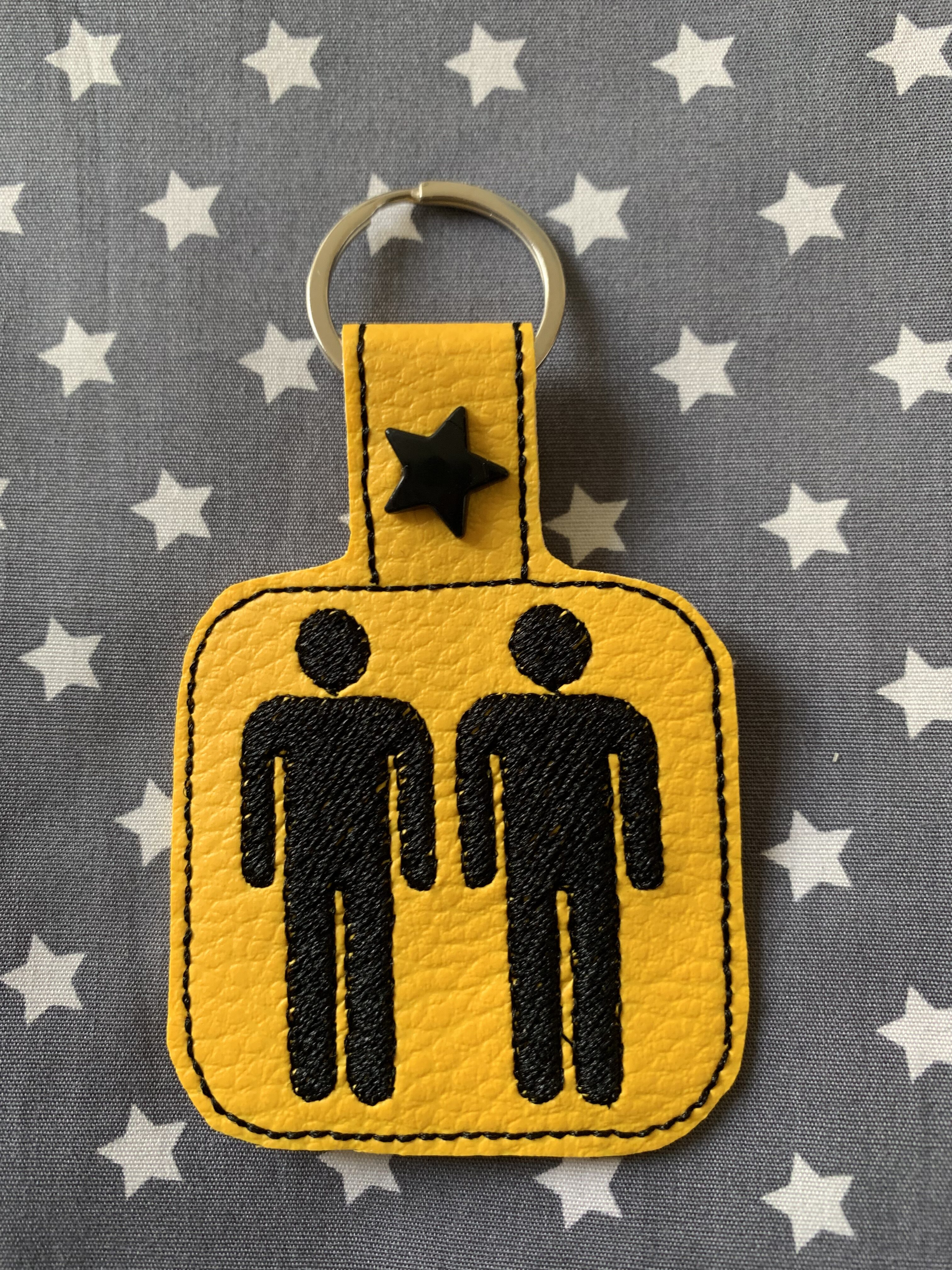 Porte clés Homme et Homme brodé sur simili cuir jaune.