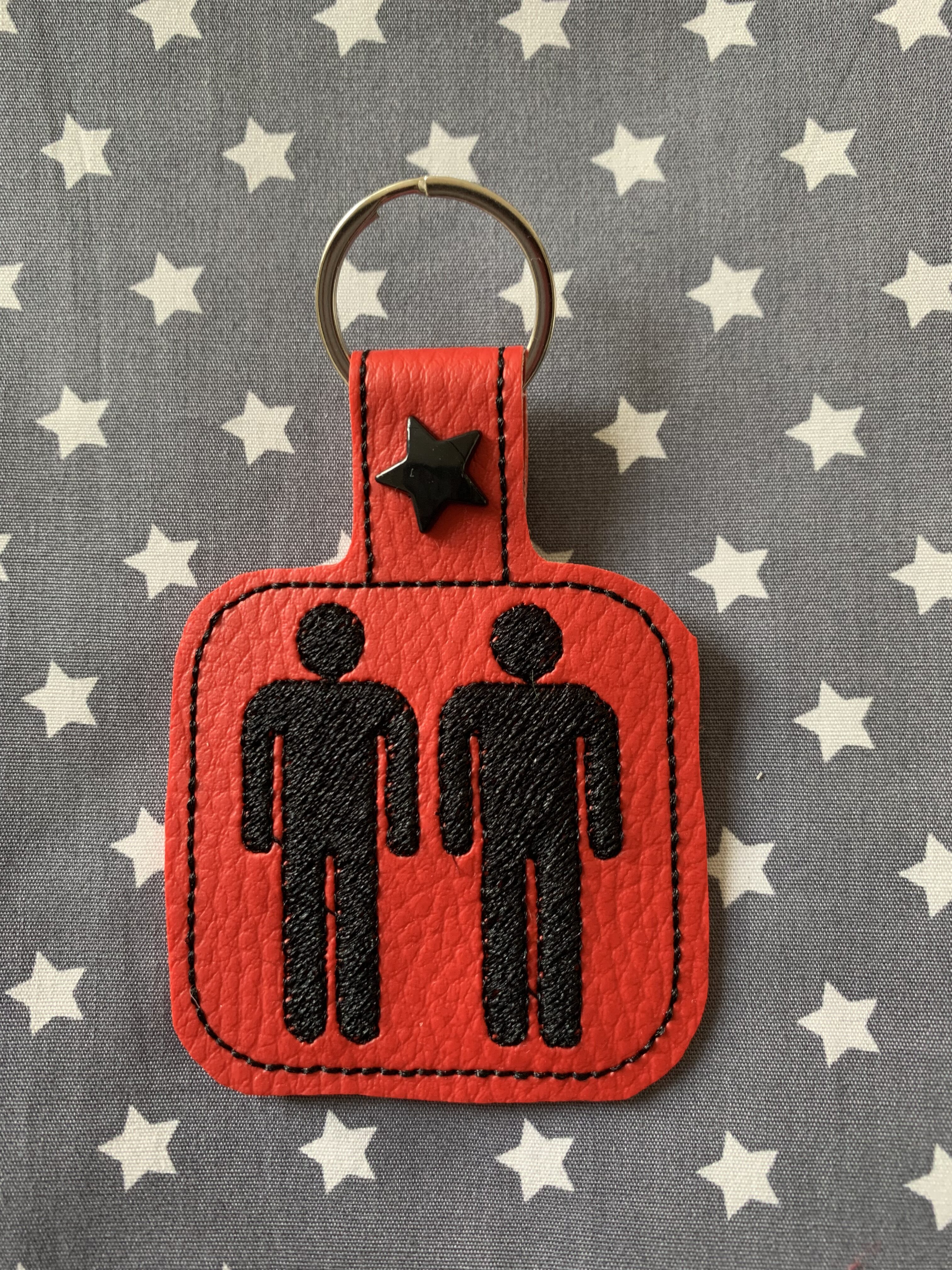 Porte clés Homme et Homme brodé sur simili cuir rouge.