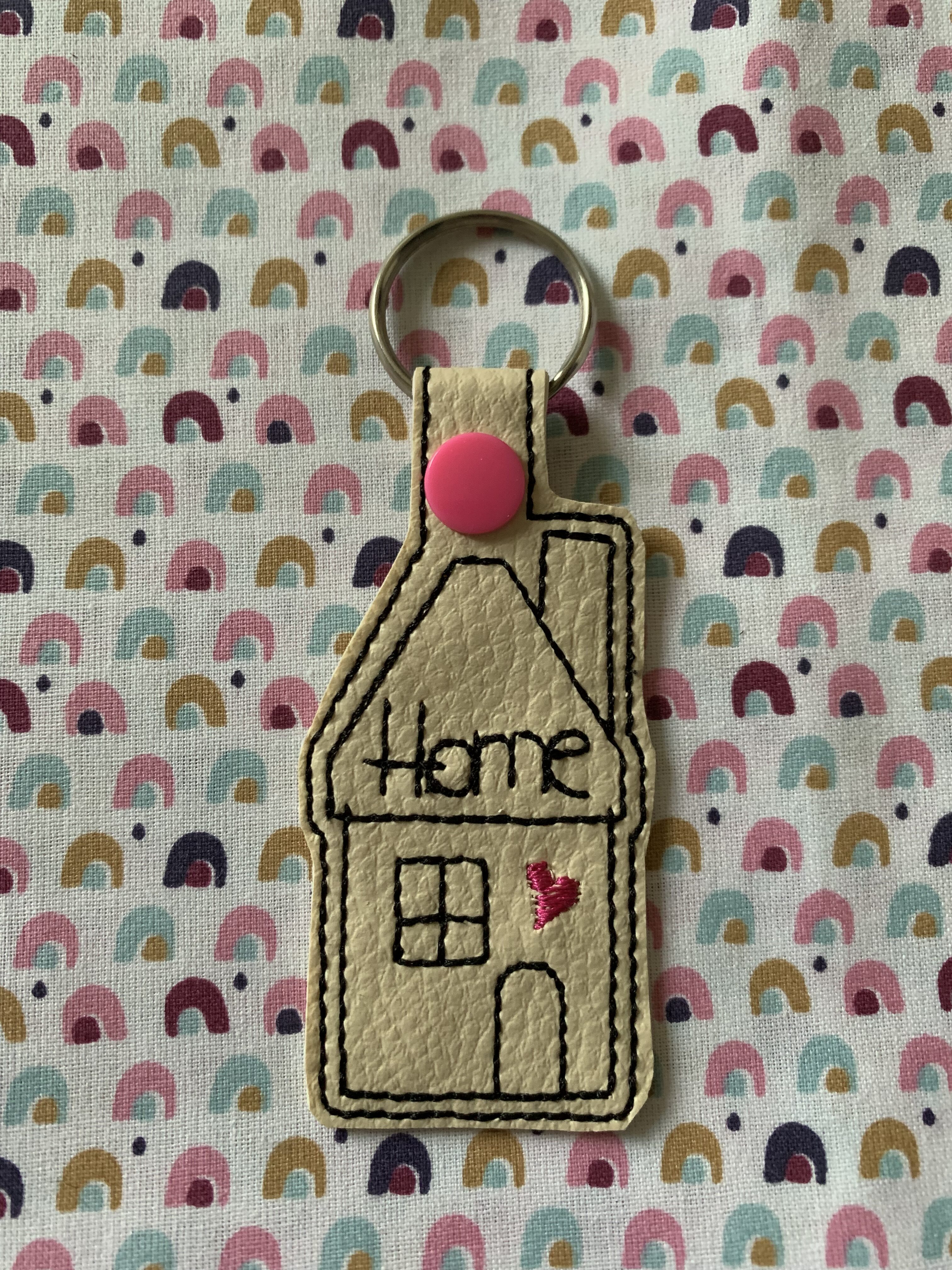 Porte clés maison brodé sur simili cuir beige.