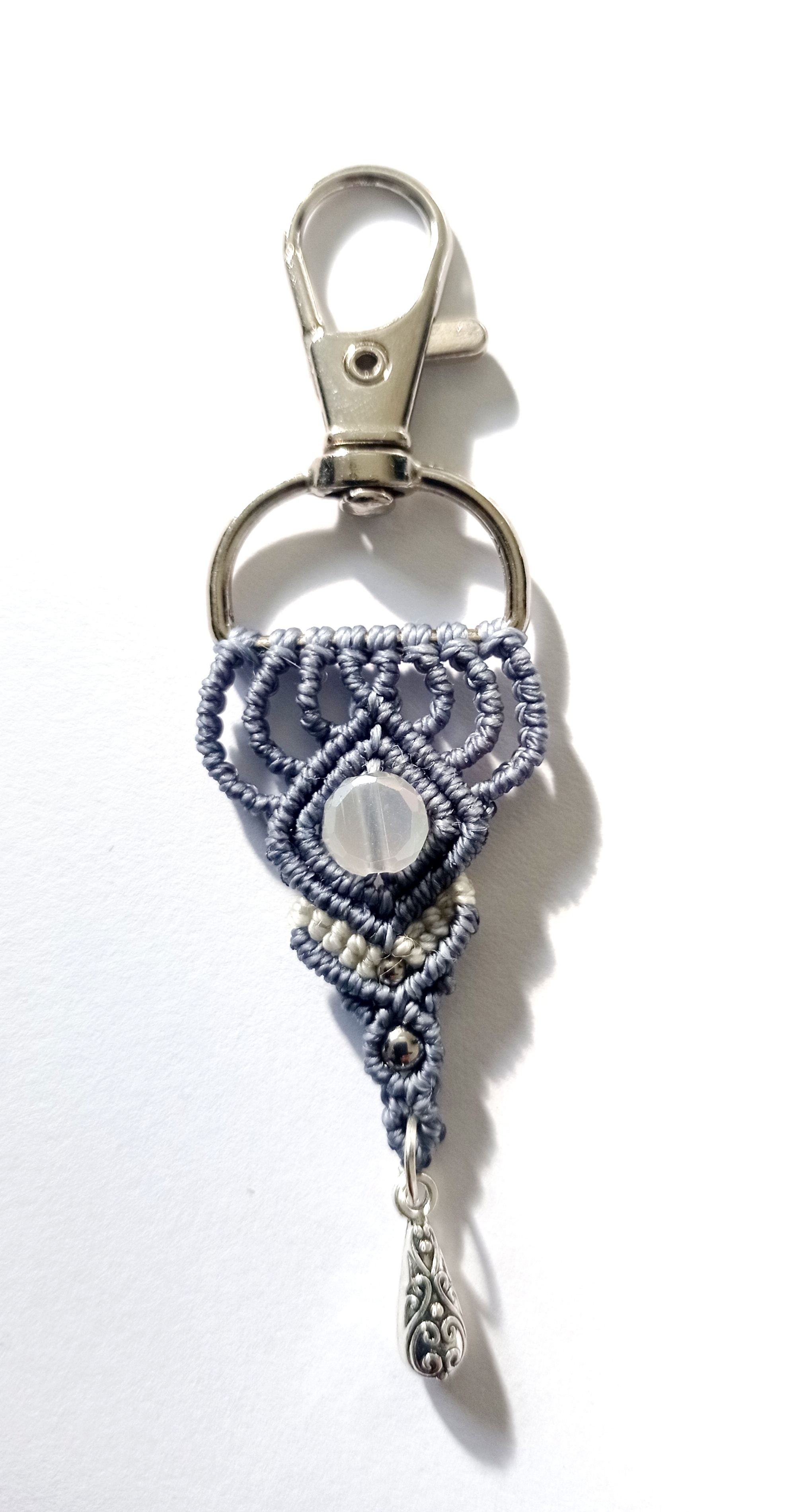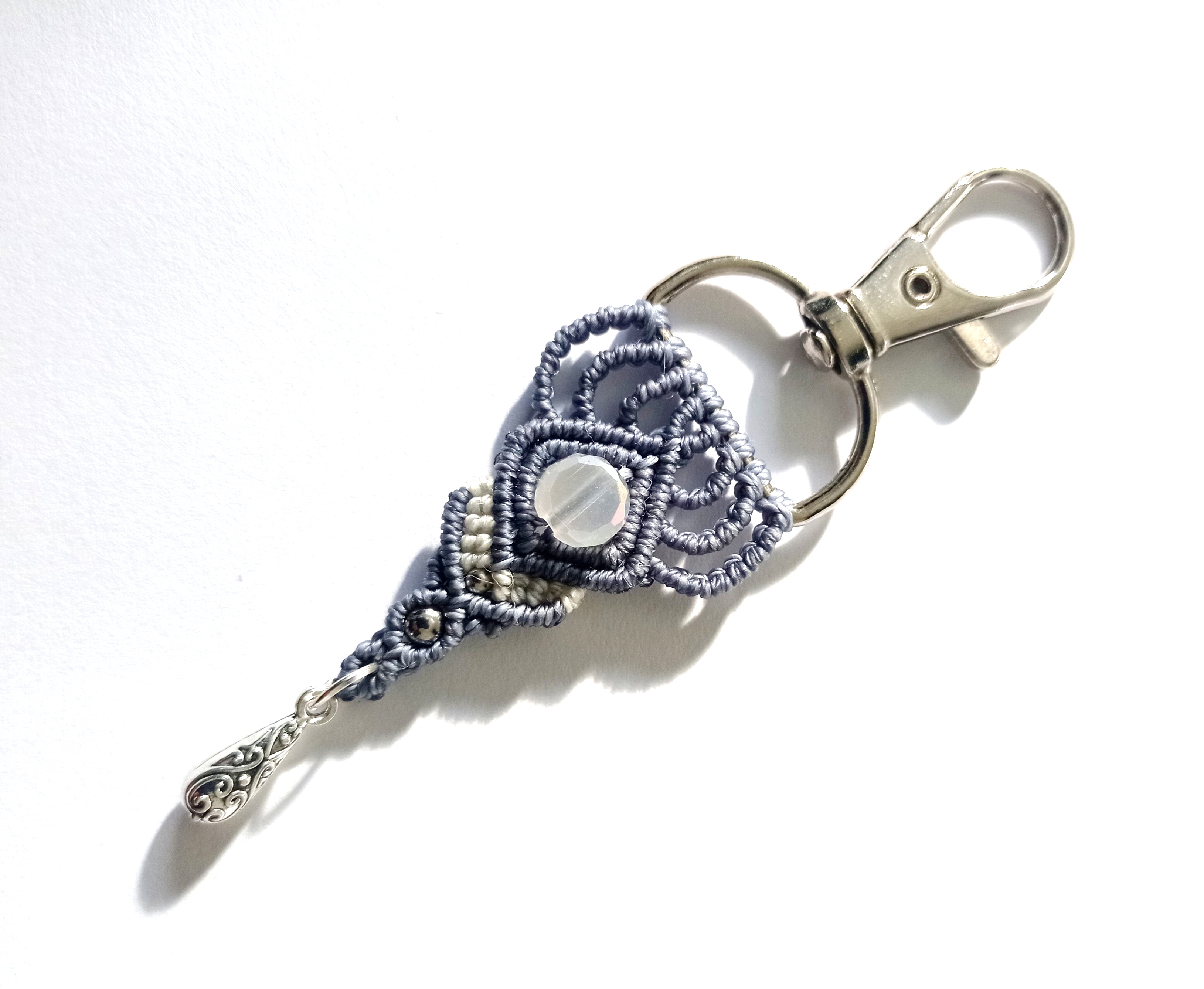 Porte clés ou bijou de sac réalisé en micro macramé.