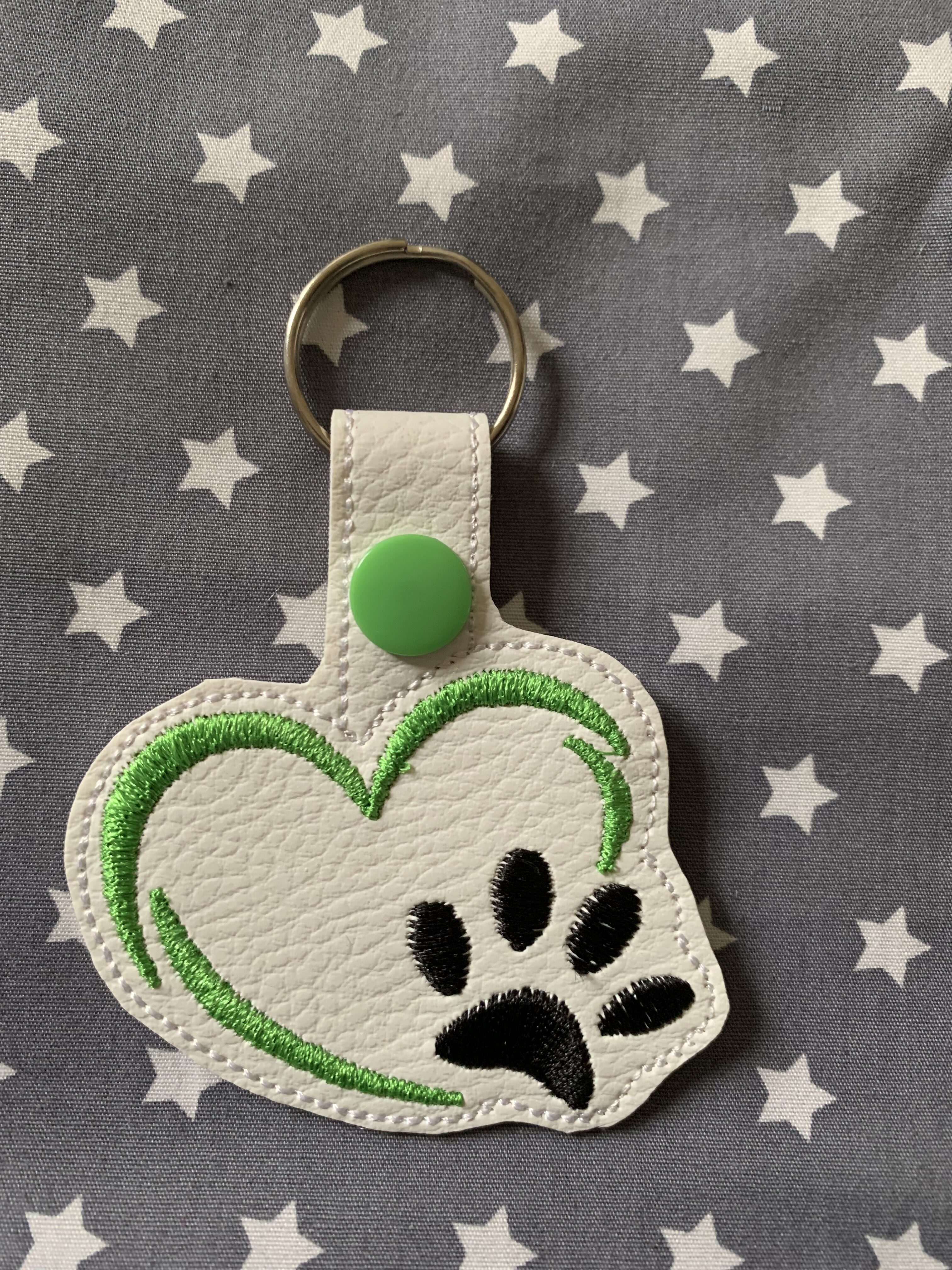Porte clés patte de chien et coeur brodé sur du simili cuir blanc.