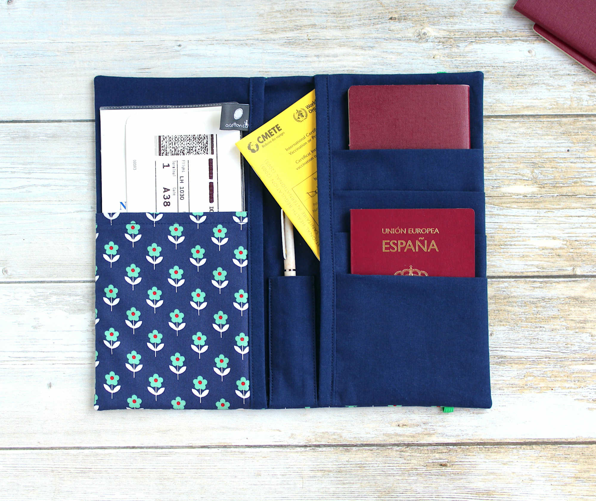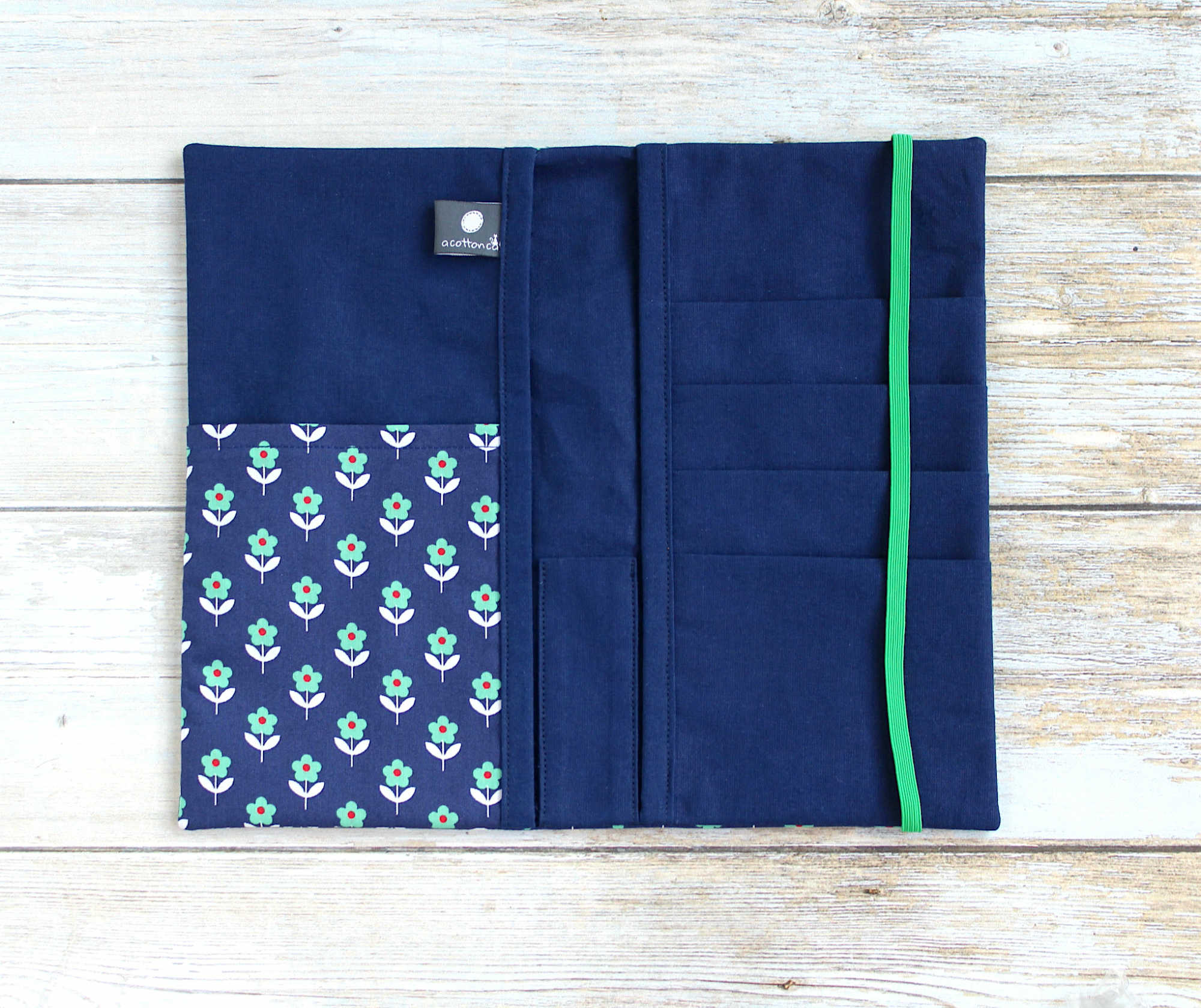 Housse confectionnée en coton à motifs fleurs sur fond bleu foncé et renforcée pour plus de tenue. Elle est dotée de 7 poches de rangement pour documents plus 1 poche pour glisser un stylo. L’étui se ferme avec une bande élastique verte.