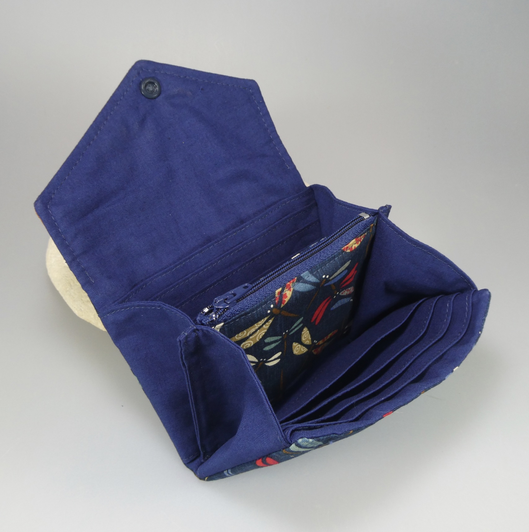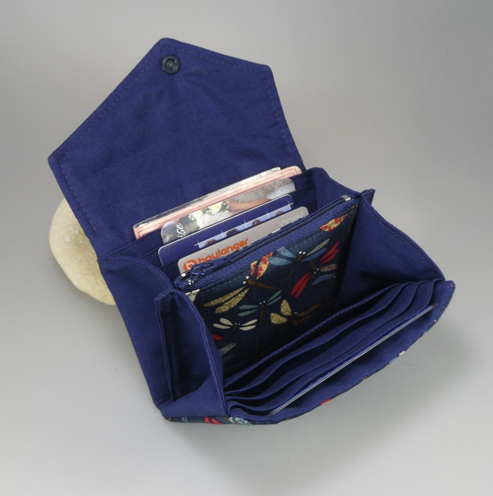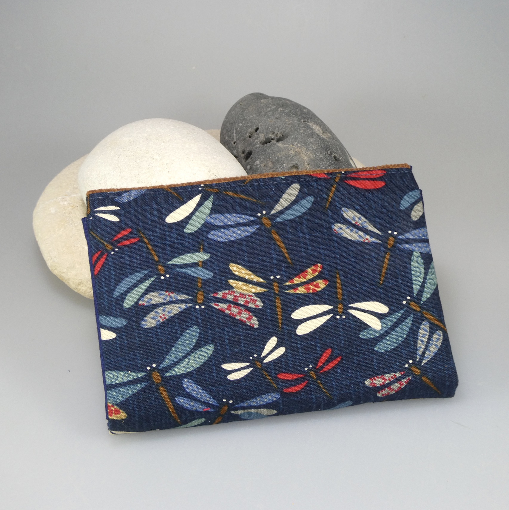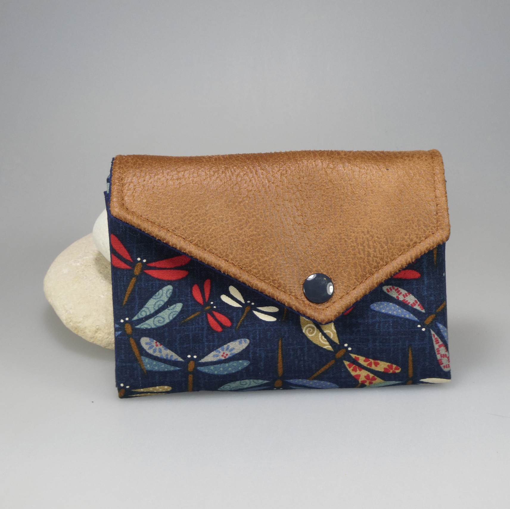 porte-monnaie pratique et stylé, mixant simili cuir marron et coton japonais. Confectionné avec soin avec un coton japonais bleu avec motif de libellules multicolores pour l’extérieur et un coton bleu uni pour l’intérieur. Il est doublé de molleton ce qui garantit une