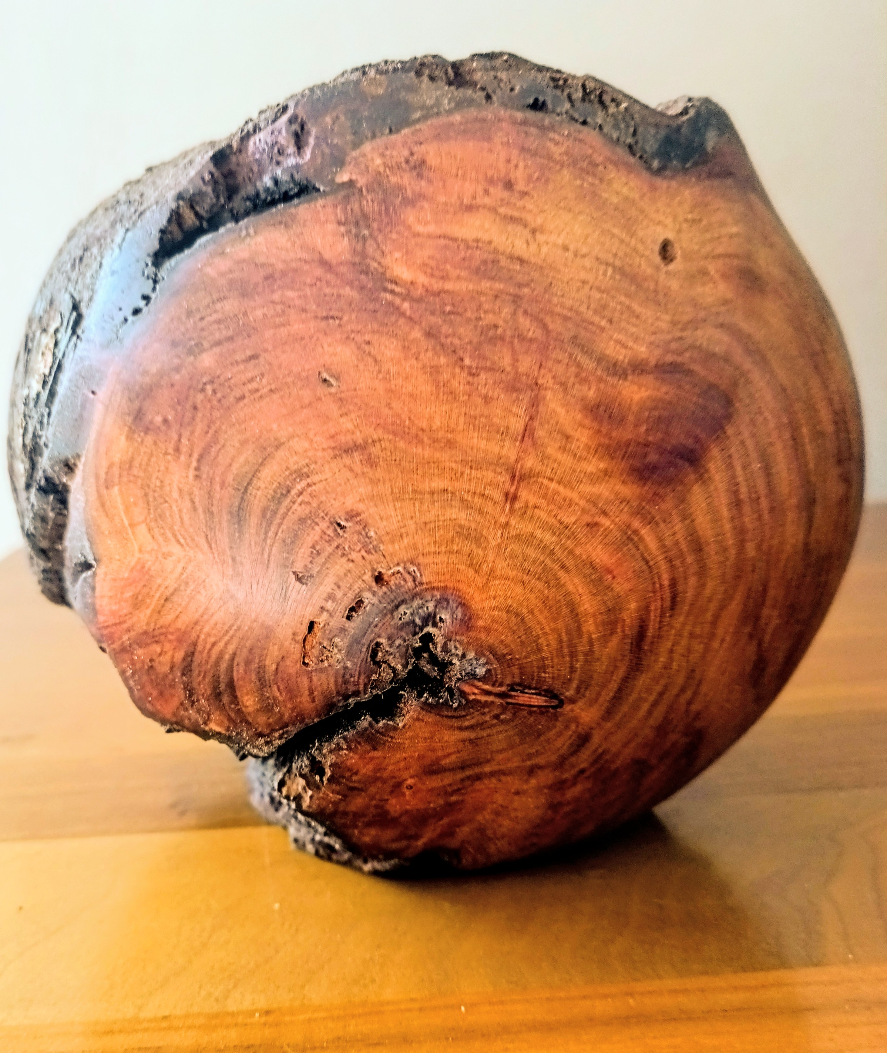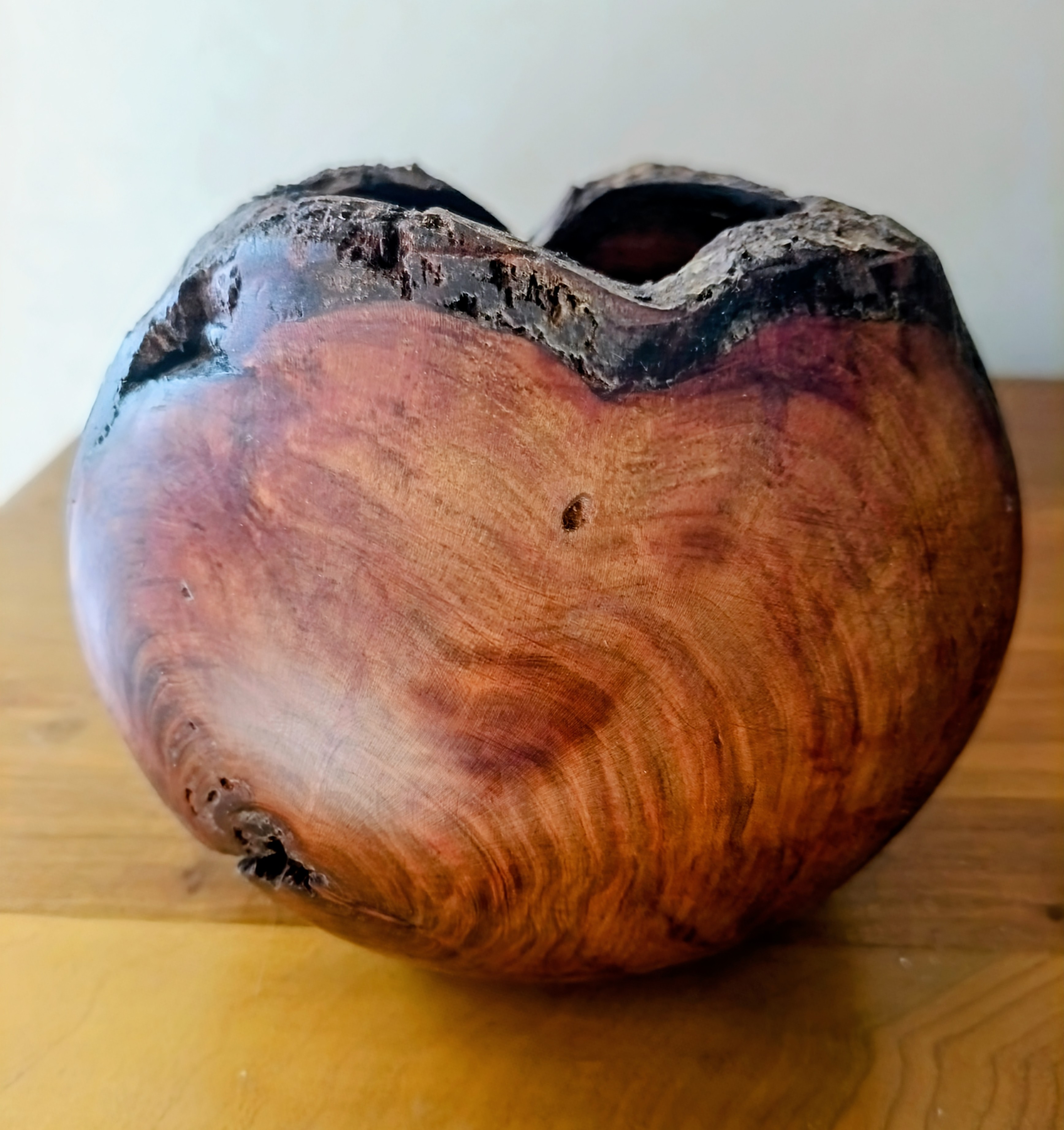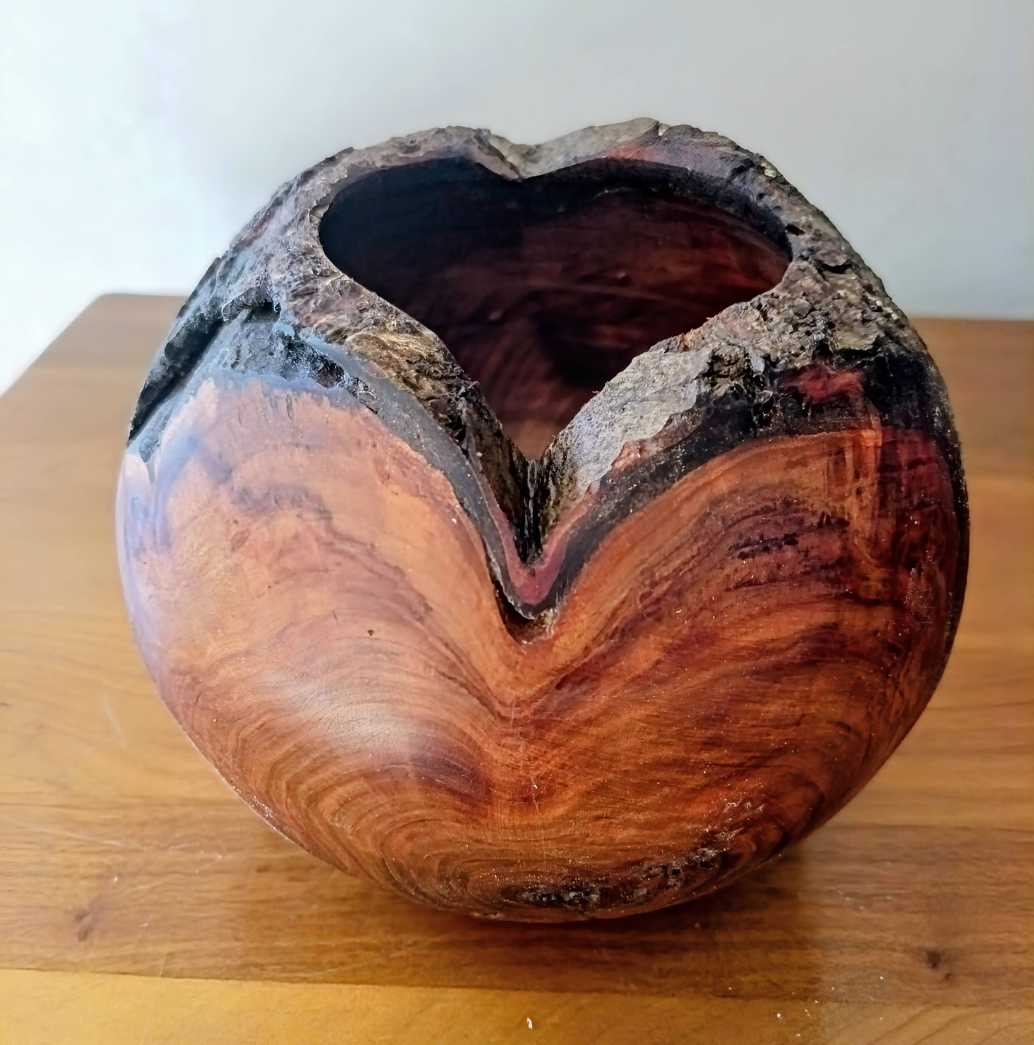 Pièce en prunier aux bord naturels, tourné z contre fil veinage original,finition cire.